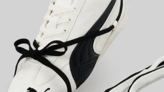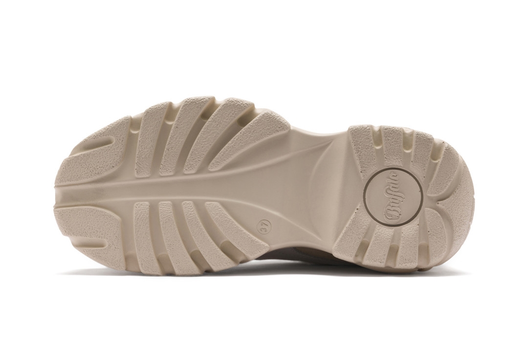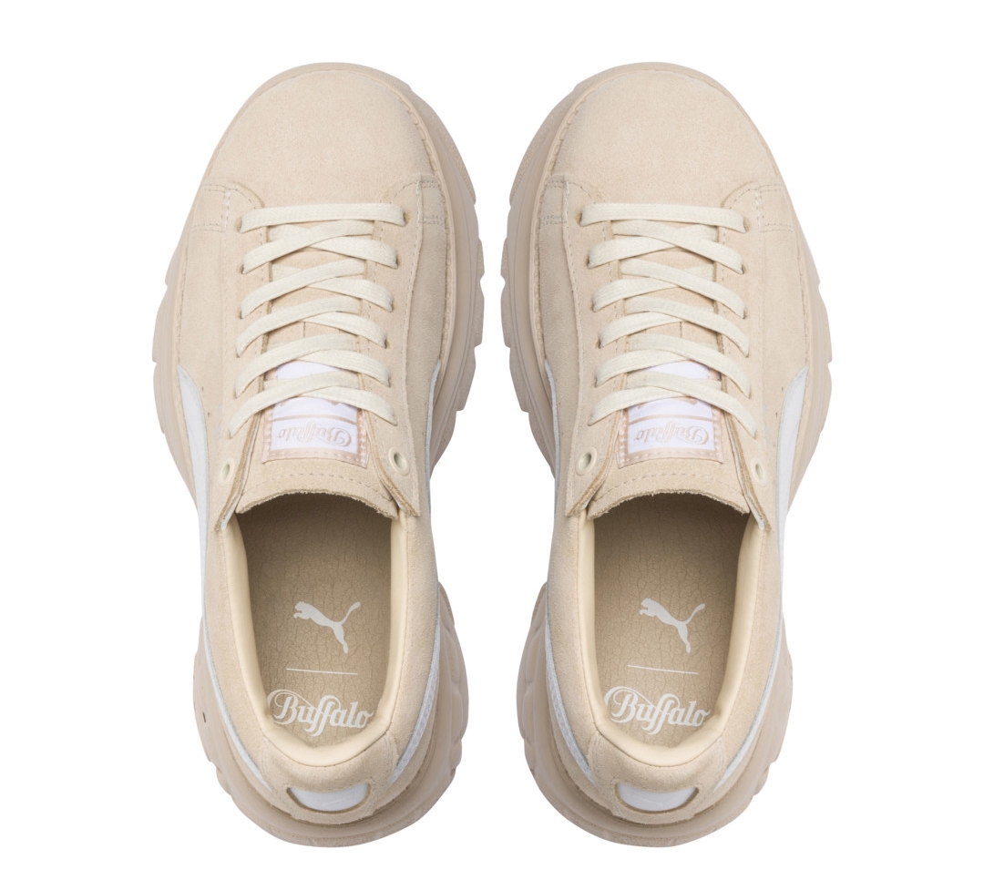 Buffalo Londonの特徴である大胆なチャンキーソールに、クリーンでシンプルなプレミアムトーナルのスウェードアッパーと、プーマのフォームストライプがレザーで施されています。