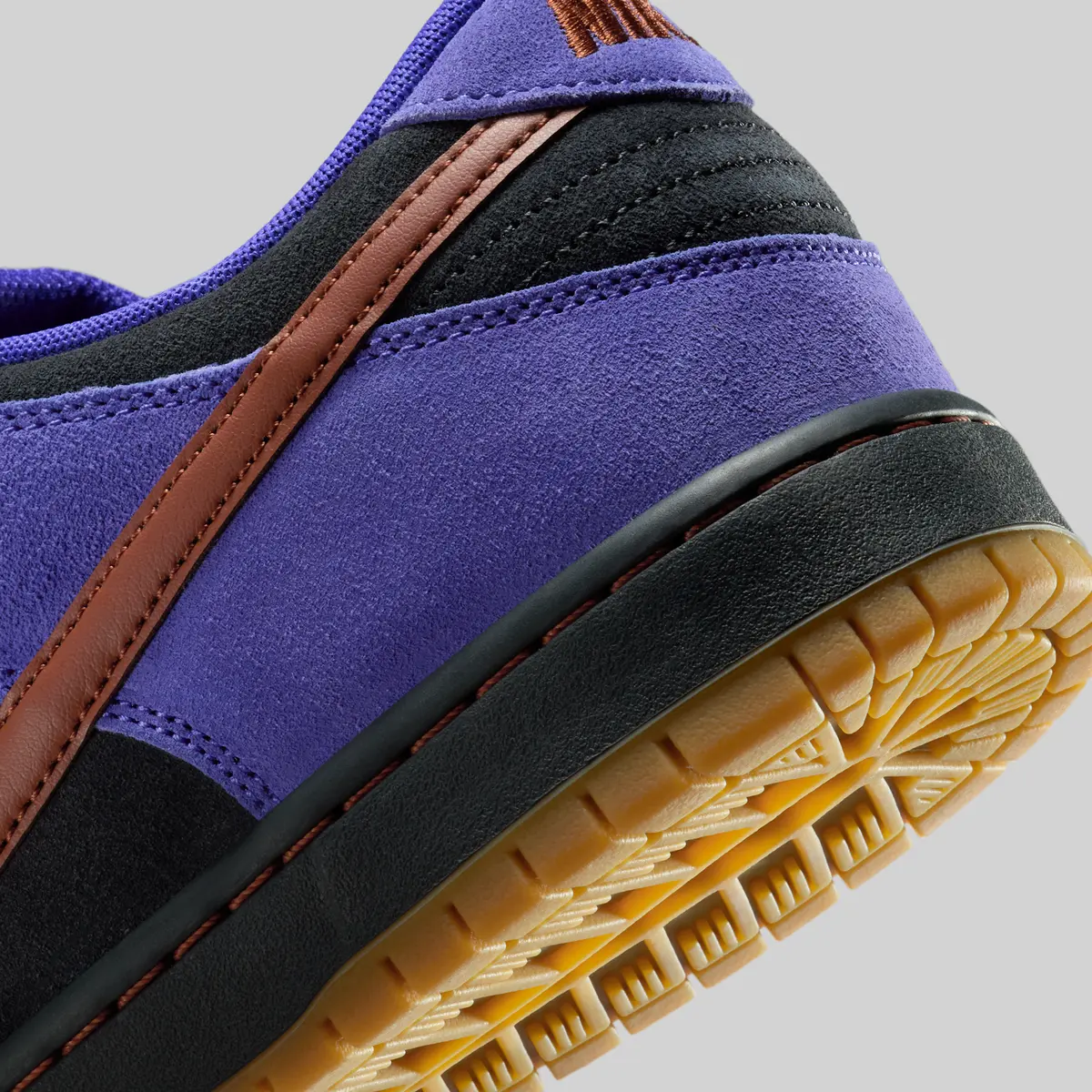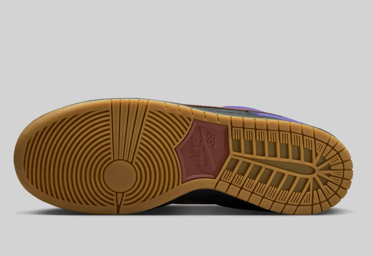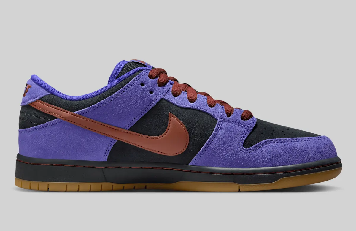 このモデルの最大の魅力はそのカラーコンビネーションです。ベースには高級感のあるブラックスエードを採用し落ち着いたトーンを演出しながらも補強パーツには印象的なペルシアンバイオレットのスエードを配置。深みのある紫がスニーカー全体に個性的なアクセントを加えています。さらにサイドのスウッシュやシューレースにはシナモンのような温かみのあるレッドオレンジを採用しクールなパープルとのコントラストが美しく際立ちます。ソール部分にはガムを取り入れ、クラシックなSB ダンクらしいビンテージ感をプラス。ストリートとレトロの要素が絶妙に調和したカラーリングとなっています