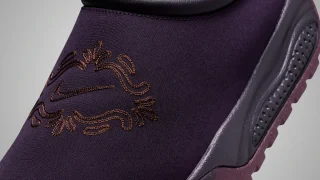 モックアップでは地元の自然や文化にインスパイアされたディテールが随所に見られます。特に、つま先からヒールにかけてあしらわれたフェイクスネークスキン風のパネルは、アリゾナの砂漠に生息するガラガラヘビを彷彿とさせ彼のバックグラウンドと強い結びつきを感じさせる要素として描かれています。アッパーはブラックのスエードで構成されており、重厚な印象を与える一方で淡いベージュに近いストリングカラーのスネークスキン調素材が存在感を際立たせます。この異素材の組み合わせが荒々しさと洗練さを同時に演出しています。さらに、スウッシュやヒールタブには鮮やかなフィアースパープルが使用され全体のカラーに鮮烈なアクセントを加えています。ソールはマットなブラックで仕上げられ全体の色調を引き締めています。ダークラセット」やブライトスプルースといった配色も含まれており、細部に多層的なカラーの魅力が想定されています。