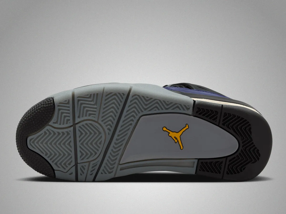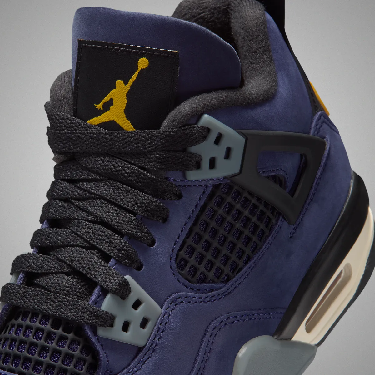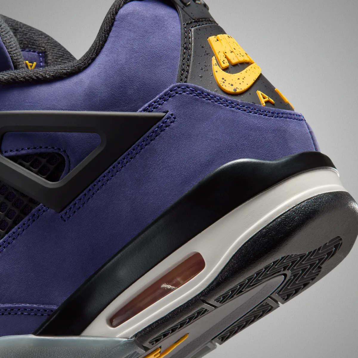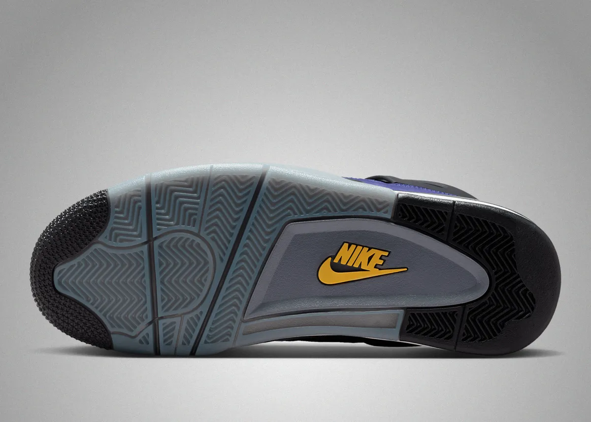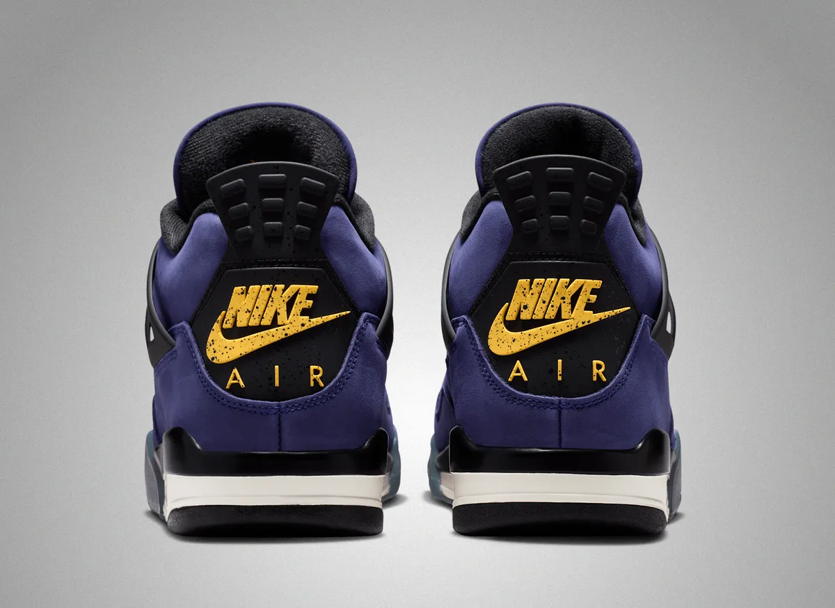本作の特徴は、アイコニックなエア ジョーンダ 4のシルエットに、2026年NBAオールスターゲームが行われるロサンゼルスに拠点を置くレイカーズを彷彿とさせる鮮やかなカラーリングを大胆に落とし込んでいる点です。アッパーには深みのある“インペリアルパープル”のヌバック素材を採用しラグジュアリーかつ力強い存在感を演出しています。シュータンのジャンプマンロゴやヒールタブの“Air”ブランディングにはビビッドなイエローを配色しレイカーズの伝統的なカラーコンビネーションを強調しています。