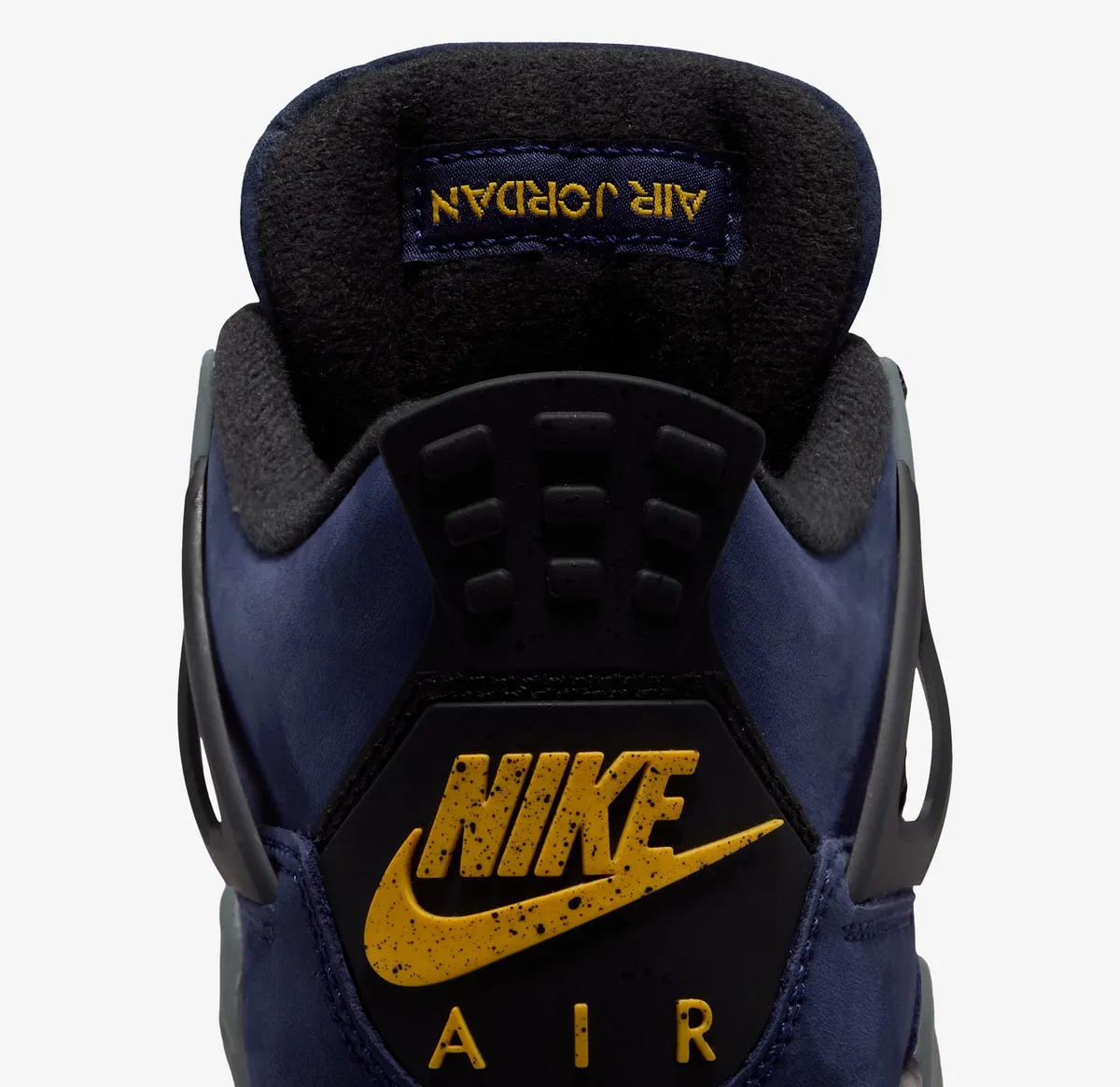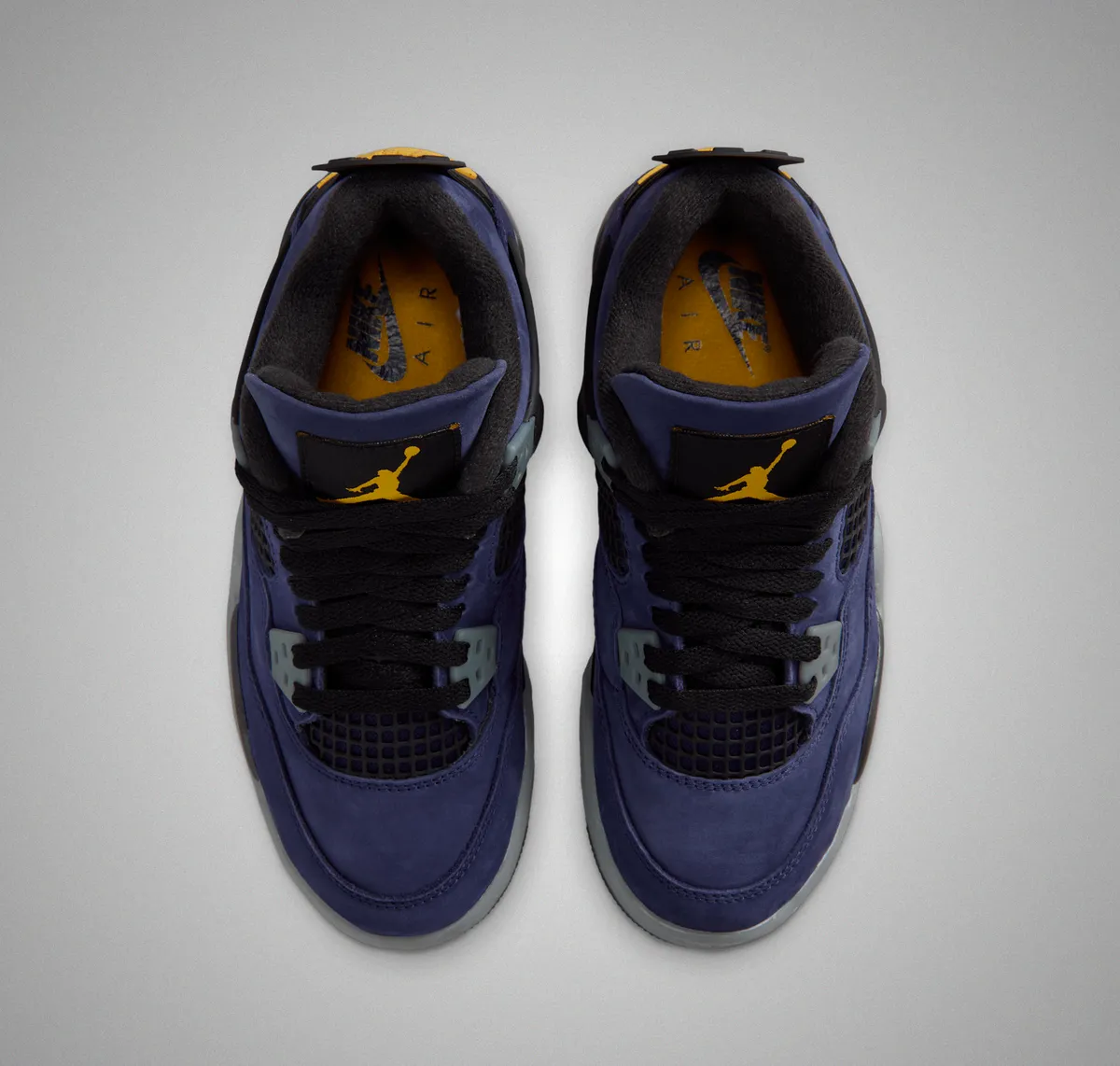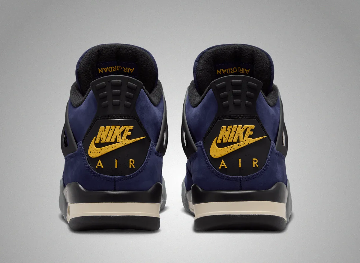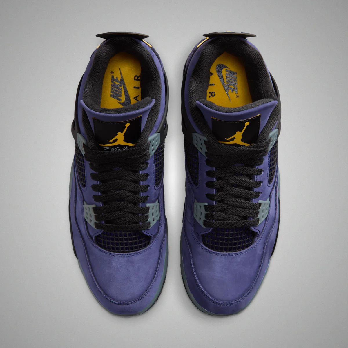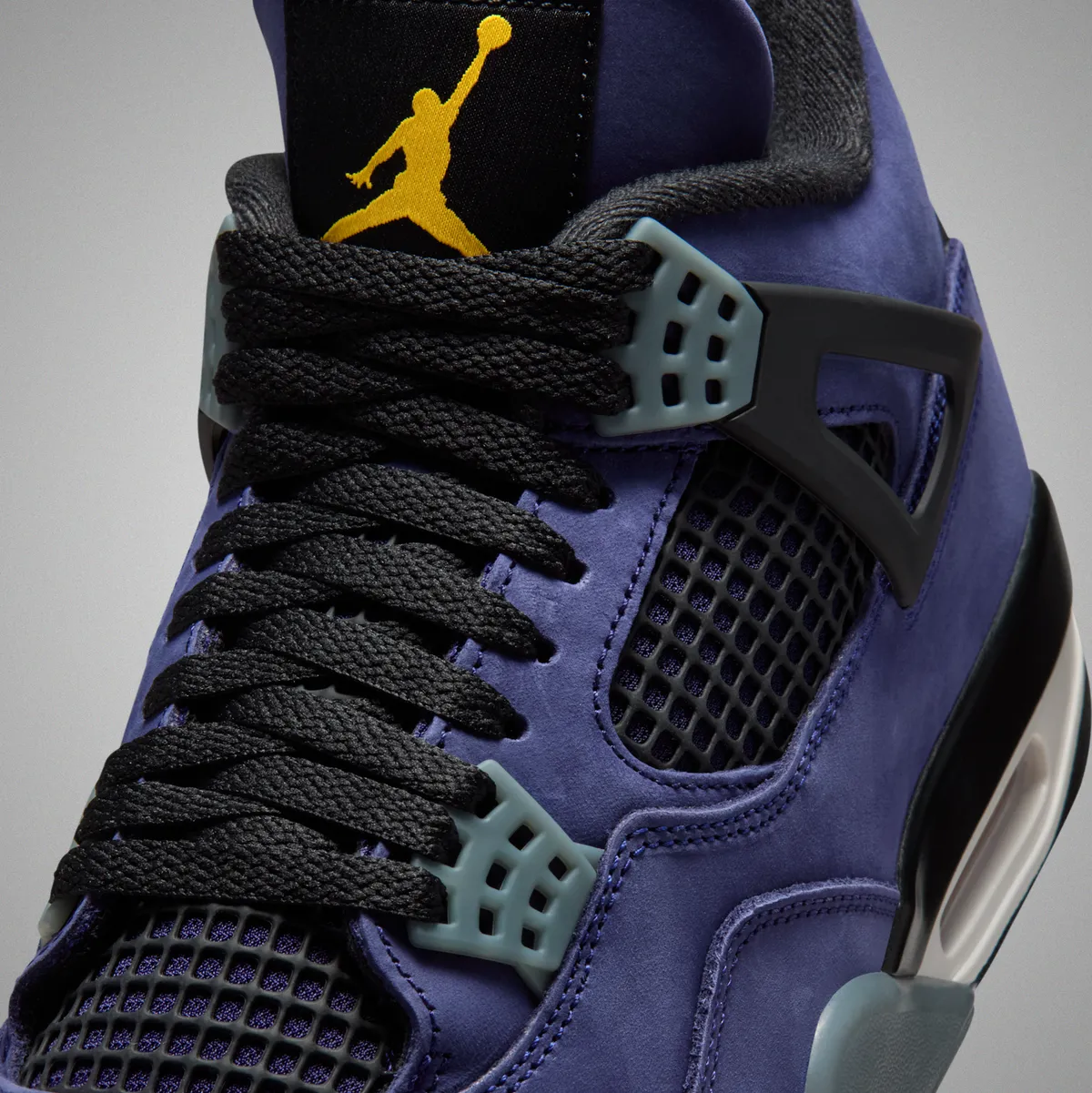 本作の特徴は、アイコニックなエア ジョーンダ 4のシルエットに、2026年NBAオールスターゲームが行われるロサンゼルスに拠点を置くレイカーズを彷彿とさせる鮮やかなカラーリングを大胆に落とし込んでいる点です。アッパーには深みのある“インペリアルパープル”のヌバック素材を採用しラグジュアリーかつ力強い存在感を演出しています。シュータンのジャンプマンロゴやヒールタブの“Air”ブランディングにはビビッドなイエローを配色しレイカーズの伝統的なカラーコンビネーションを強調しています。
