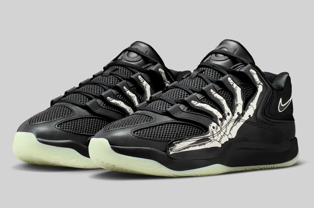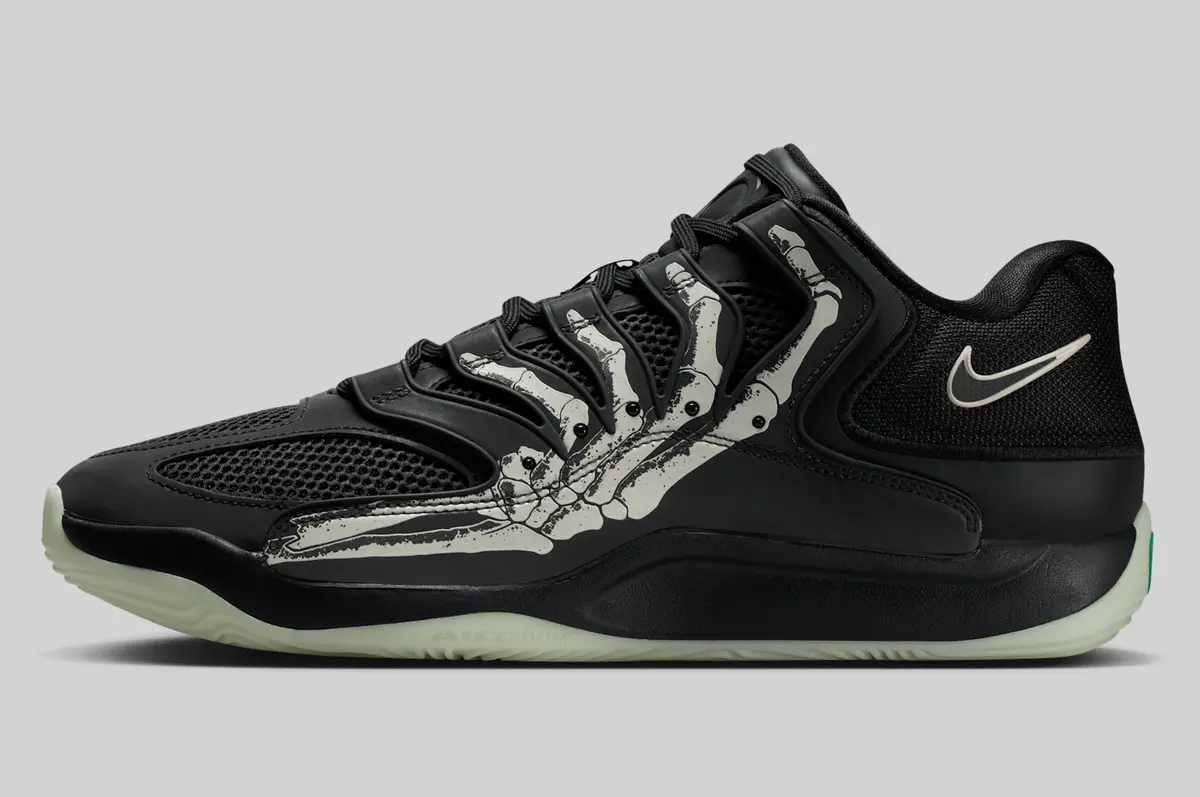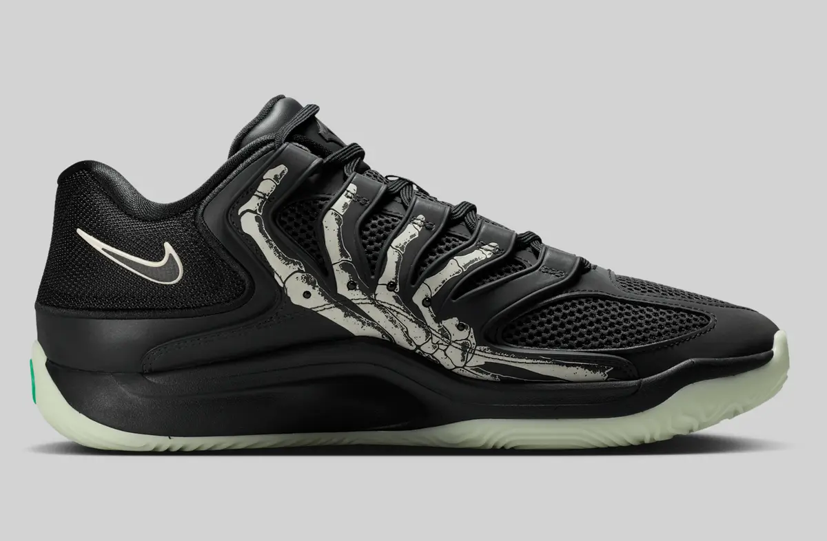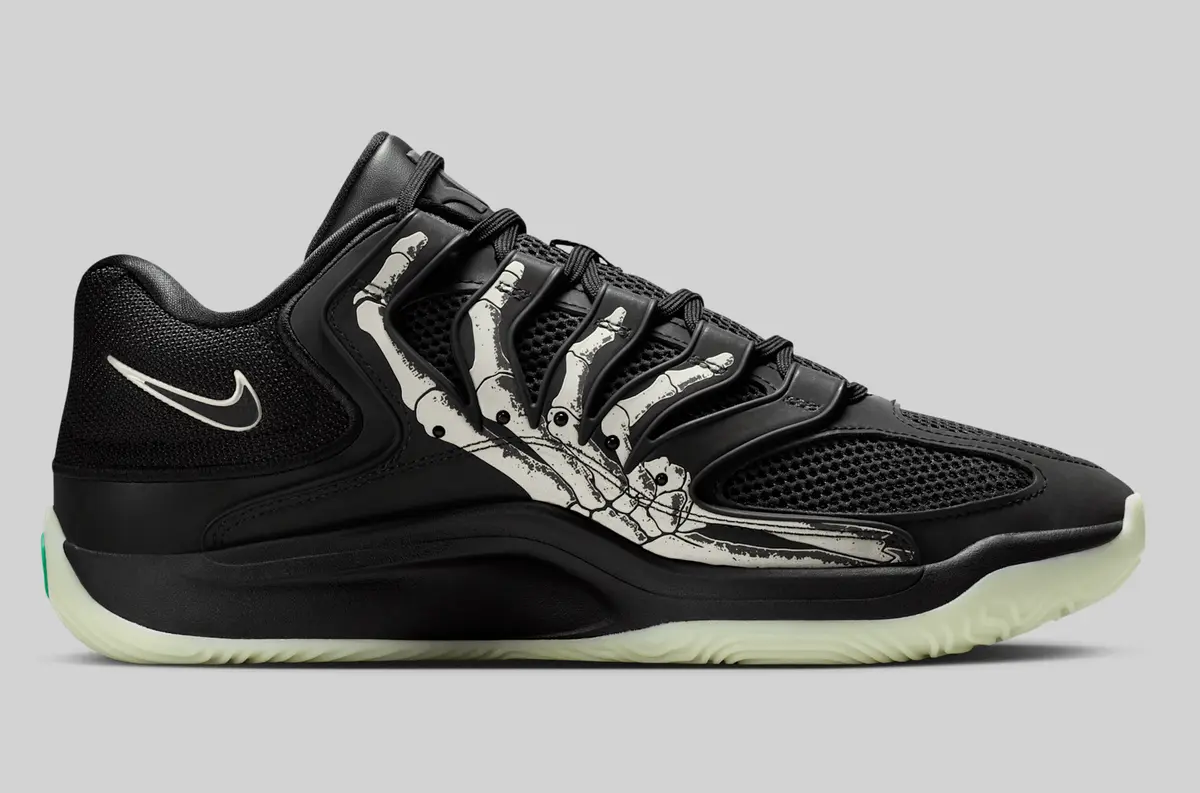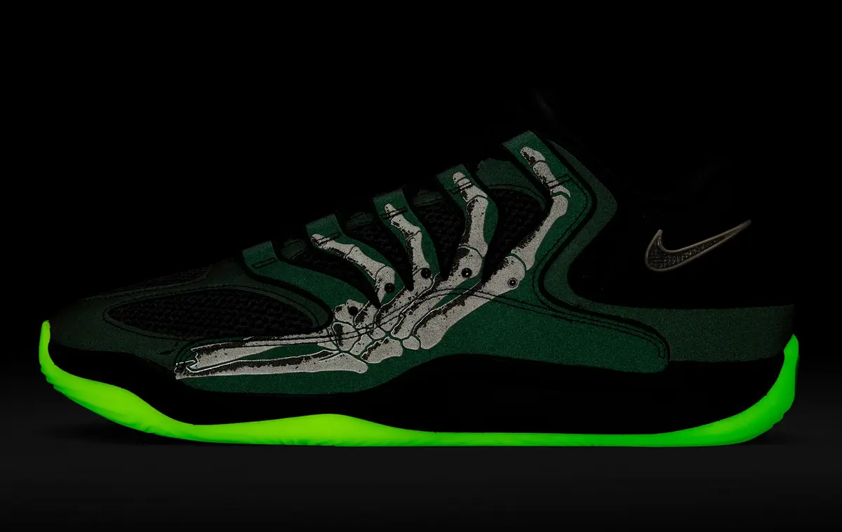 この骨のグラフィックはかつての「スケルトン」シリーズのエア フォース1を想起させる要素でありながらKDシリーズらしい攻撃的かつ洗練されたバスケットボール仕様に仕上がっています。ヒールには淡いホワイトで描かれたスウッシュが控えめに配置されシューズ全体のトーンと絶妙なコントラストを生み出しています。またアウトソールはやや黄緑がかった半透明の仕様で暗闇での光り方が期待される蓄光ディテールもさりげなく盛り込まれています。
