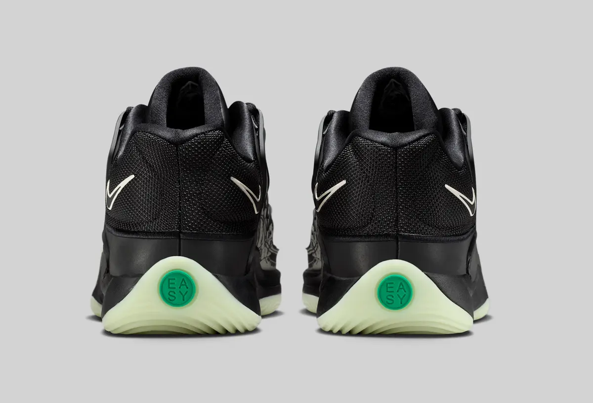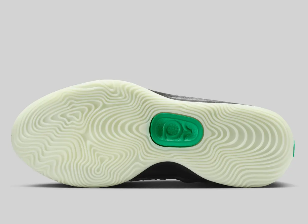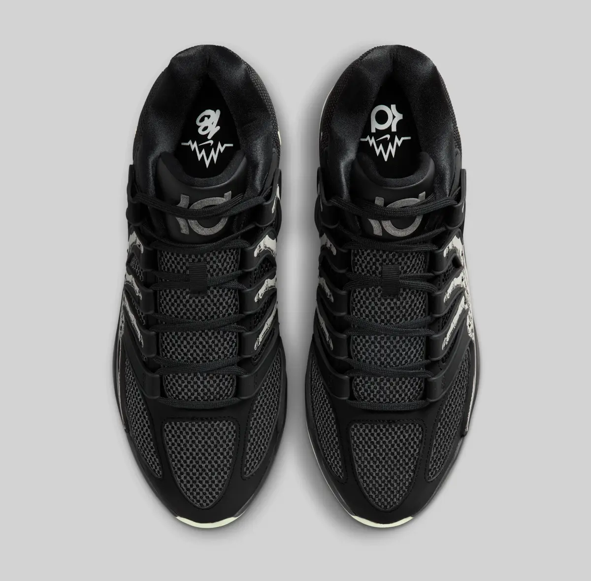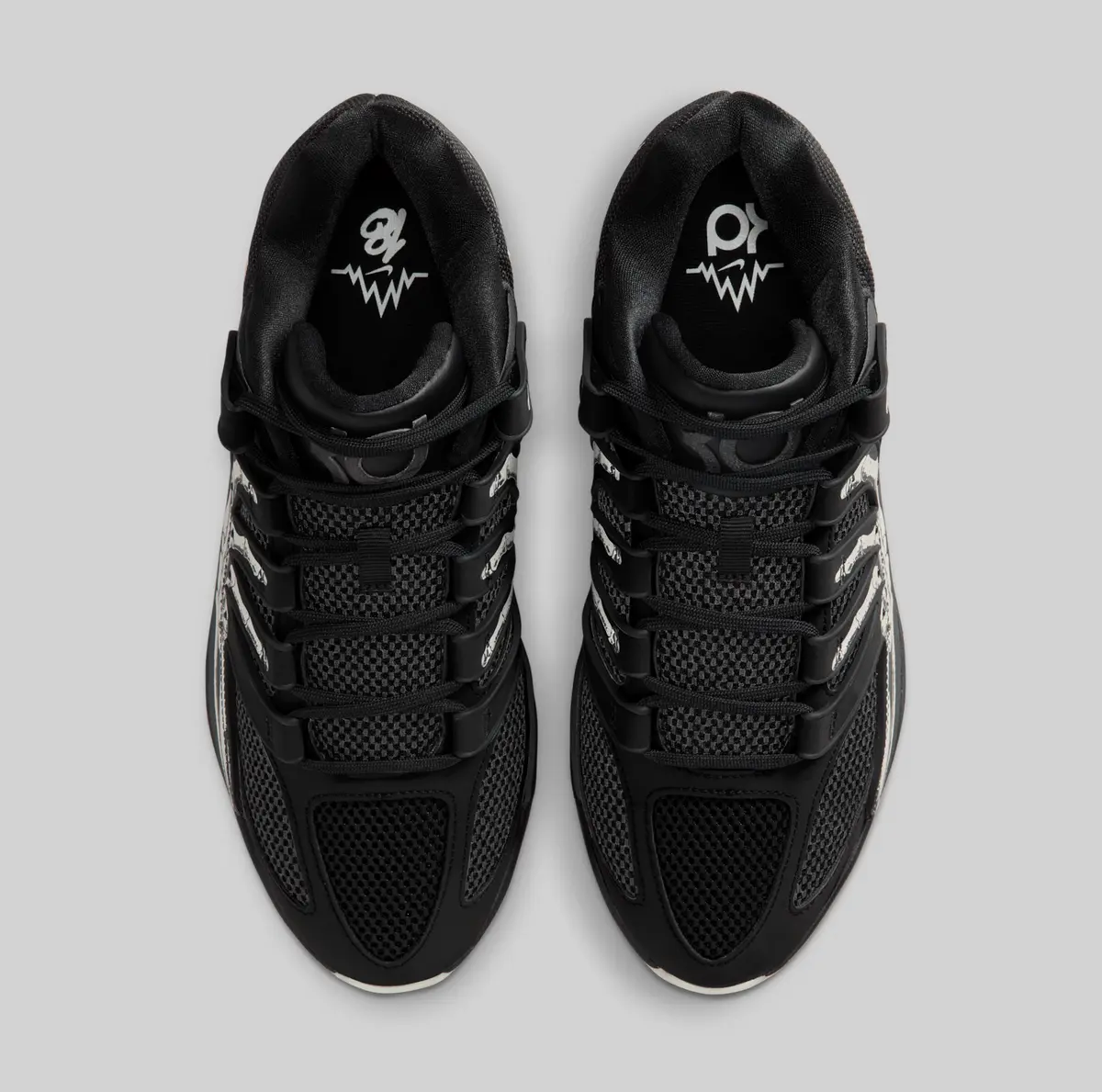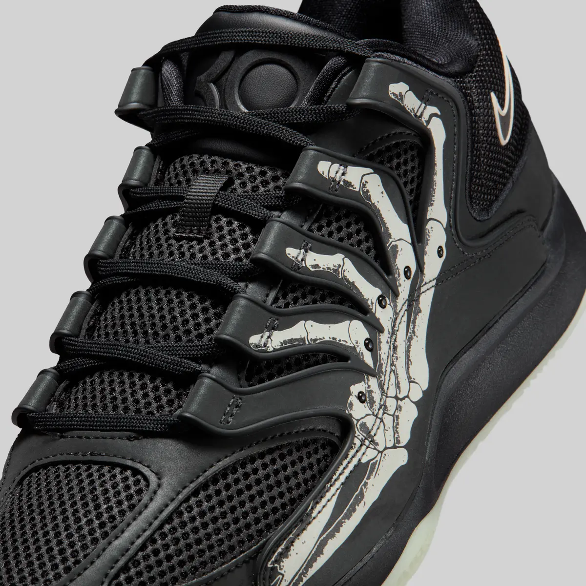 この骨のグラフィックはかつての「スケルトン」シリーズのエア フォース1を想起させる要素でありながらKDシリーズらしい攻撃的かつ洗練されたバスケットボール仕様に仕上がっています。ヒールには淡いホワイトで描かれたスウッシュが控えめに配置されシューズ全体のトーンと絶妙なコントラストを生み出しています。またアウトソールはやや黄緑がかった半透明の仕様で暗闇での光り方が期待される蓄光ディテールもさりげなく盛り込まれています。
