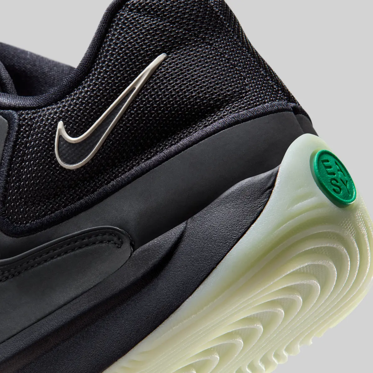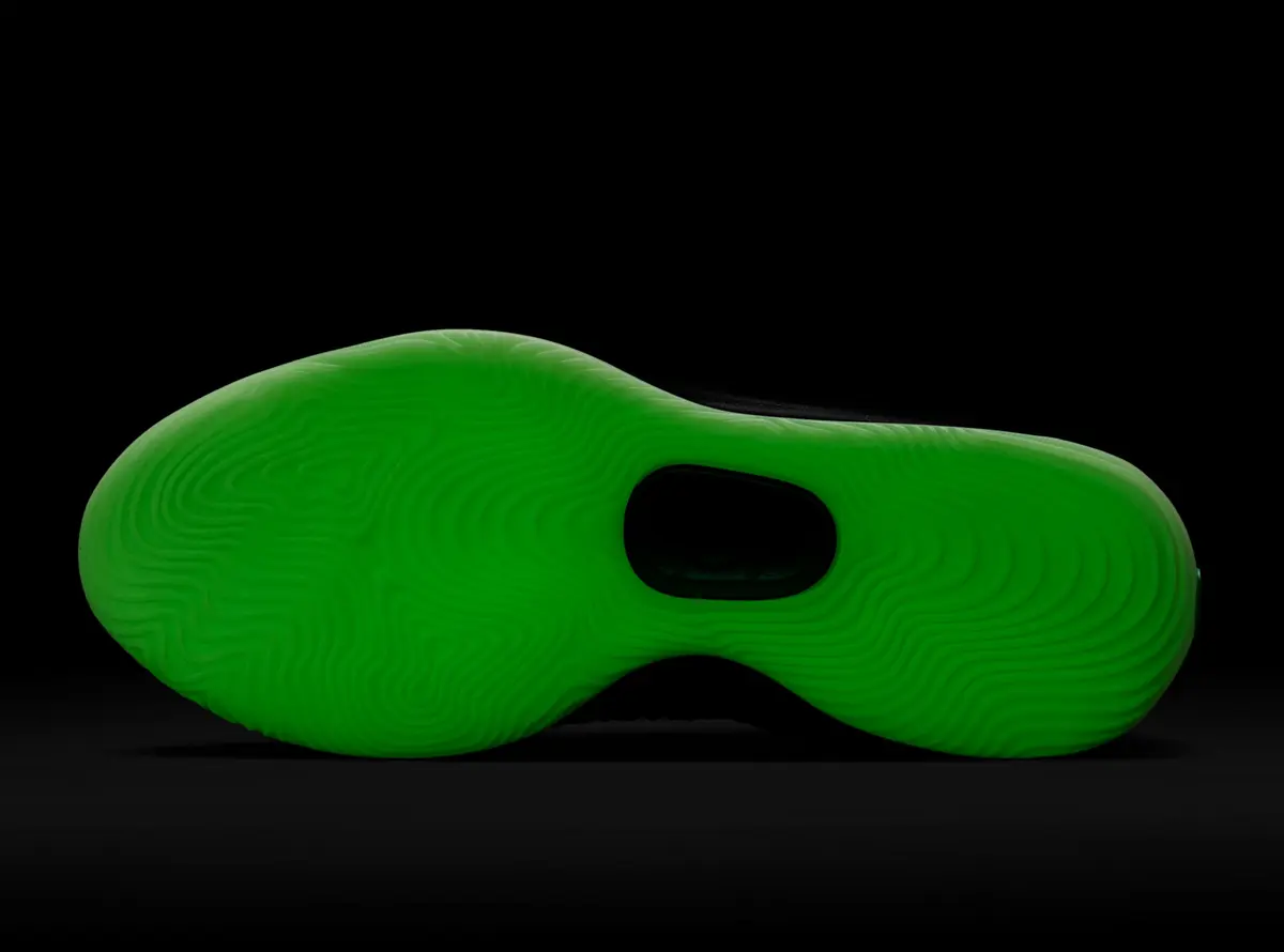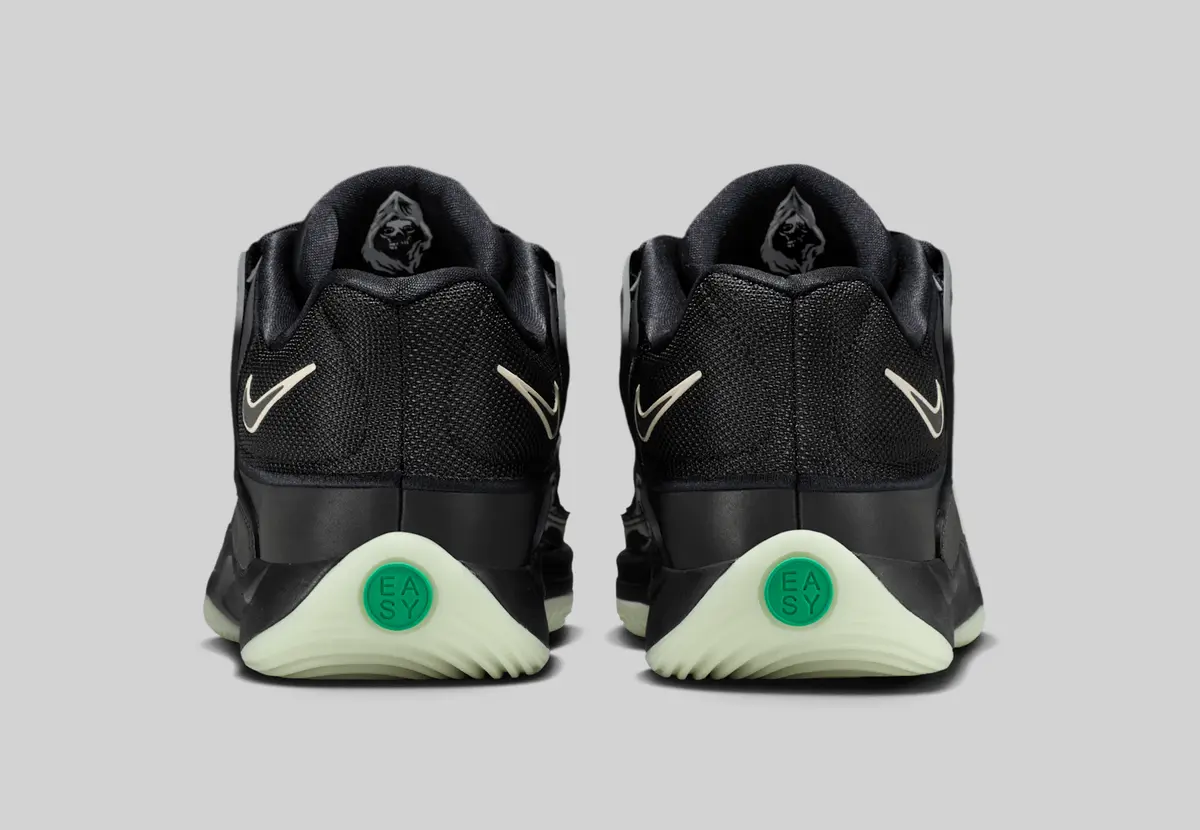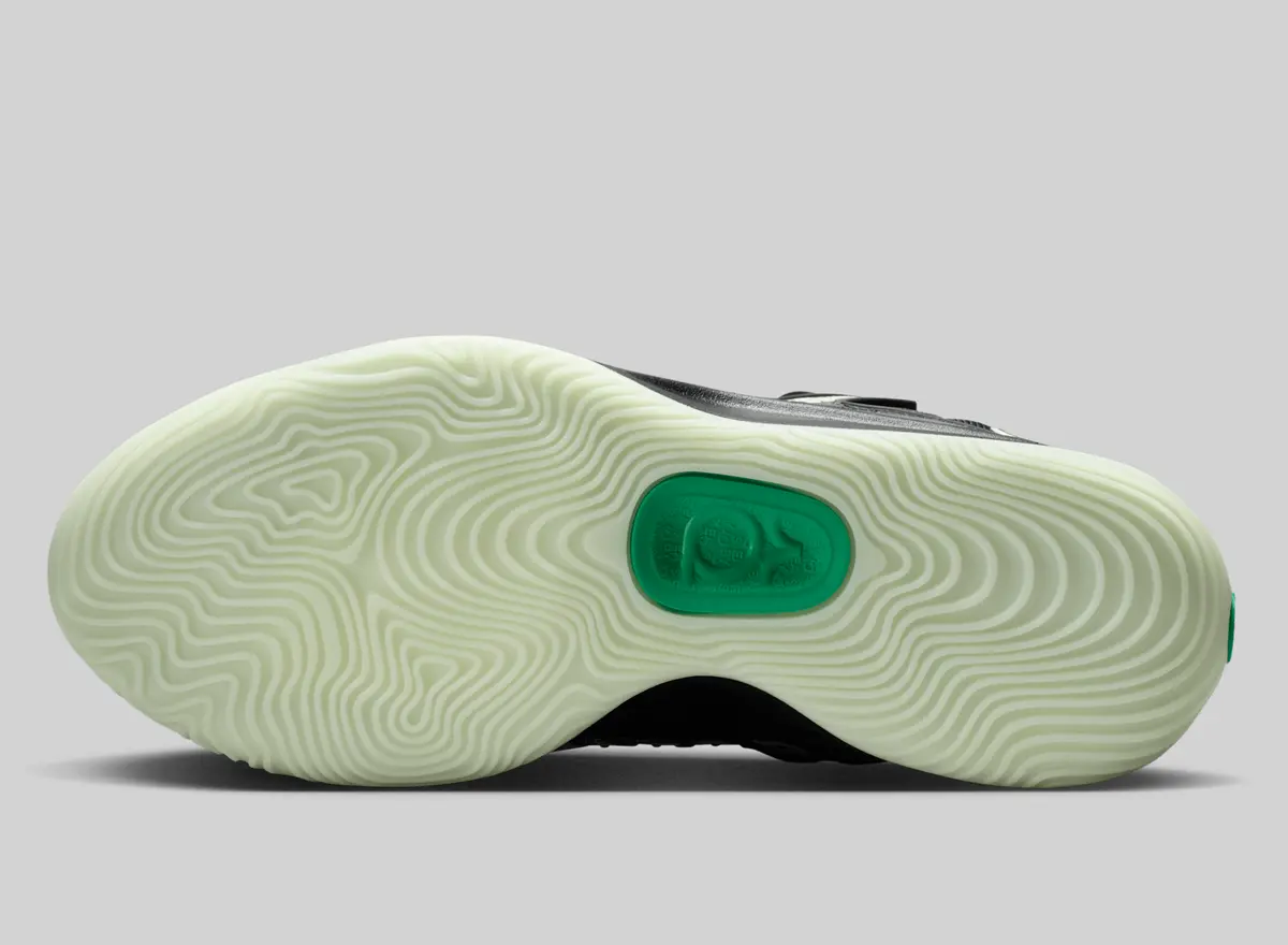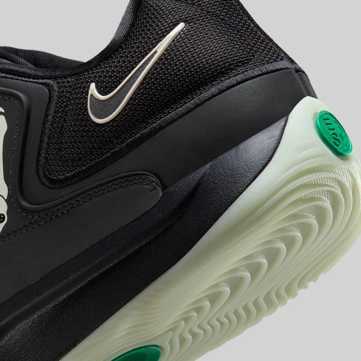 この骨のグラフィックはかつての「スケルトン」シリーズのエア フォース1を想起させる要素でありながらKDシリーズらしい攻撃的かつ洗練されたバスケットボール仕様に仕上がっています。ヒールには淡いホワイトで描かれたスウッシュが控えめに配置されシューズ全体のトーンと絶妙なコントラストを生み出しています。またアウトソールはやや黄緑がかった半透明の仕様で暗闇での光り方が期待される蓄光ディテールもさりげなく盛り込まれています。