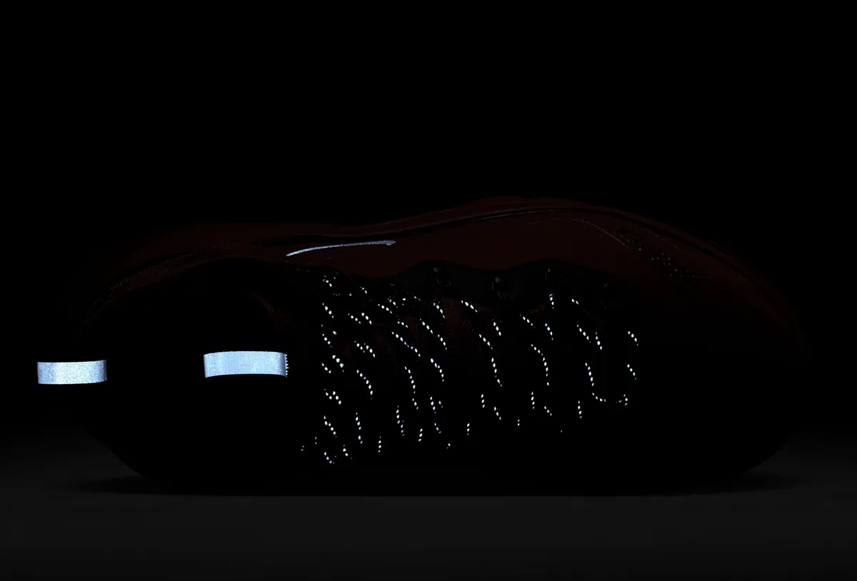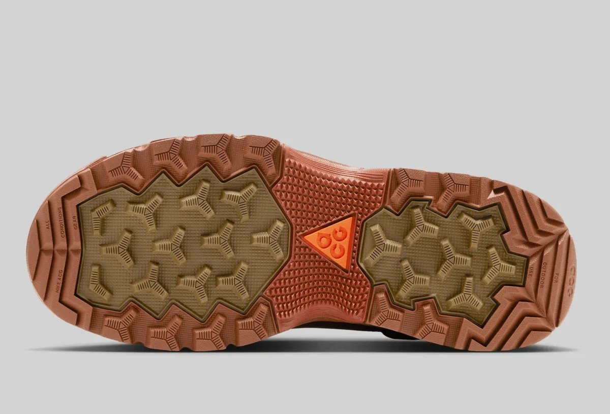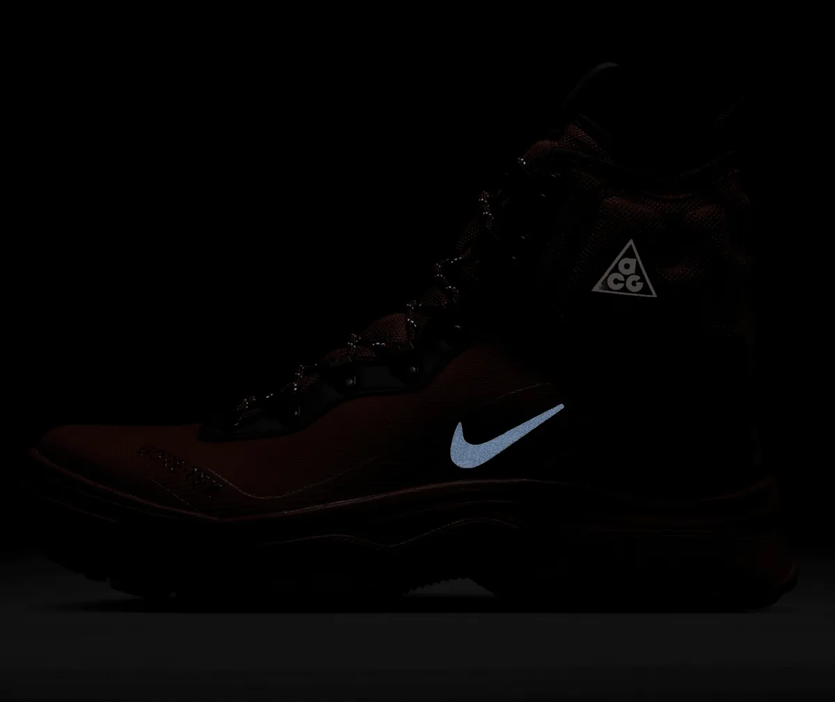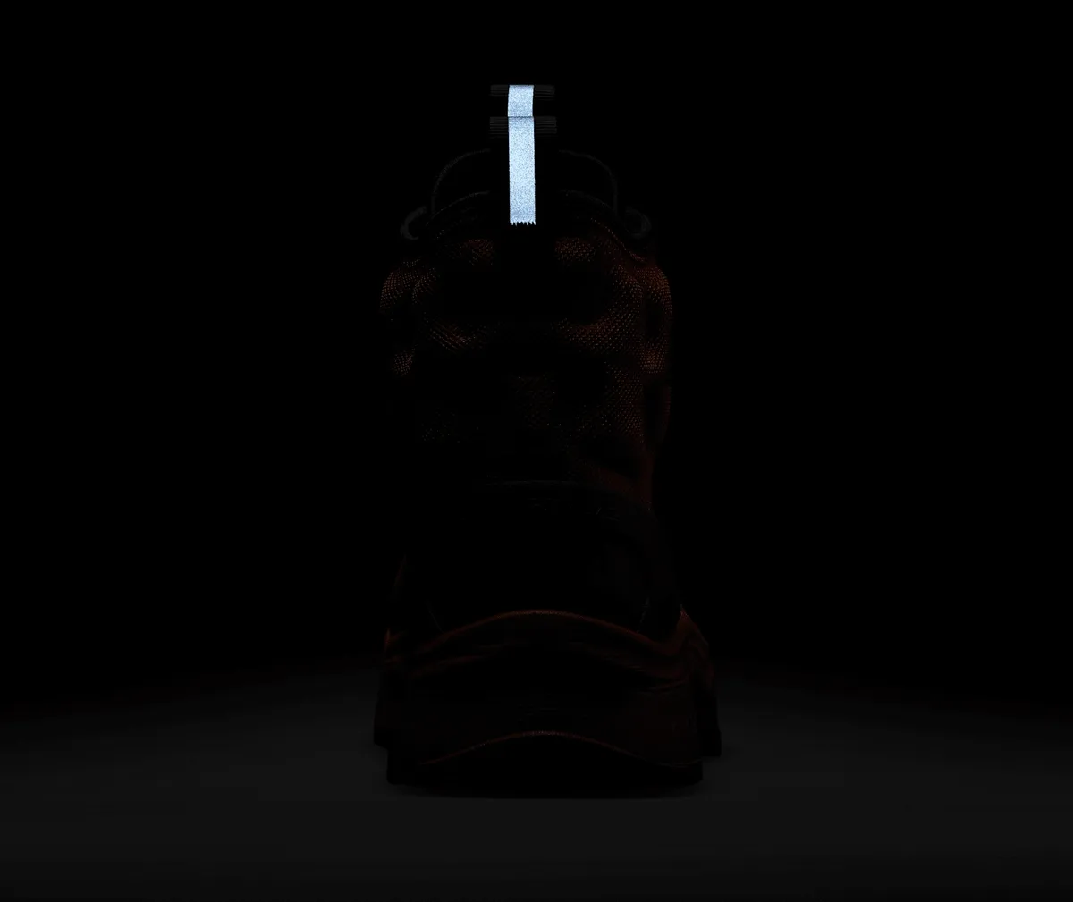 ディテールにも目を奪われます。メタル製のアイレットを通るシューレースはアウトドアギアを思わせる編み込み模様で、視覚的なアクセントとタフな雰囲気を両立しています。サイドにさりげなく配置されたスウッシュはリフレクティブ仕様で夜間には存在感を放つデザインとなっています。アッパーには防水透湿素材のGORE-TEXが採用され、悪天候でも足をドライに守る機能美を兼備しています。さらに分厚いラバーアウトソールには3パート構造の深いラグパターンが刻まれマッドブラウンとオリーブトーンのコンビネーションが実用性とビジュアルを両立。地面をしっかり掴むソールの造形はただのシューズを超えた本格的なトレッキングブーツの表情を際立たせています。
