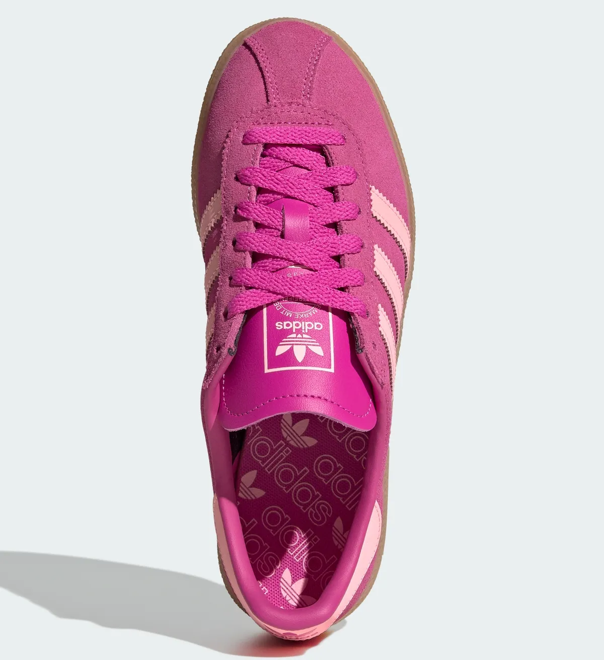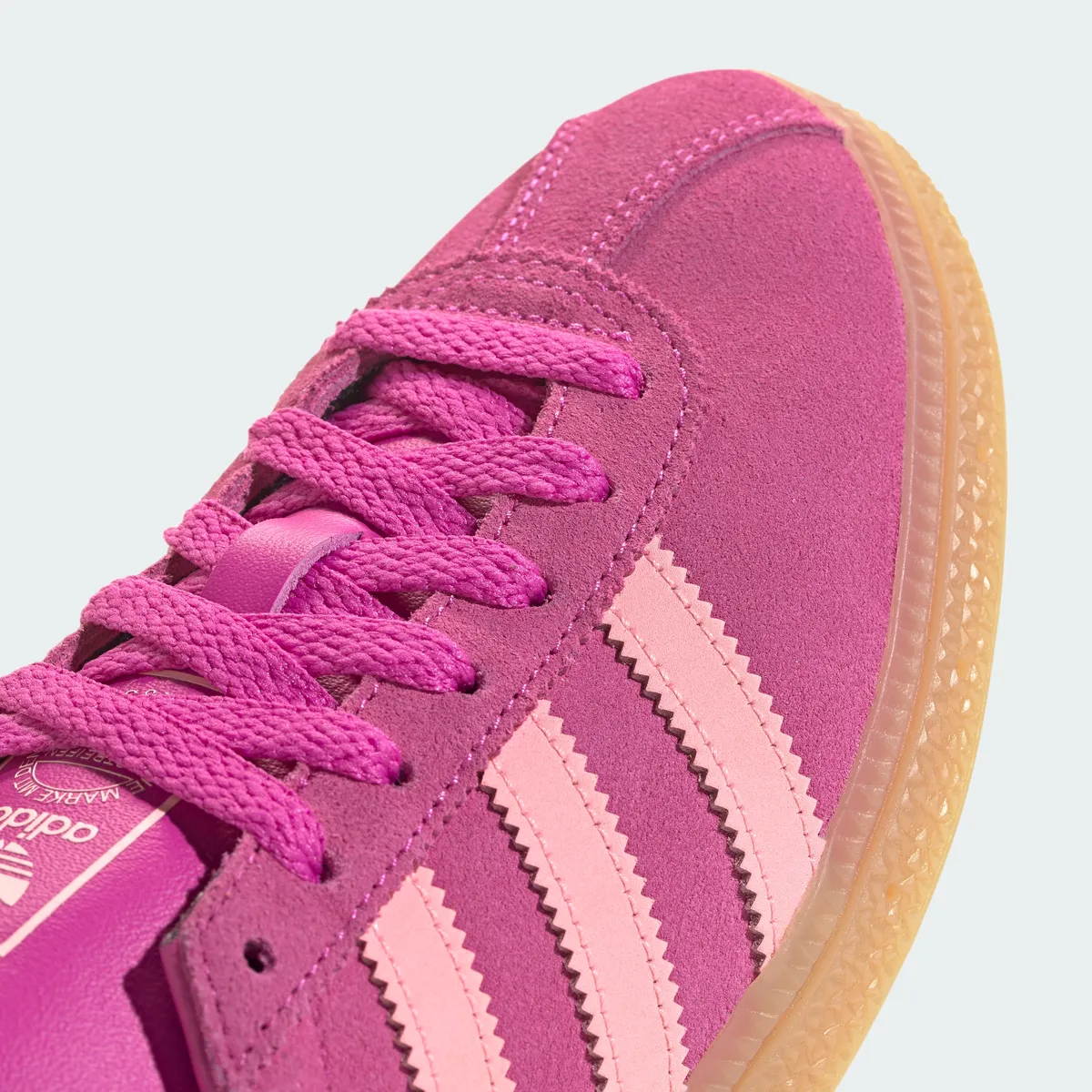 まず目を引くのはアッパー全体を包み込むビビッドなセミルシッドフューシャの発色です。濃厚なピンクのトーンが持つ力強さにスリーストライプスやヒールタブに配された柔らかなグローピンクが寄り添い視覚的なリズムを生み出しています。単に派手さを追求するのではなく濃淡の妙によって奥行きのある表情を引き出しているのが特徴です。