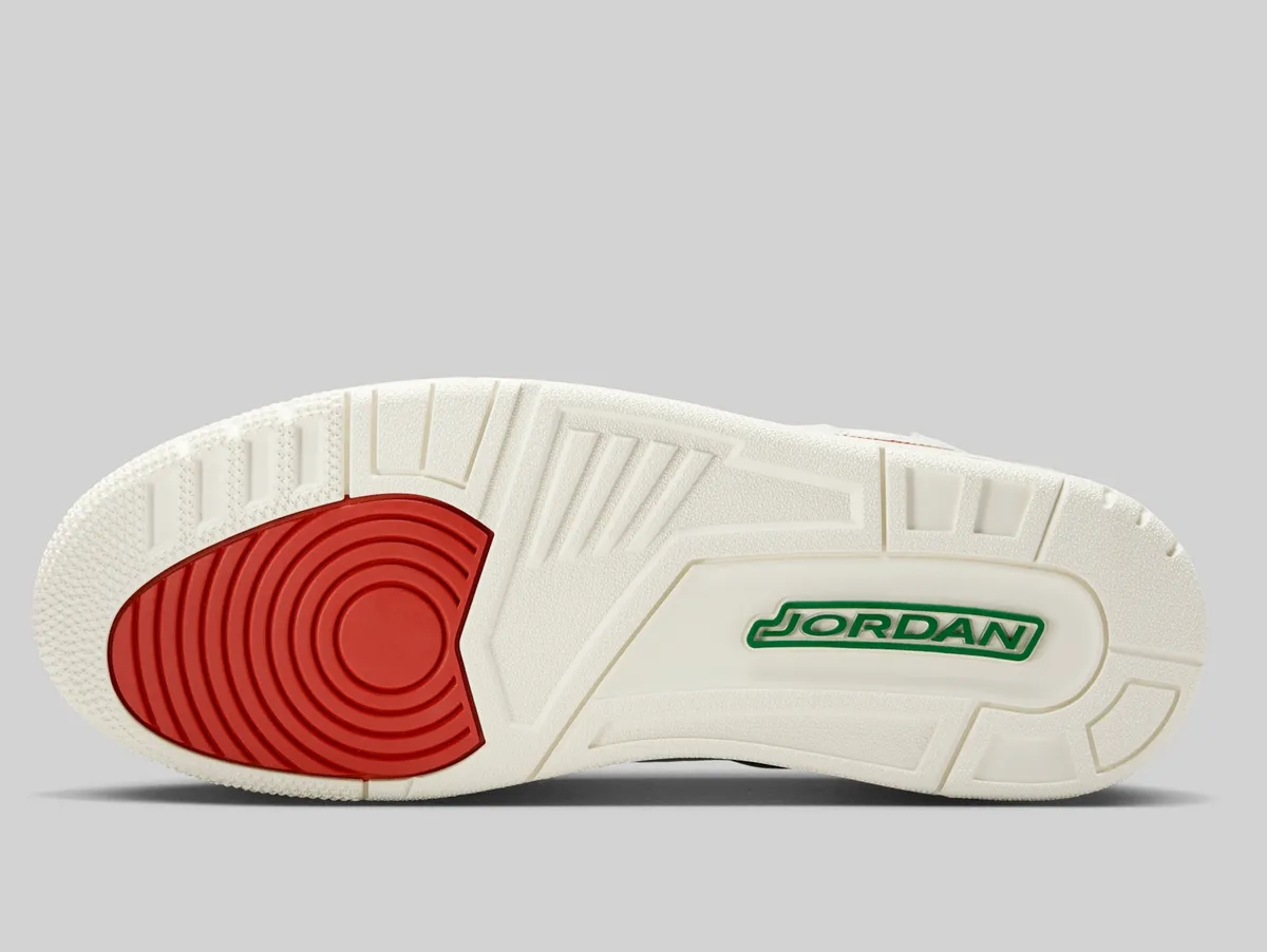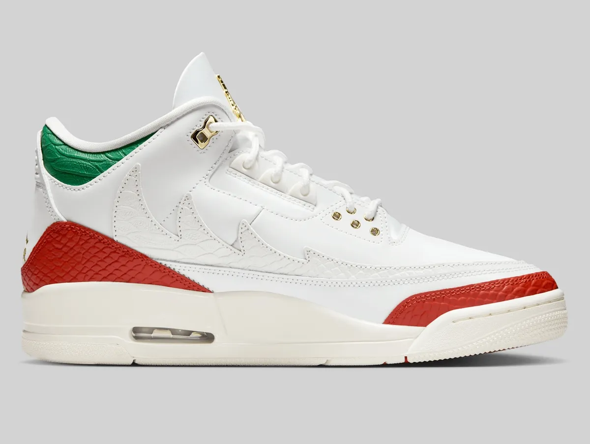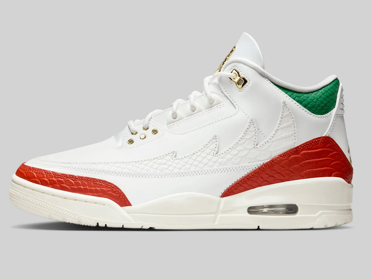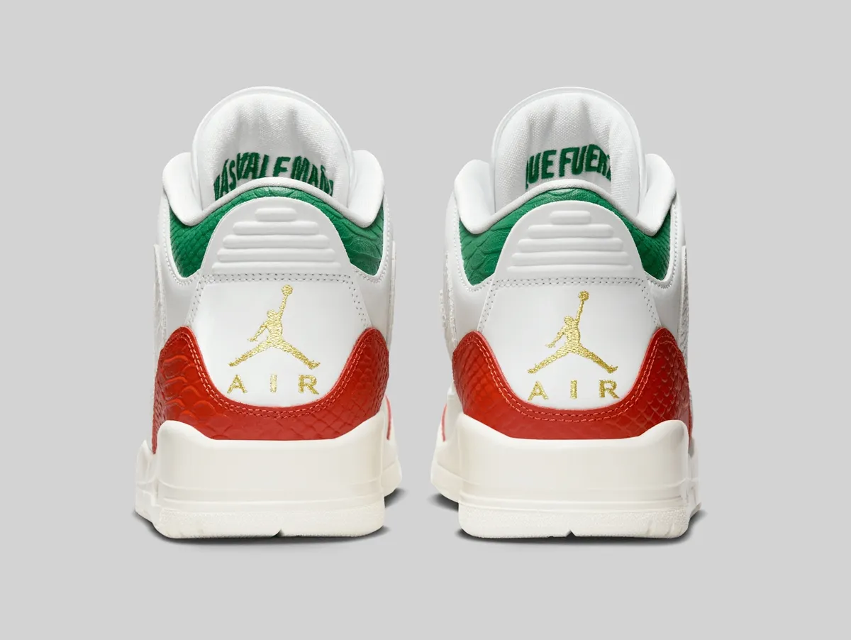 エア ジョーダン 3 レトロ “El Vuelo”はメキシコ国旗の色彩をまとい、ルチャ・リブレ(覆面プロレス)の情熱を表現した特別なモデルです。アッパーを覆うサミットホワイトは純粋さと力強さを象徴、国旗中央の白地を思わせる清廉な印象を放ちます。つま先とサイドに走るドラゴンレッドは情熱と闘志の赤を体現しリングで躍動するルチャドールのエネルギーを感じさせます。履き口とヒールに配されたパイングリーンは豊かな大地と誇り高い文化を象徴し赤との鮮やかなコントラストが目を惹きます。
