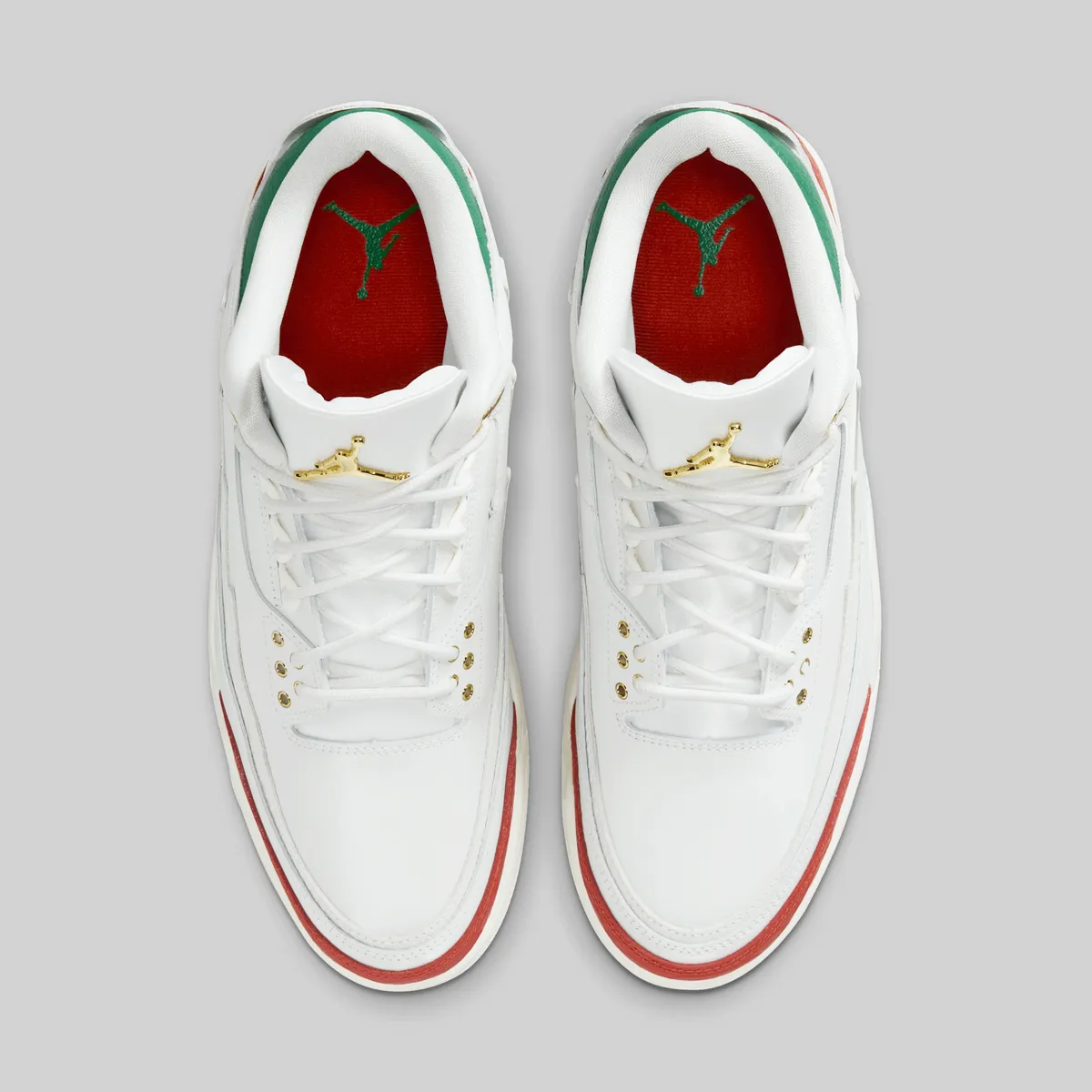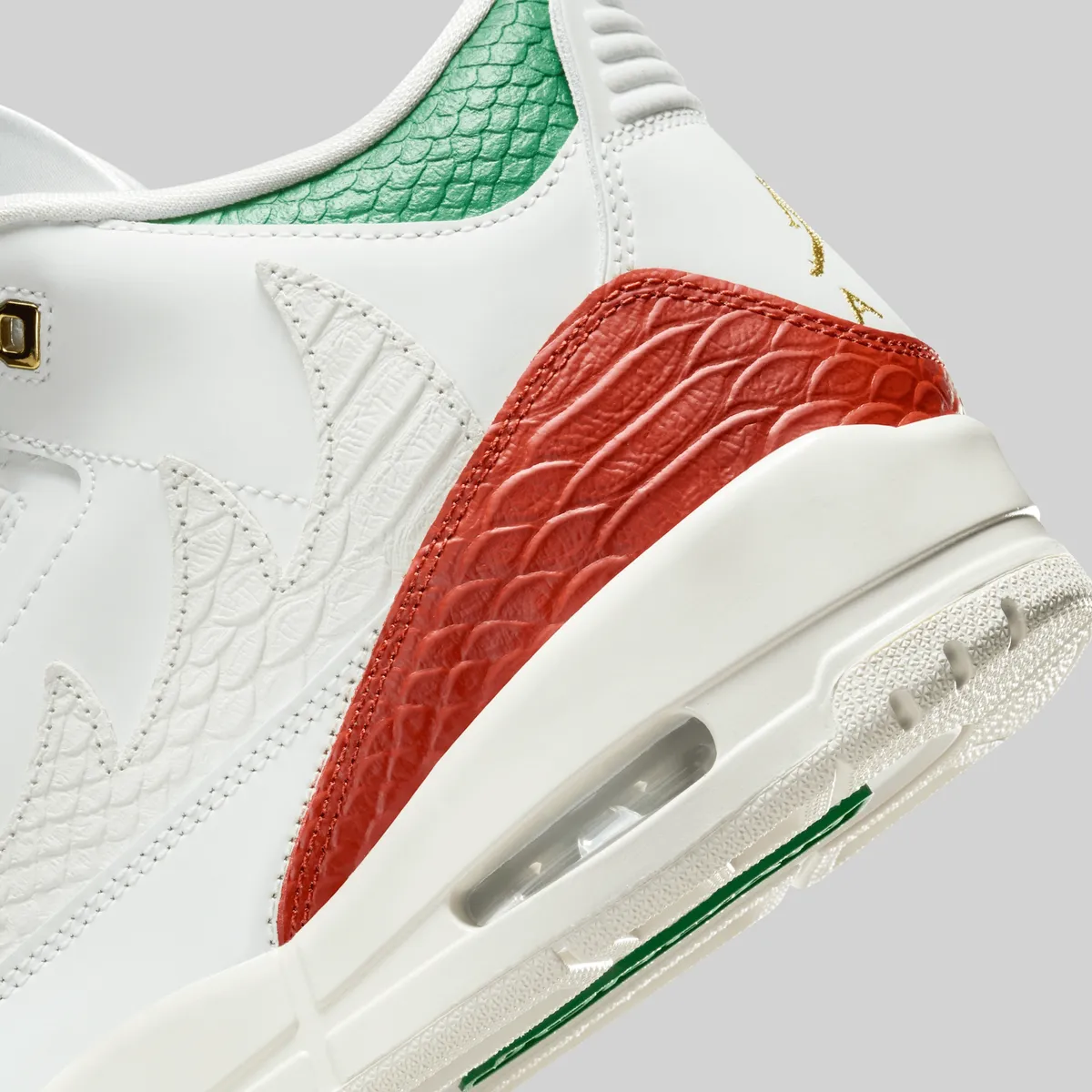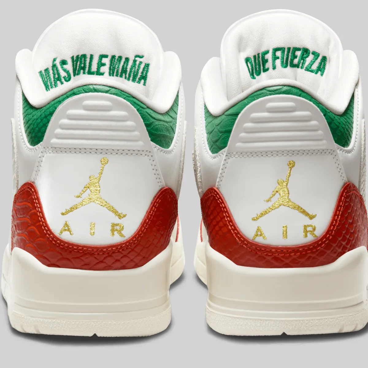 エア ジョーダン 3 レトロ “El Vuelo”はメキシコ国旗の色彩をまとい、ルチャ・リブレ(覆面プロレス)の情熱を表現した特別なモデルです。アッパーを覆うサミットホワイトは純粋さと力強さを象徴、国旗中央の白地を思わせる清廉な印象を放ちます。つま先とサイドに走るドラゴンレッドは情熱と闘志の赤を体現しリングで躍動するルチャドールのエネルギーを感じさせます。履き口とヒールに配されたパイングリーンは豊かな大地と誇り高い文化を象徴し赤との鮮やかなコントラストが目を惹きます。
