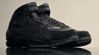 アッパーはブラックとダークグレーを巧みに切り替えスエードの柔らかなレザーのなめらかな艶感を交差させています。単色に寄りがちなダークトーンですが素材感の違いと濃淡のレイヤーによって立体的な表情を生み出しています。サイドを支えるケージやシューホール周りにはマットなブラックパーツが配置されデザインの骨格を強調しながら実用性も兼ね備えています。