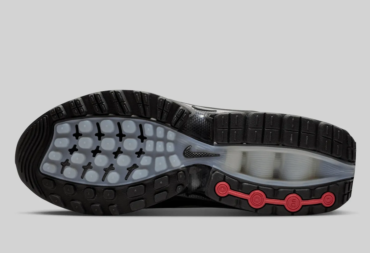 特に目を引くのはミッドソールに配置された新世代のエアユニットです。クリアな窓越しに見えるエアポッドはテクノロジーの進化を視覚的に伝えています。4つのエアポッドが一直線に並ぶ構造は力強さと未来的なムードを強調し単なるクッショニング機能に留まらず、デザインそのものの主役として成立しています。アウトソールにはブラックラバーを用いグリップと耐久性を高めながら全体の統一感を保っています。