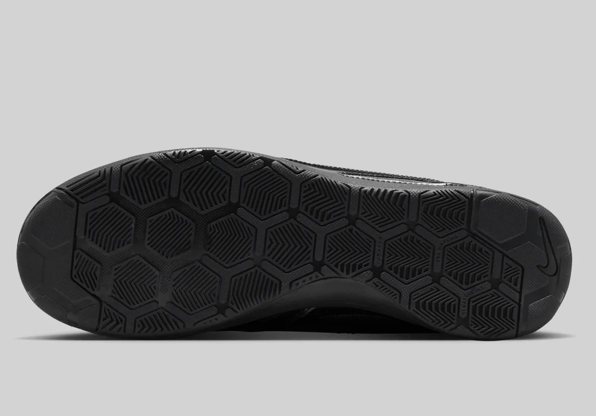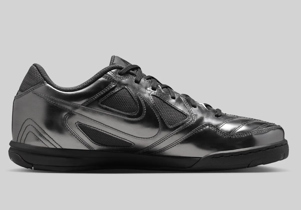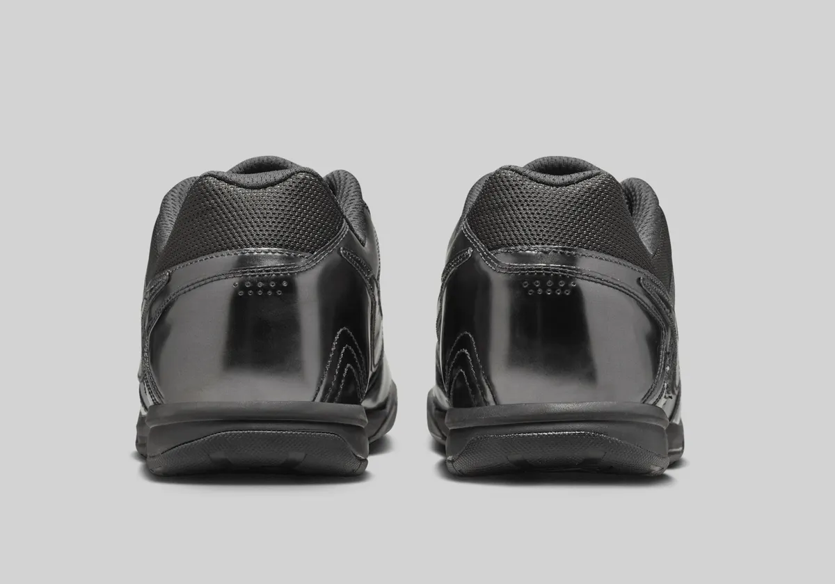 アッパーは深みのあるブラック系を基調にしながらも光沢感のあるパテント調レザーと落ち着いたマットなメッシュを巧みに組み合わせることで見る角度や光の加減によってダークグレーやグラファイトを思わせる多層的な表情を見せます。陰影のコントラストによって単色でありながら奥行きが生まれ重厚さと洗練を併せ持つ仕上がりになっています。サイドに配されたスウッシュは同系色ながら素材感の違いで浮かび上がり、全体に立体感を与えています。