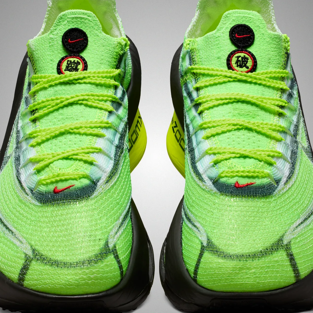 アッパーは軽量で透け感のある素材で構成され、色が重なりあうことで奥行きを表現しています。視線を凝らせば、右のシュータンに刻まれた「蹴」、左には「破」という文字が存在感を放ちます。インソールにはその配置が逆転しており、右足に「破」、左足に「蹴」が刻まれています。まるで左右の足が互いに役割を補完し合い、走るごとに力を解き放つかのような意味を感じさせます。さらにヒール部分には「体力・気力・努力」という文字が刻まれ日々のトレーニングで積み重ねてきた覚悟を背中から押し出すように響きます。こうした文字の存在はシューズをただの道具ではなくランナーの精神を支える相棒へと昇華させています。
