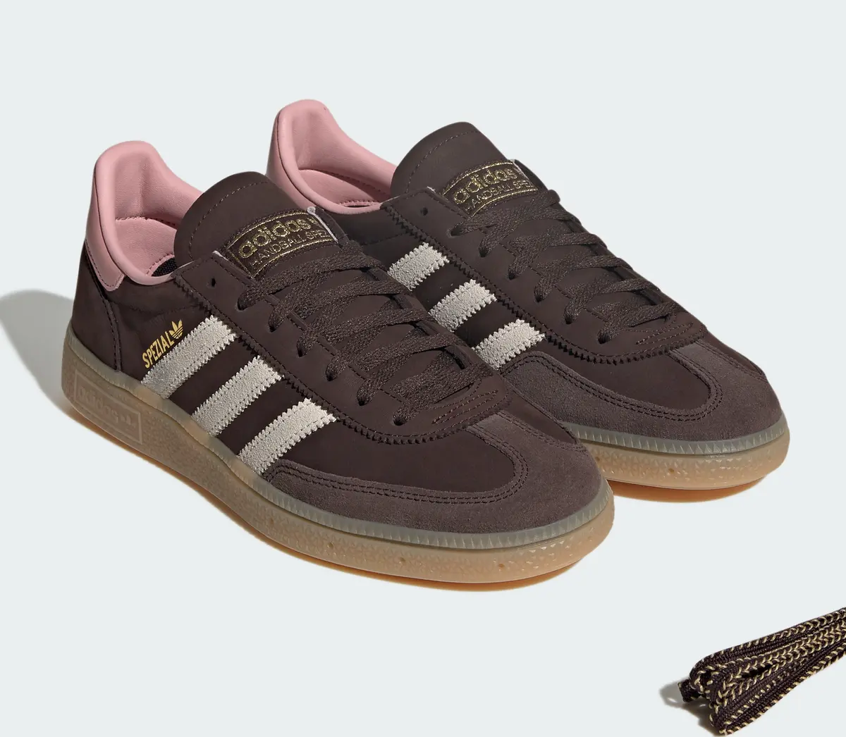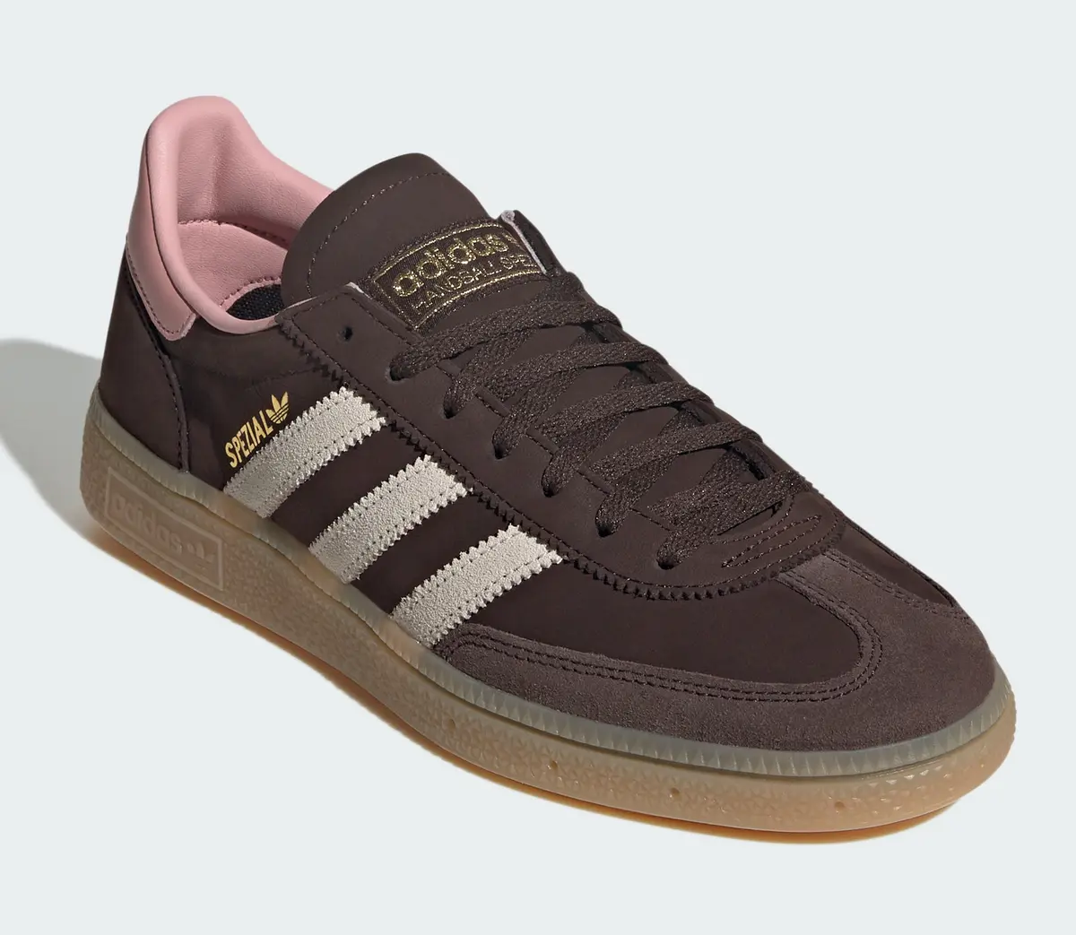 まず目を引くのはアッパー全体を覆う深みのあるダークブラウンで落ち着いた色調がベースとなりシューズ全体の印象を引き締めています。そこに重ねられるスリーストライプスは柔らかなアルミナカラーで濃淡のコントラストが立体感を際立たせサイドの「SPEZIAL」のゴールドプリントと相まってラグジュアリーな輝きを添えています。ヒール周りに配置されたワンダーモーヴのアクセントは柔和で優美なトーンを放ちシックな中に遊び心を加える巧妙な仕上がりになっています。