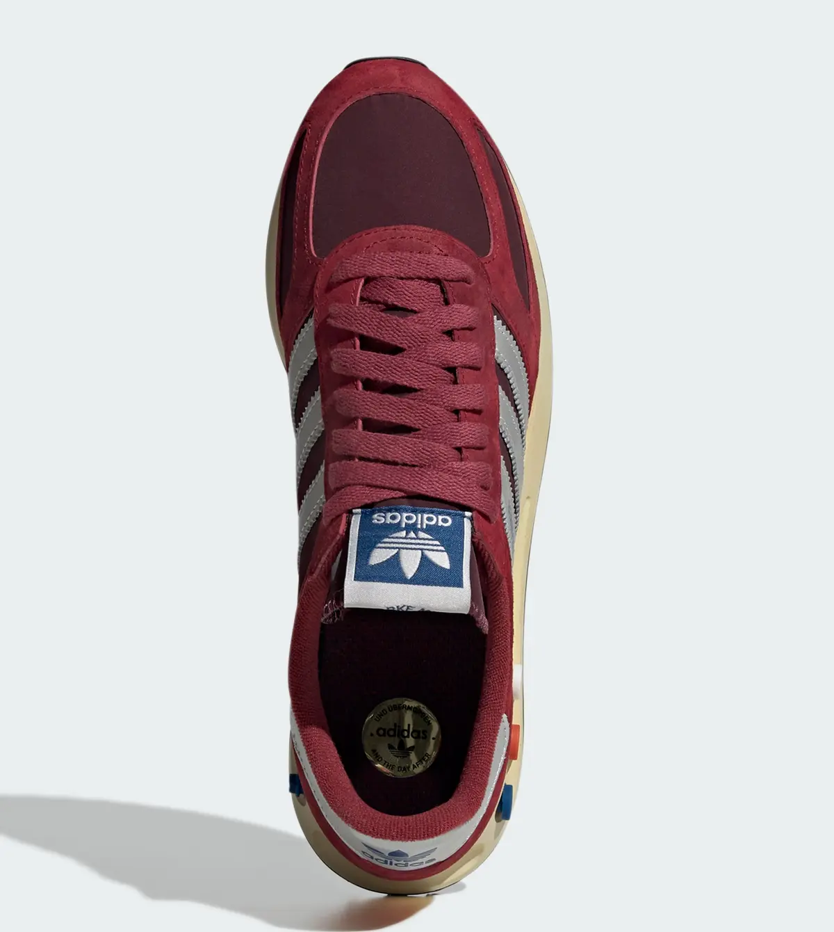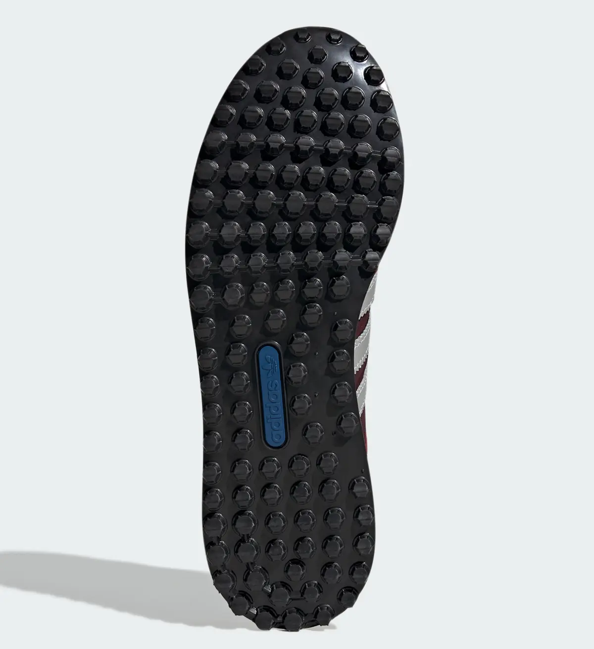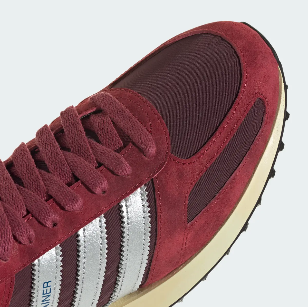 まず印象的なのは深みのある赤を基調としたノーブルマルーンです。落ち着いたワインのようなトーンがスエードの質感と溶け合い重厚感と同時に気品を漂わせます。シルバーメタリックのスリーストライプスはシャープなアクセントとなりヴィンテージランニングシューズ特有のスリムなシルエットをさらに際立たせています。ソールに埋め込まれたブルーホワイトレッドのヒールプラグはクラシックなDNAを物語りつつ視覚的なリズムを加えています。
