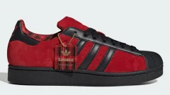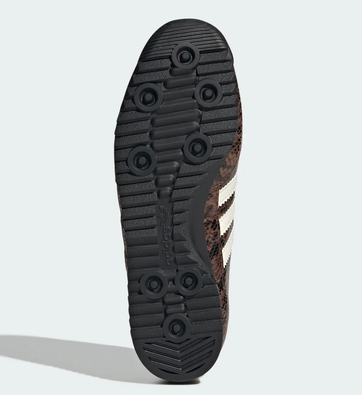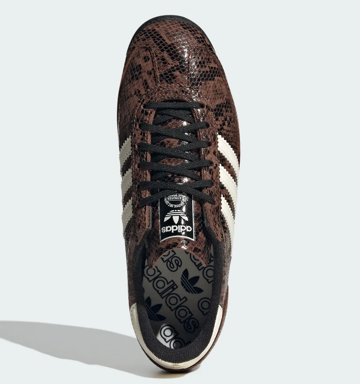 まず「プレラブドブラウン」は、深みのあるブラウンをベースにブラックのスネークパターンが重なり、アニマルライクでありながらも落ち着いた佇まいを演出しています。しっとりとした質感のレザーが光を受ける角度によって濃淡を変え重厚感と艶やかさを同時に感じさせます。そこに配置されたクリームホワイトのスリーストライプスはダークトーンに鮮やかなコントラストを加え全体を引き締める役割を果たしています。ソール部分はブラックで統一されアッパーの複雑な表情をより際立たせています。