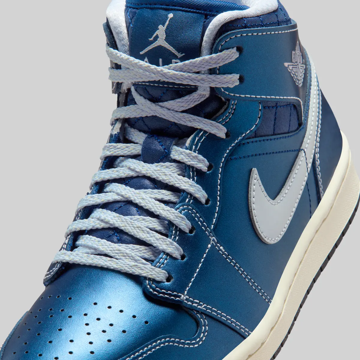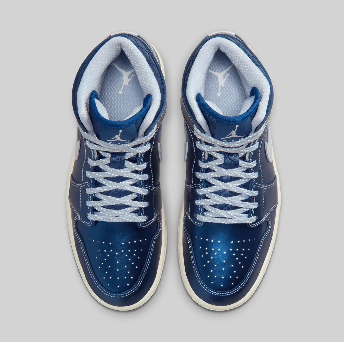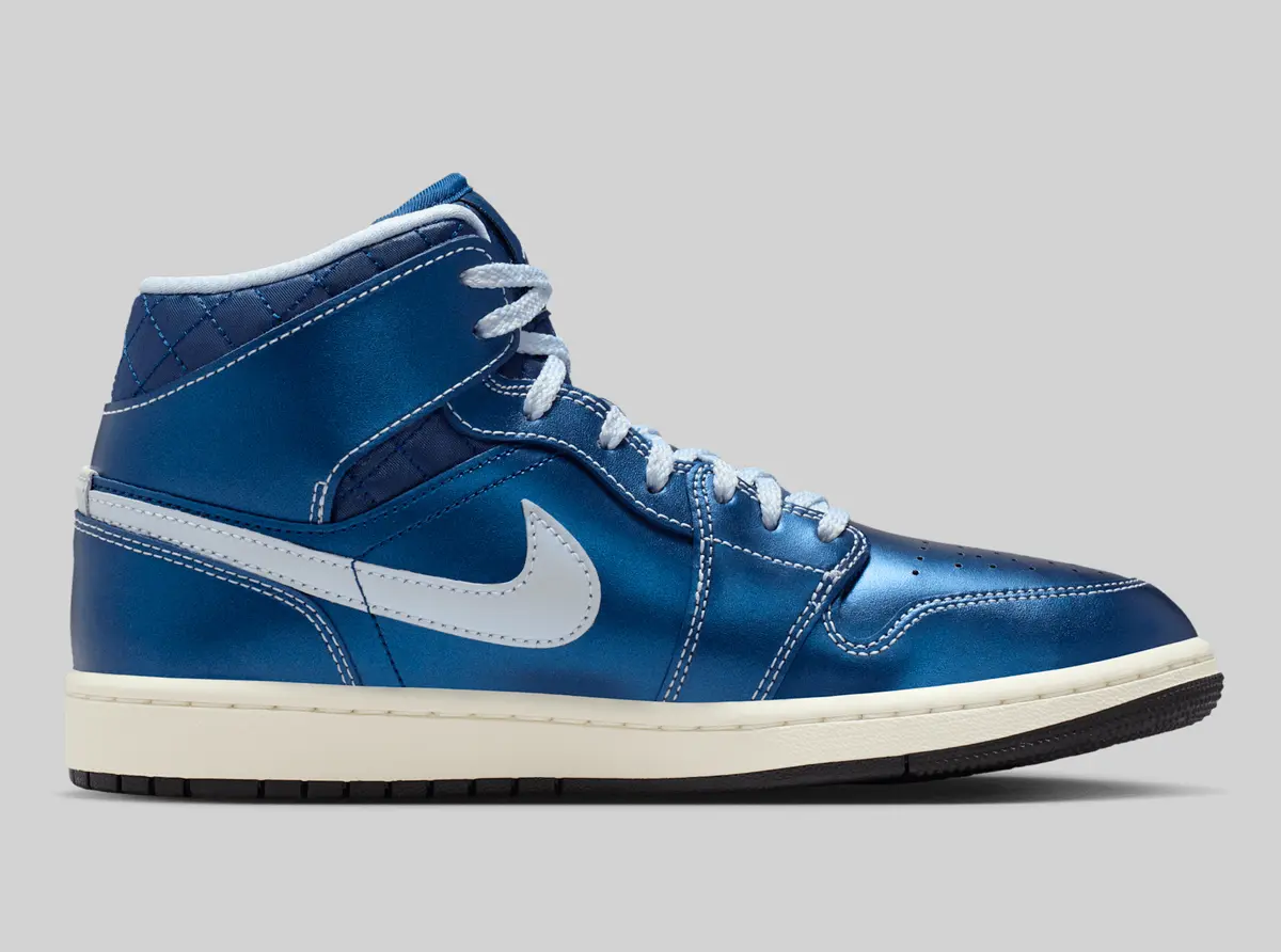 深みのあるブルーの輝きを纏った エア ジョーダン 1 MID は、一目で心を奪う存在感を放つ一足です。アッパーを覆うのは金属のような艶を宿したメタリックブルーのレザーで光を受けるたびに異なる表情を見せます。角度によってはクールなアイスブルーにも、濃厚なコバルトにも変化し、足元に立体感を生み出す仕上がりです。
