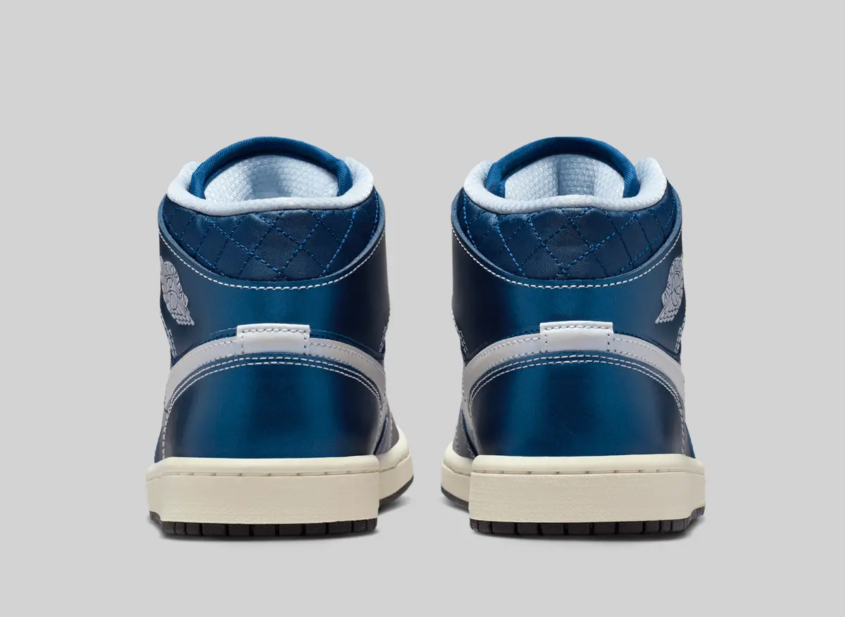 シルエットはクラシックなジョーダン 1 MIDの形を踏襲しながらも、随所に個性が光ります。タン部分にあしらわれたジャンプマンロゴとアンクル部のウィングマークはホワイトで統一されメタリックブルーの背景に鮮やかに浮かび上がります。履き口の内側には柔らかなパッドが入り、足を包み込むような快適性を実現しています。ヒールからサイドにかけてのステッチワークは緻密でクラフト感をさりげなく主張しています。ミッドソールにはヴィンテージを思わせるオフホワイトを採用しブルーの光沢とのコントラストでクラシカルな雰囲気を漂わせています。その下に組み合わされたブラックアウトソールは力強さと実用性を兼ね備えた存在です。