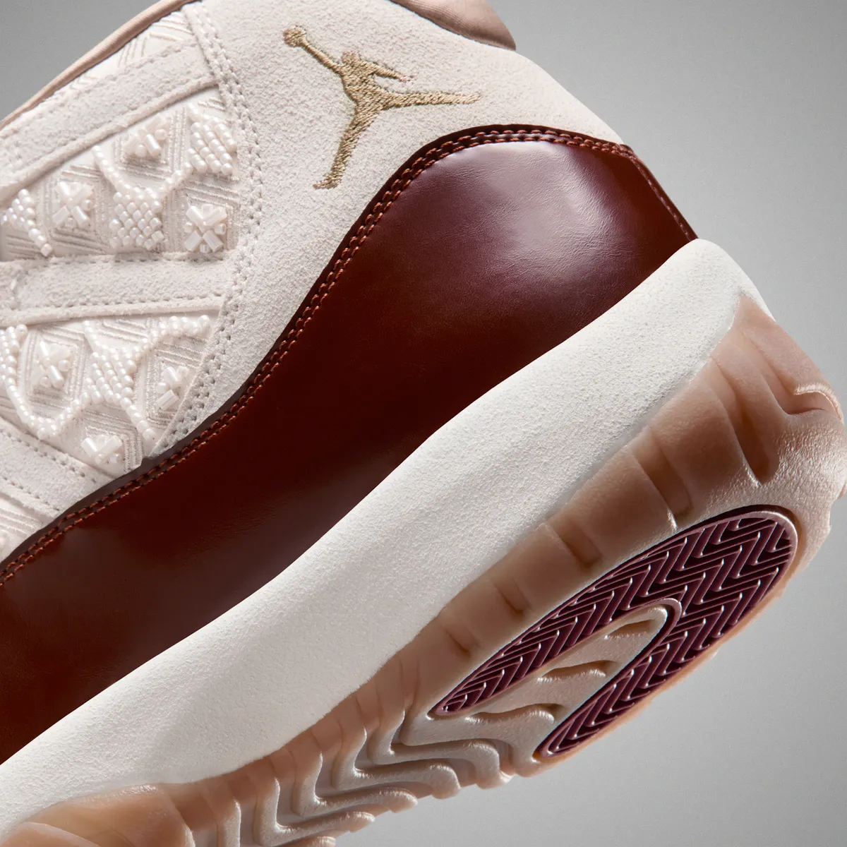 まず目を引くのは深みのあるブラウンレザーとクリームトーンのスエードが織りなすカラーリングです。ブラウン部分は艶のある仕上げが施され力強さと高級感を両立しています。その対比としてアイボリーに近いアッパーのスエードには立体的な刺繍とビーズワークが組み込まれており滑らかな面と繊細なテクスチャーのコントラストが強烈な印象を与えます。光の加減で細部に影が落ちまるで浮き彫りのように文様が際立つ構造になっています。