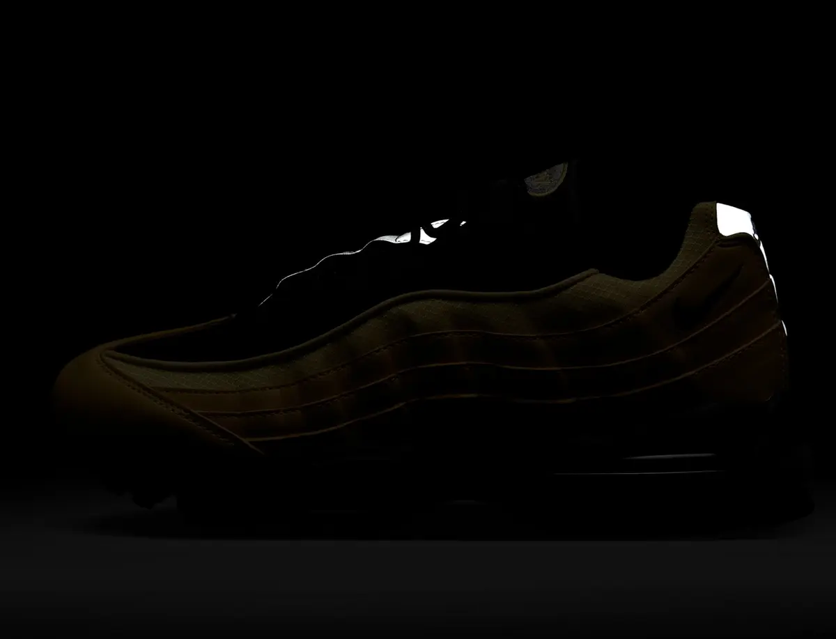 ヒール部分にあしらわれたメタリックシルバーのディテールは光の反射で表情を変え動きに合わせて多彩な輝きを見せます。そのさりげない煌めきは、全体の大胆な配色の中に洗練された印象を加えています。鮮やかさと重厚感、スポーティさと高級感が同居するデザインはまさに「エア マックス 95」ならではの魅力を新たに表現しているといえます。
