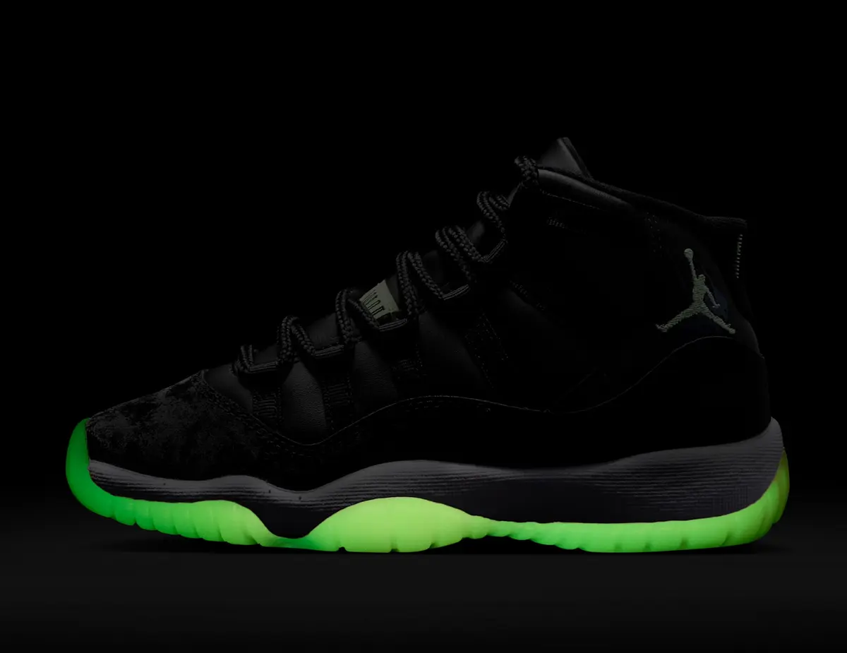 このモデルの真価は何よりもエアユニットに凝縮されています。ブラックのミッドソールに収められたビジブルエアはヒール側で鮮烈なアクショングリーンを放ち前足部にかけてフォトブルーへと移ろうように配色されています。この二色が共鳴し合うことで光の反射や角度によって奥行きのある発色を見せ足元に独自のリズムを刻みます。単色でまとめられることが多いエアパックにおいてこのような鮮やかなグラデーションは稀少であり本作の象徴的な魅力となっています。