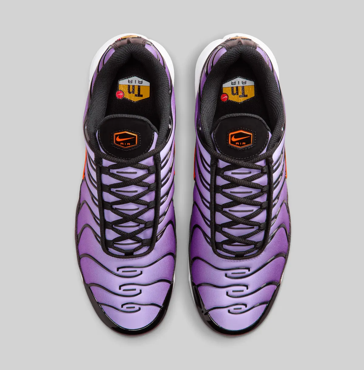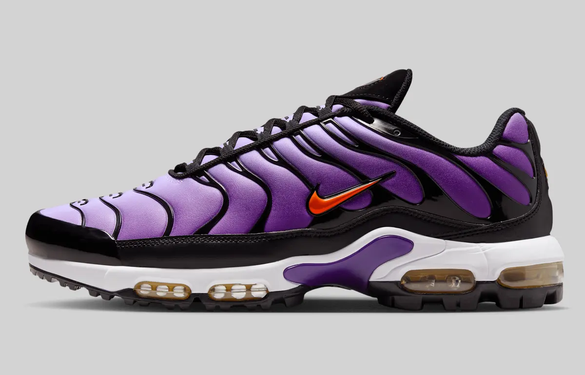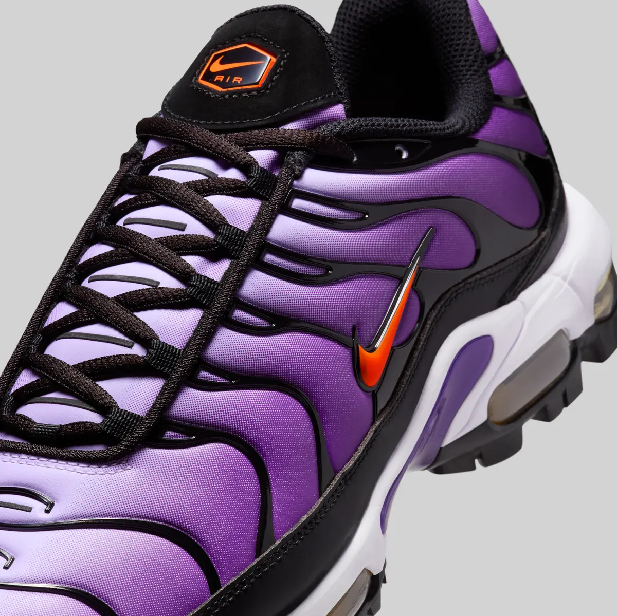 紫のグラデーションが放つ妖艶な輝きと黒で縁取られた力強いライン。その対比が印象的な一足が「ナイキ エア マックス プラス ゴルフ ボルテージパープル ブラック トータルオレンジ 」。アッパーは光沢を帯びたパープルを基調とし濃淡の変化が波打つように広がり足全体を包み込むような存在感を放っています。見る角度によって紫が淡く浮き上がったり深みを増したりとまるで夜空を染めるオーロラのような幻想的な表情を見せるのが特徴です。そこに走る漆黒のケージはシャープで立体感のあるラインを描き強靭さと洗練さを同時に表現しています。