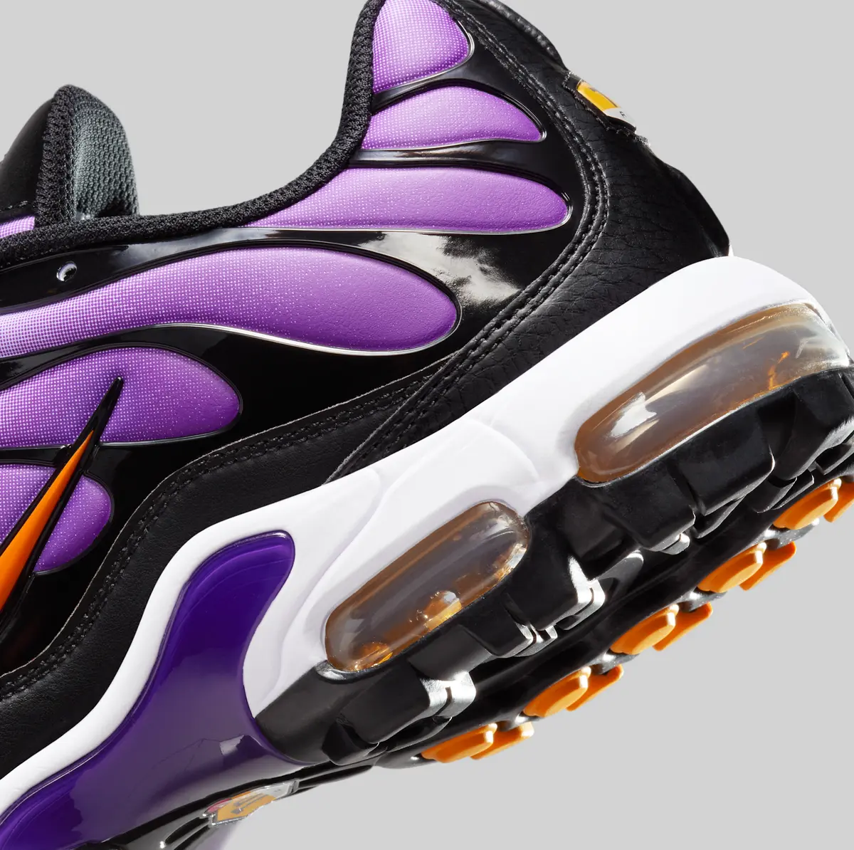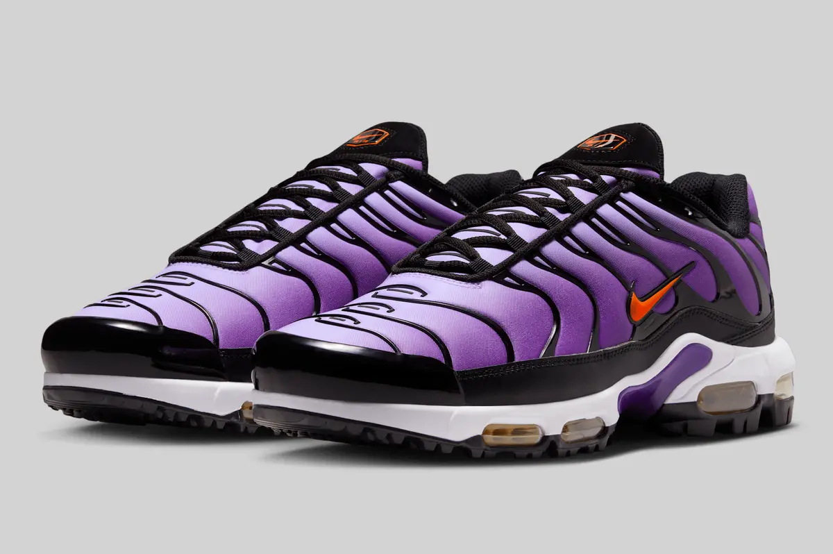 サイドには鮮烈なオレンジのスウッシュが配置されパープルとブラックの中で唯一のアクセントとして際立ちます。その輝きは炎のように鮮やかで視線を引き寄せるディテールです。ヒールには「Tn Air」の象徴的なロゴが配されクラシックなDNAを感じさせながらもゴルフ仕様へと進化していることを主張しています。アウトソールはブラックをベースにしながらも一部にオレンジを差し込み視覚的にも力強さを強調。グリップを確保するラグパターンが精巧に組み込まれ実用性とデザイン性の両立を果たしています。