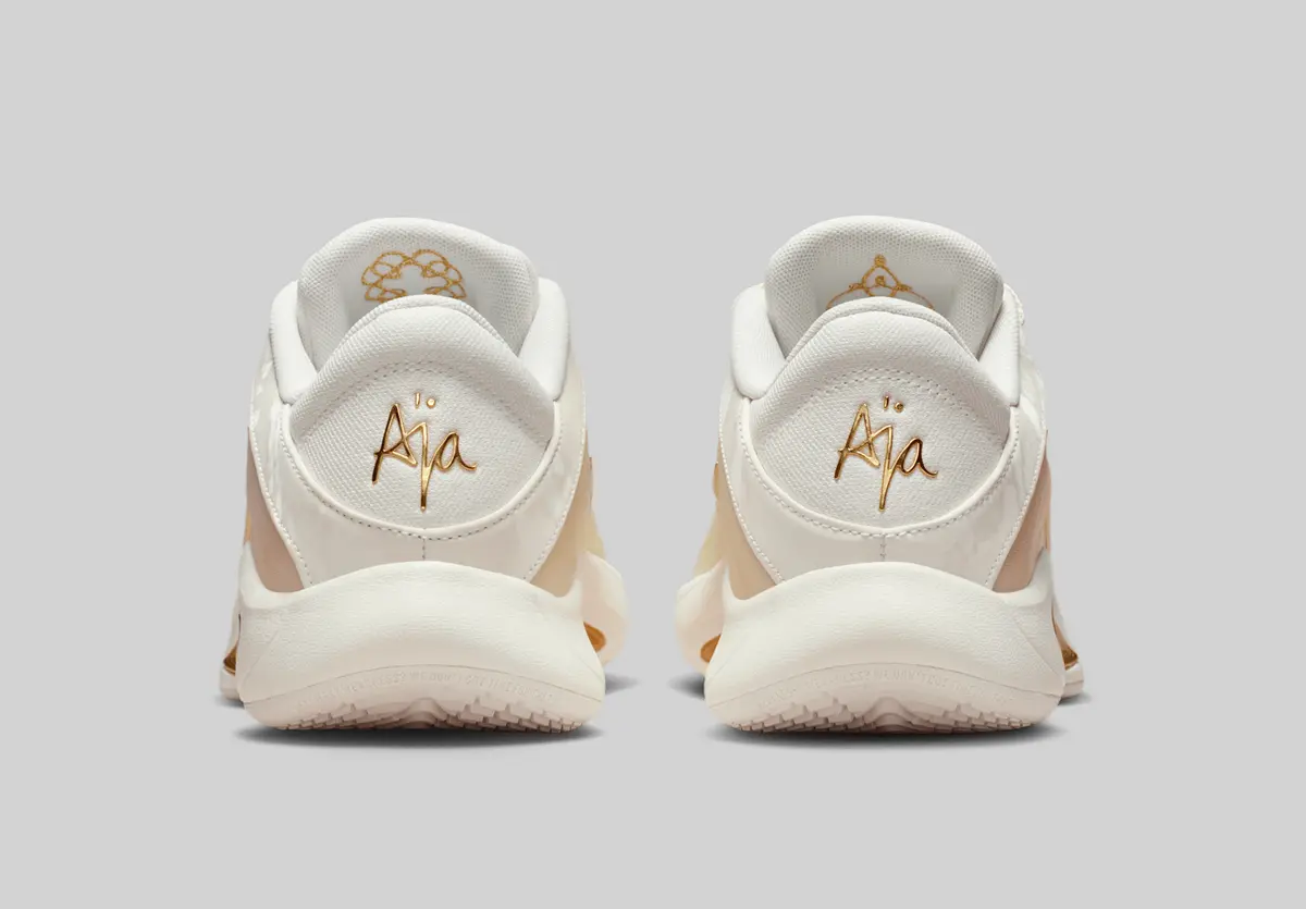 シュータンにはエイジャ・ウィルソンを象徴するロゴが配されシューズ全体にストーリー性を与えています。トップビューからはシャープに伸びるラインが際立ちスポーティーでありながら優美な印象を強めています。ヒール部分には「A’ja」のサインが刻まれプレイヤー本人のパーソナルなエネルギーを感じさせるディテールです。ソールにはホワイトを基調としたラバー素材が採用され中央のゴールドのアクセントが躍動感を演出しています。アウトソールのパターンは緻密に設計され屋外コートでも優れたトラクションを発揮する実用性を兼ね備えています。