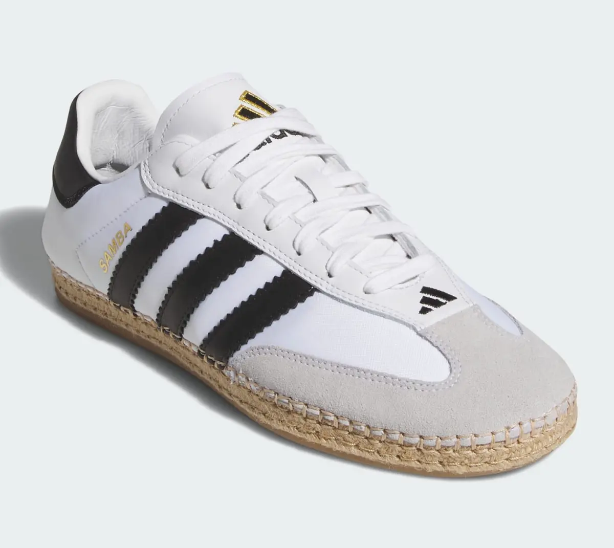 第一印象を決定づけるのはホワイトを基調に漆黒のスリーストライプを配置した鮮烈なカラーコントラストです。清潔感のある白地が広がりその上に走るブラックのラインが全体のフォルムを引き締めています。サイドに配された「SAMBA」のゴールドロゴは歴史あるモデルの血統を示すさりげないアクセントです。