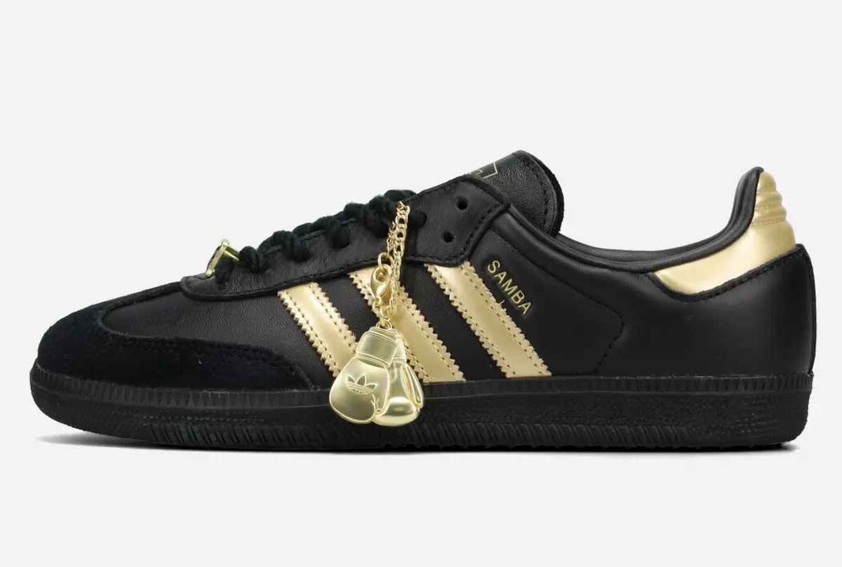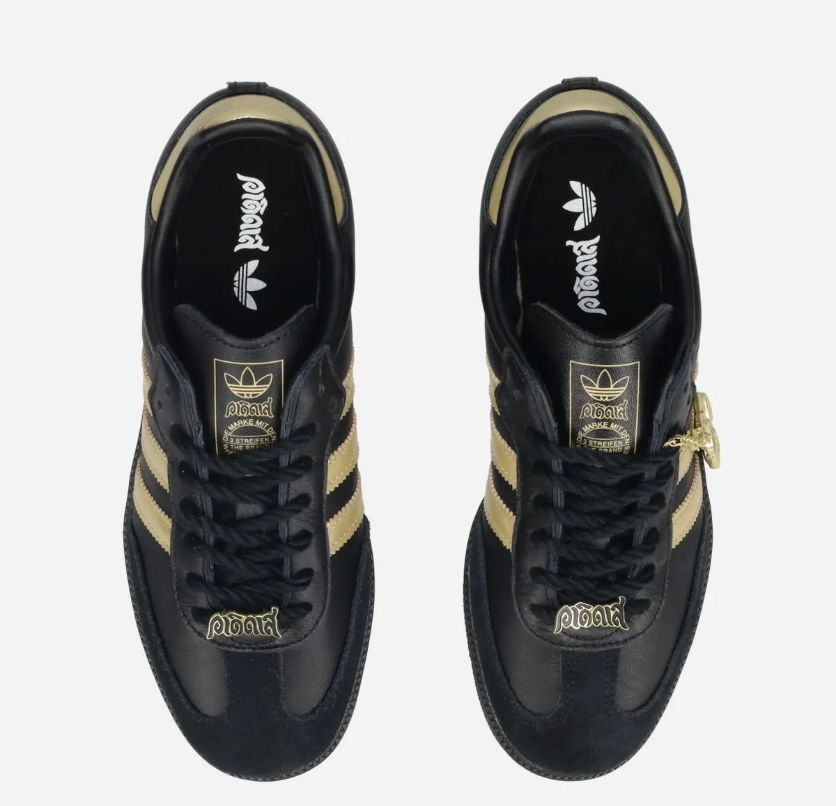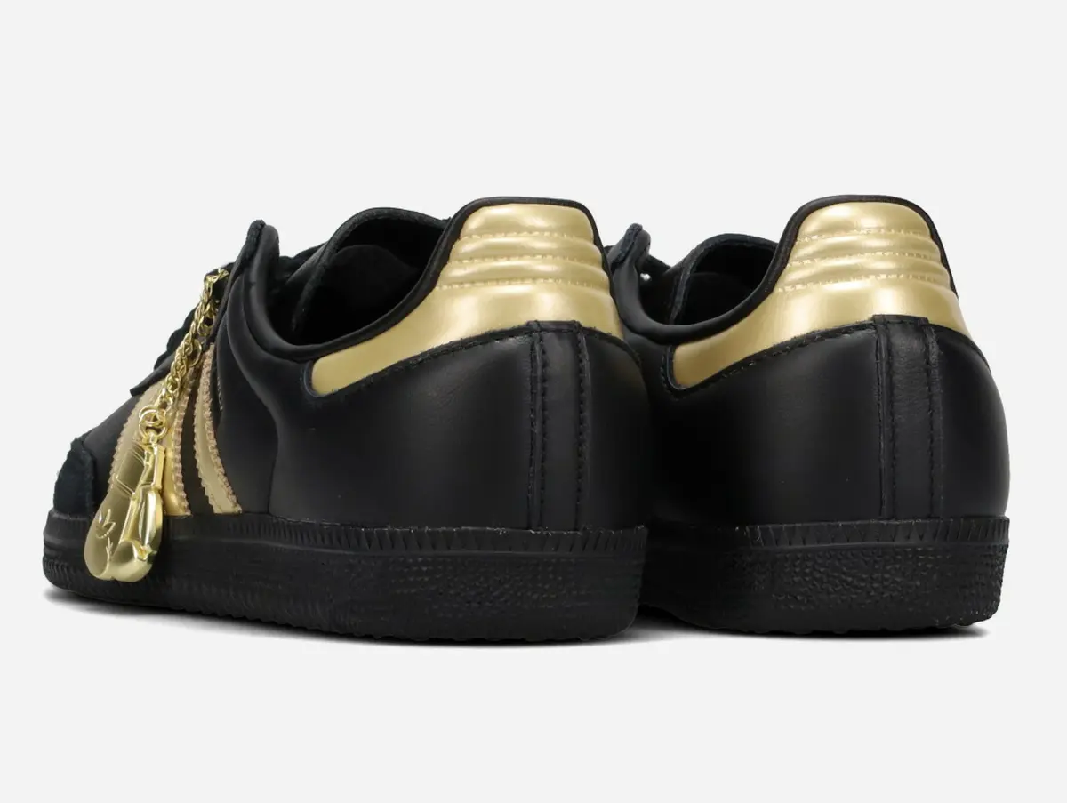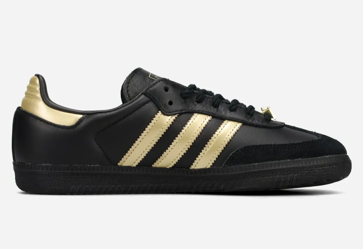 ディテールにも特別感が漂います。シューレースには存在感あるゴールドのチャームが揺れ装飾的でありながらラグジュアリーな雰囲気を演出します。トップビューから覗くタンにはトレフォイルロゴとブランドネームが堂々と配置されサンバのヘリテージと現代的解釈を巧みに融合させています。細部に至るまで精緻に作り込まれ、視覚的に楽しめる仕掛けが随所に散りばめられています。