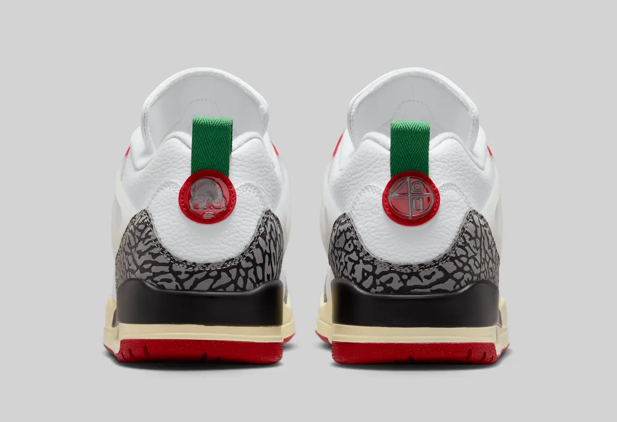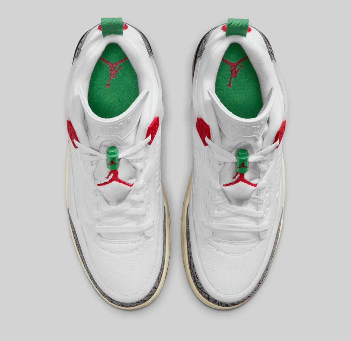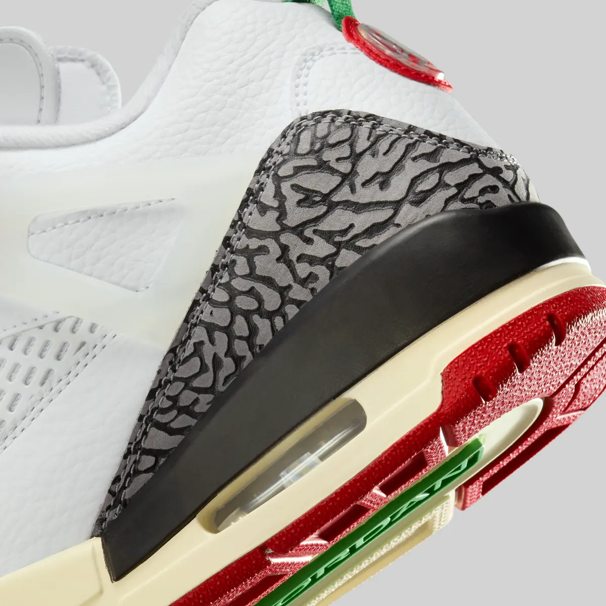 ホワイトを基調としたボディに、ブラック、セイル、バーシティレッド、そしてアクセントのグリーンが絶妙に絡み合う「JORDAN スパイジーク LOW SE」は、視線を奪う存在感を放っています。