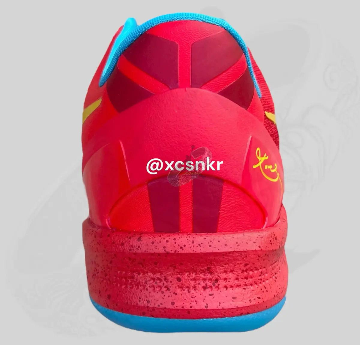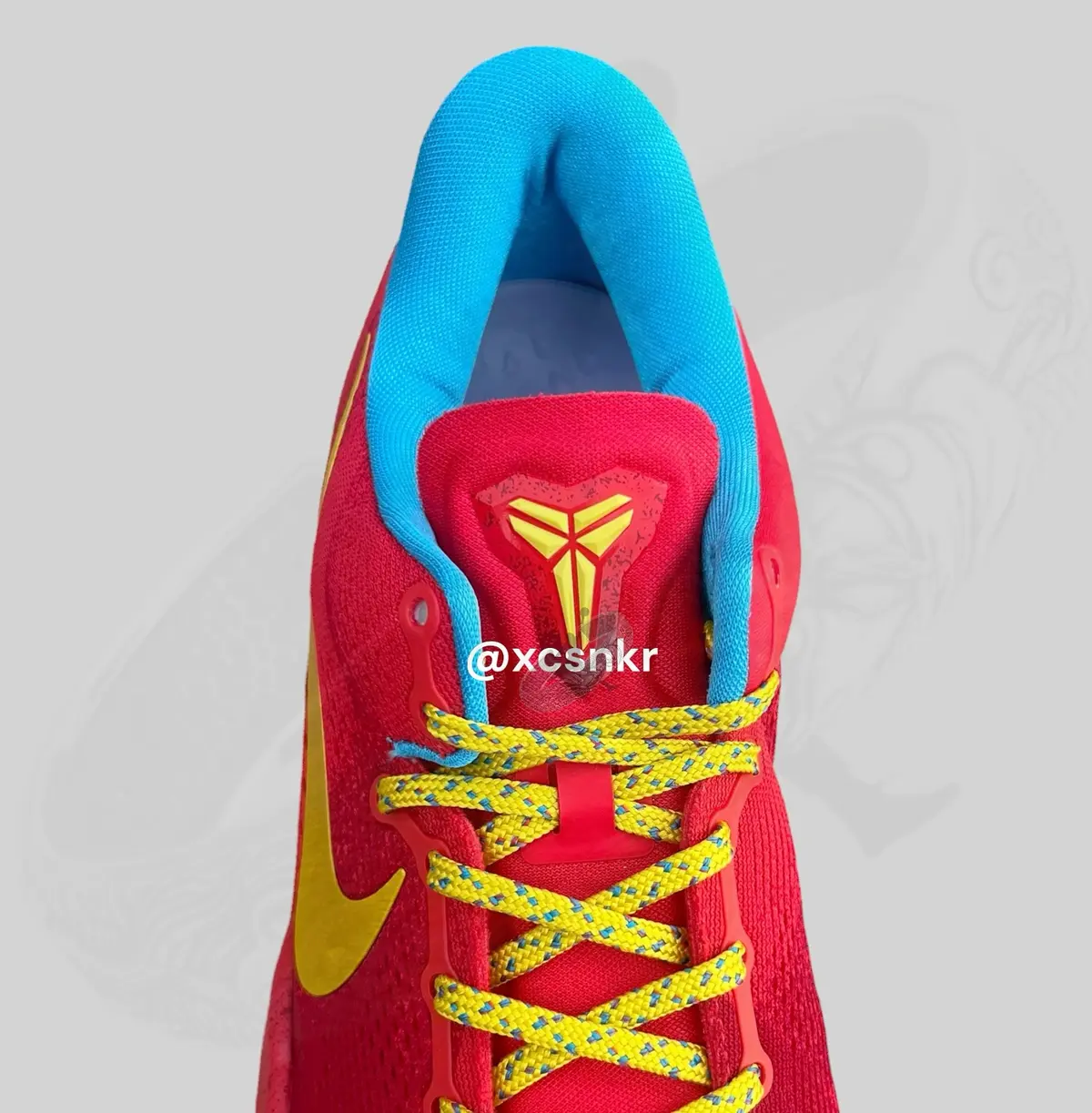 鮮烈な赤と黄色の組み合わせを支えるのがライニングやアウトソールに配されたブルーです。このブルーは清涼感を持ち込み強い色彩のコントラストにバランスを与えています。さらにヒールにはゴールド調のコービー・ブライアントのサインが刻まれ特別モデルであることを誇らしげに主張しています。シュータン中央にはアイコニックなシンボルロゴがイエローで映えシグネチャーシリーズとしての存在感を強調しています。