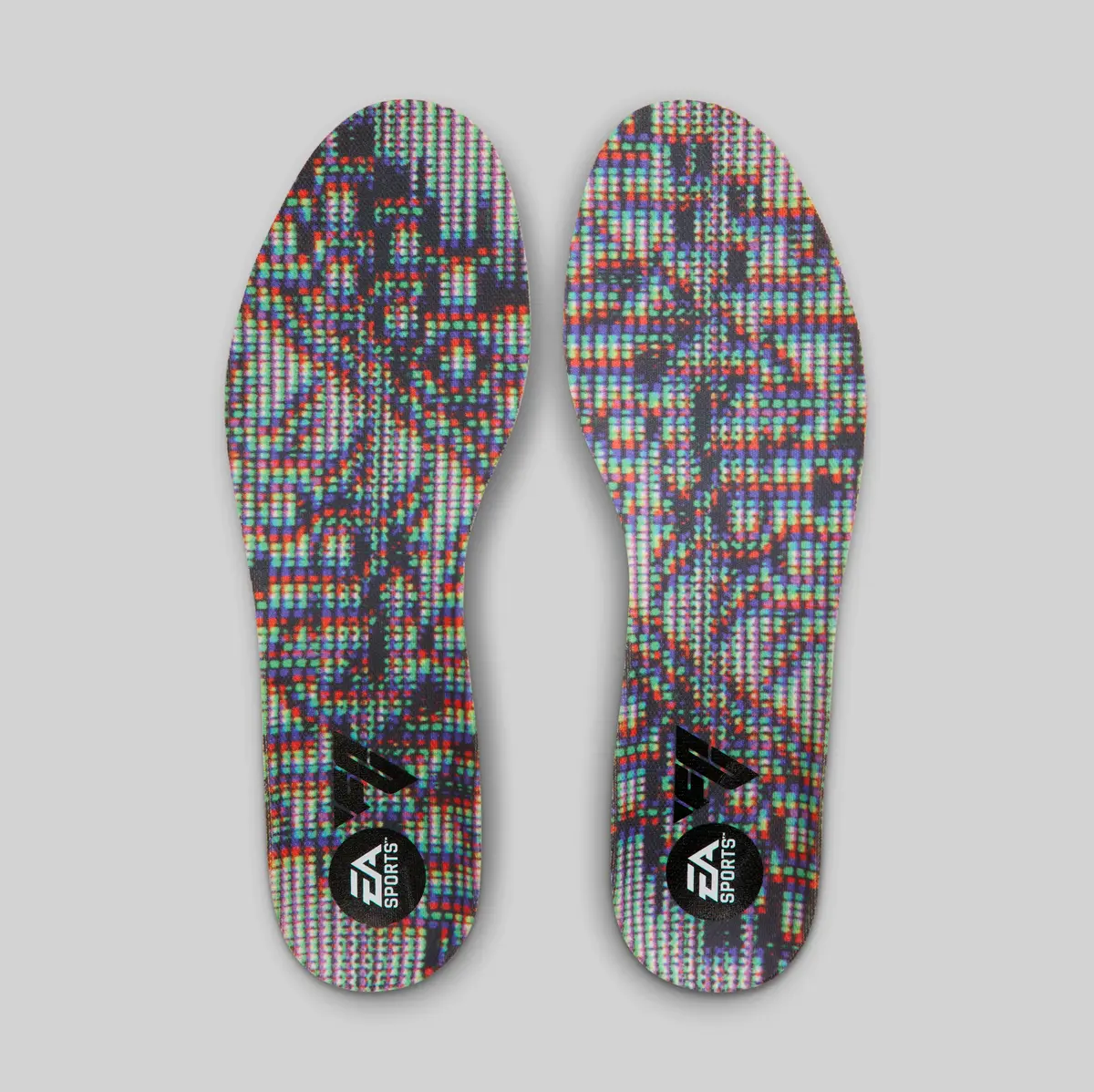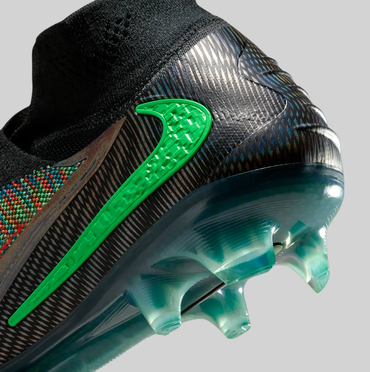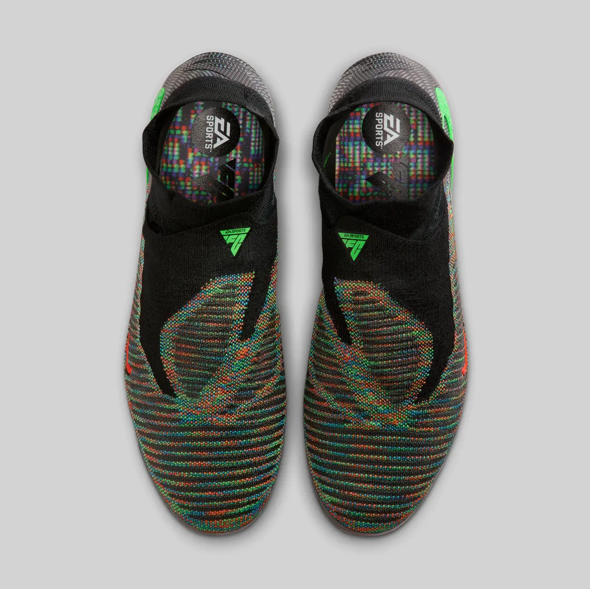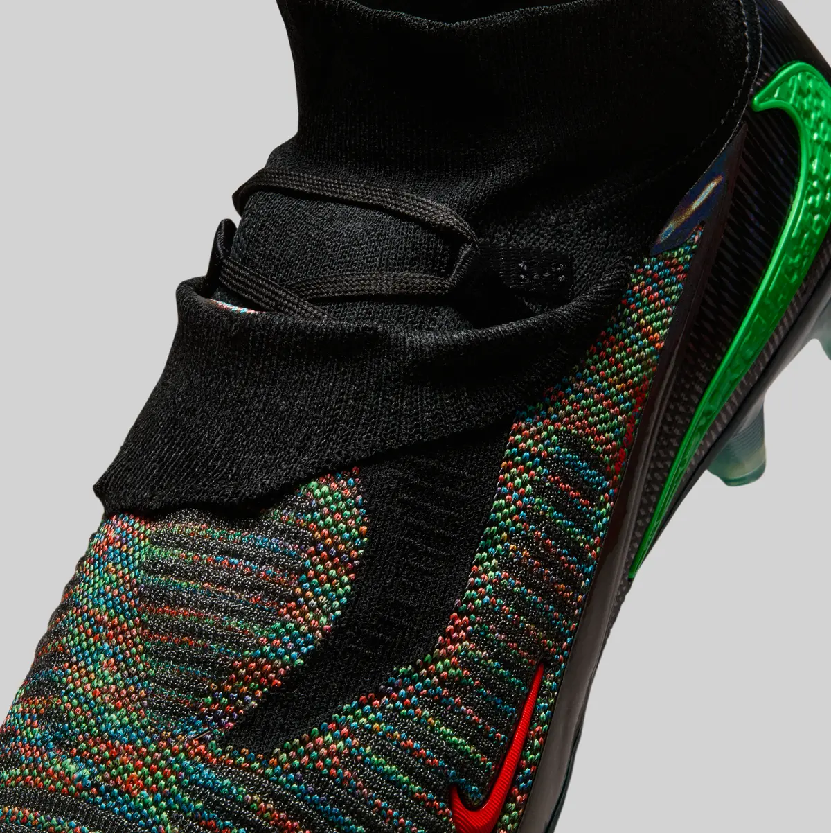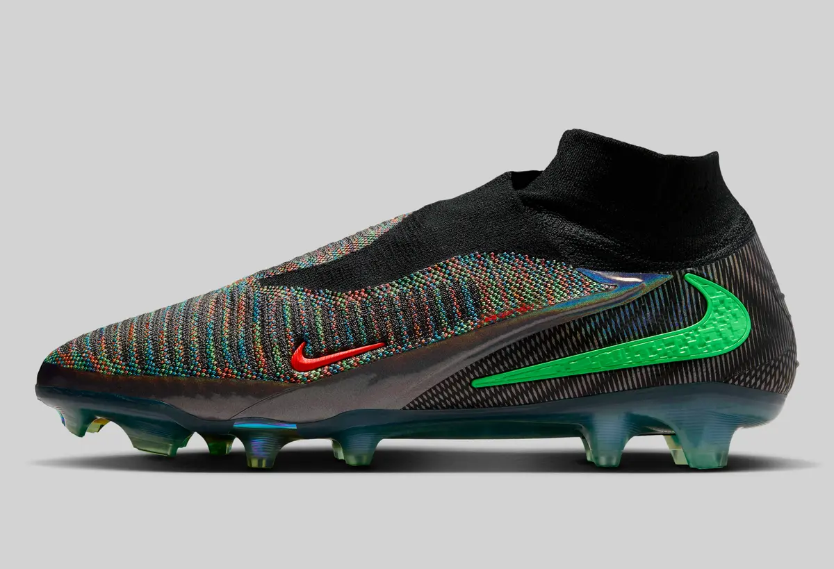 アッパー全体には編み込まれたように複雑で多彩な色合いが広がっています。ブラックを基調としつつも無数の色彩が織り交ぜられたパターンは、まるでデジタルの世界を切り取ったかのような視覚効果を生み出しています。グリーンのアクセントはシューズの外側に大胆に配置され鋭いラインを描くスウッシュがエネルギッシュな印象を強調します。さらに、内側にはレッドのディテールが差し込まれ見る角度によって表情が変わるように計算されたデザインです。
