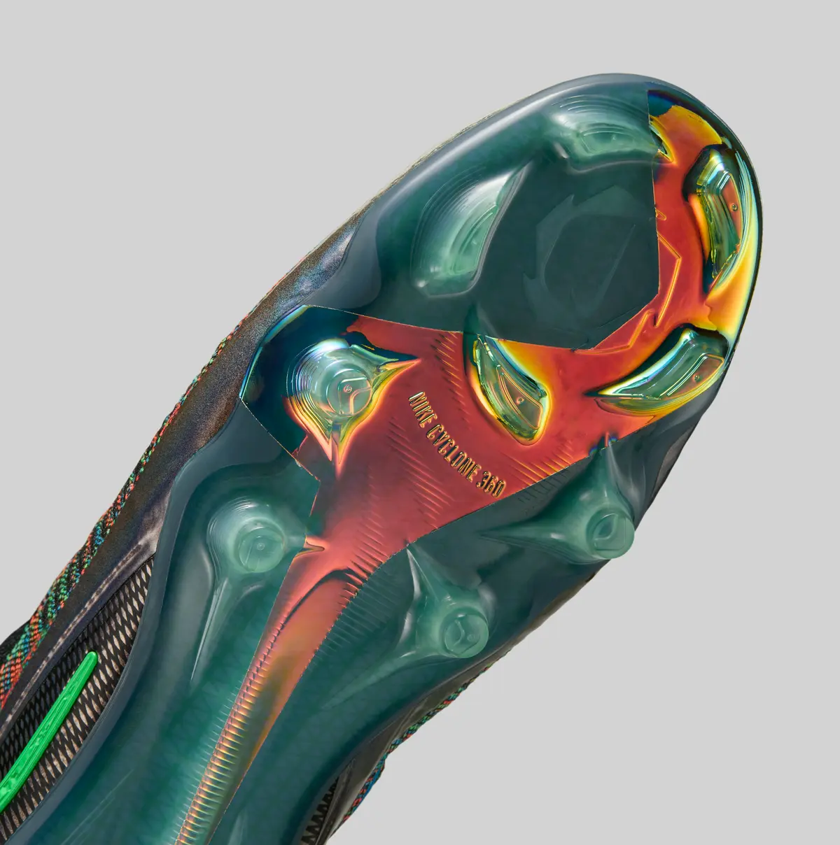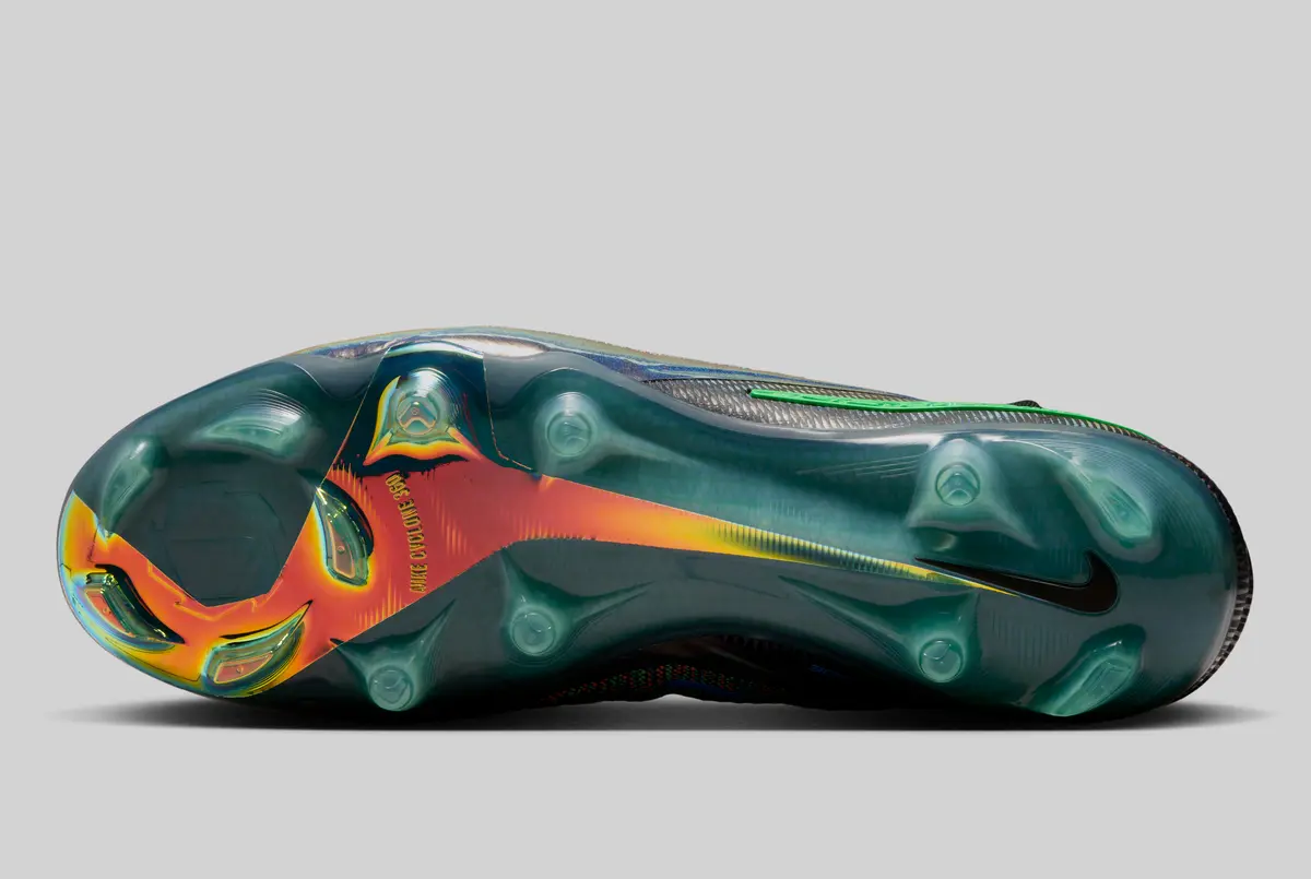 スパイクに目を向けるとアウトソールは鮮やかなブルーとオレンジを組み合わせたカラーリングで仕上げられておりアッパーの多彩な色調と呼応するように鮮烈な印象を与えます。特に前足部にはCyclone 360トラクションパターンが施されプレイヤーの素早いターンや踏み込みを力強くサポートします。後方から眺めるとヒール部には立体的なデザインが映えシューズ全体のシルエットをさらに引き締めています。