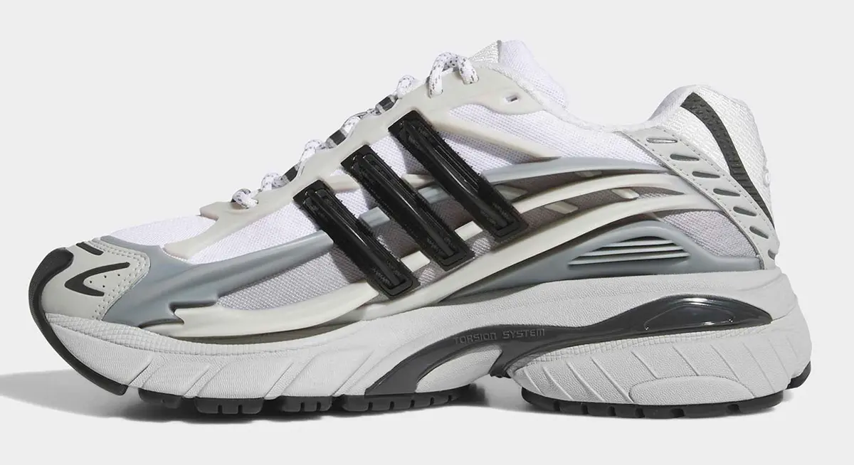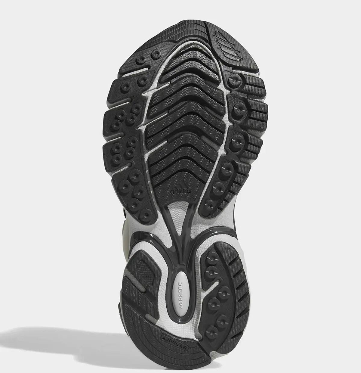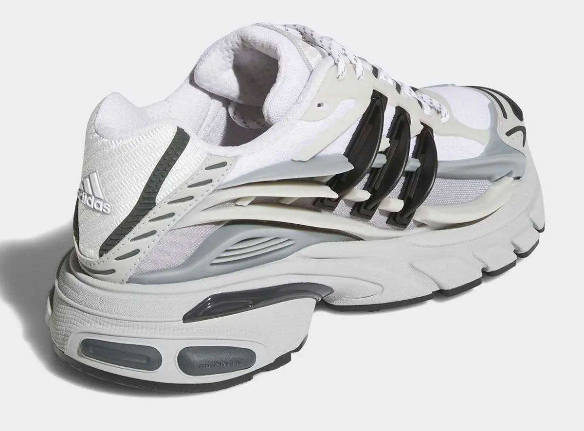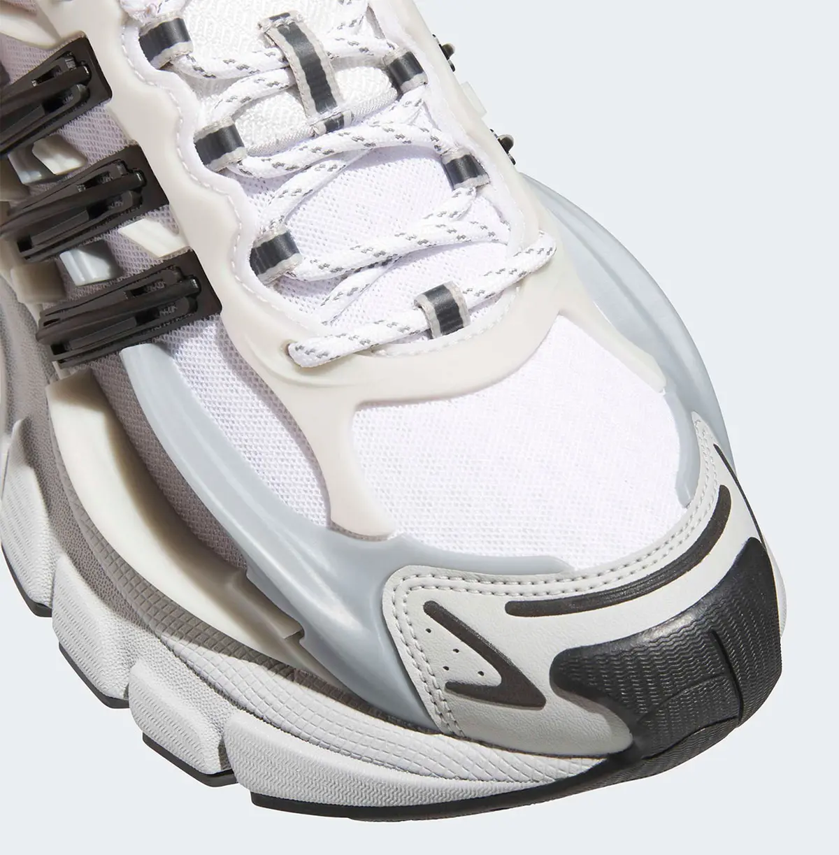 全体はクリーンなホワイトを基盤にグレーの濃淡が巧みにレイヤードされています。淡いシルバーグレーのパネルがアッパーを縁取り、ブラックのスリーストライプスがその上で鮮やかに浮かび上がることで陰影と立体感が強調されています。まるで光沢の異なる金属が組み合わされたような質感は控えめながらも確かな存在感を放っています。