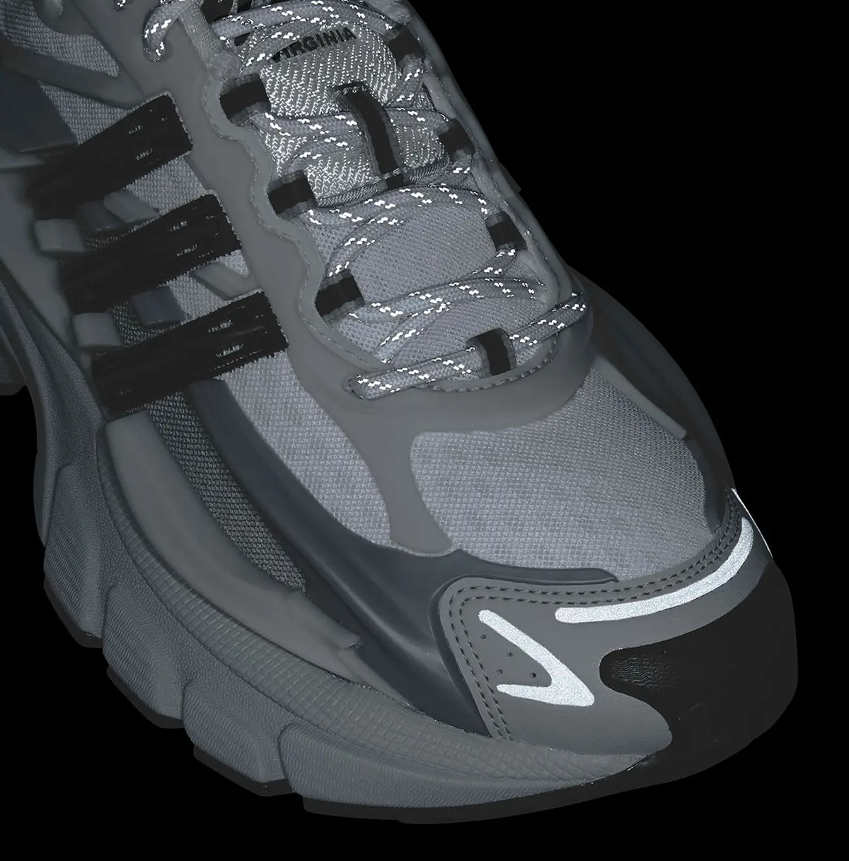 素材構成にも注目です。軽量メッシュがベースとなり通気性と柔軟性を確保しながら、樹脂状のエクソスケルトンパーツが外側を覆うことで、動きを支えるフレームとして機能しています。シュータンからミッドソールにかけて続く曲線は波の流れを想起させボリュームあるソールが全体を支えることで彫刻的な佇まいを生み出しています。さらに暗所で反射するリフレクティブディテールが仕込まれており夜のシーンでは未来的な輝きを纏います。