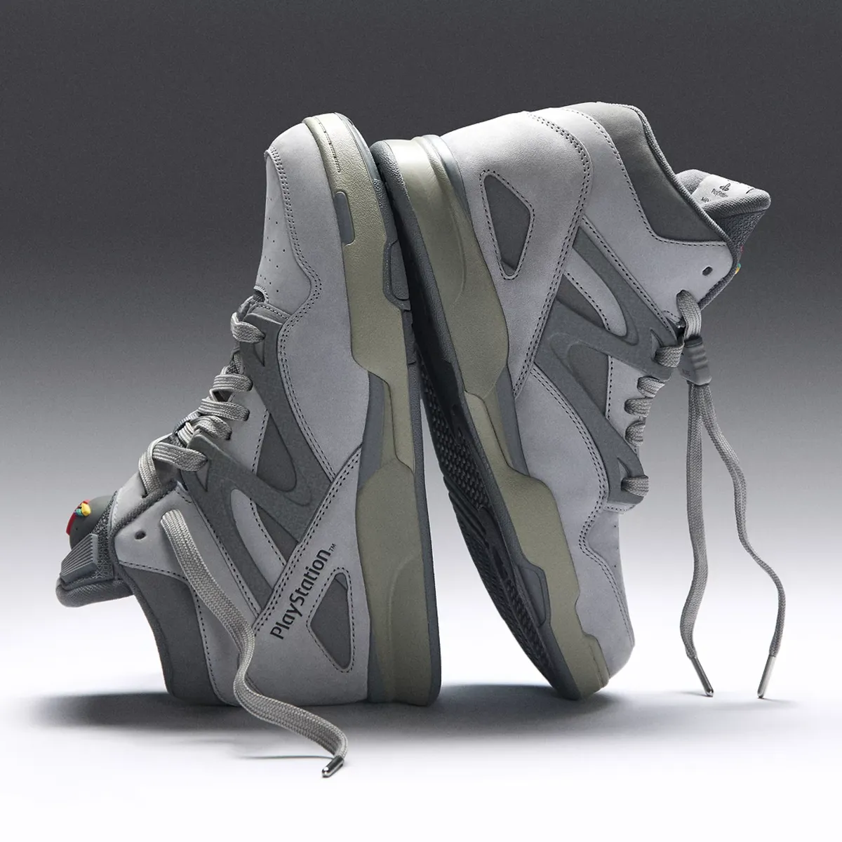 かかとにはPlayStationのフルカラーロゴが刺繍されグレーのボディに鮮やかなアクセントを与えています。アウトソールはダークグレーで引き締められ安定感のある印象を強調しつつミッドソールのソフトグレーと美しいコントラストを描いています。クラシカルなバスケットシューズらしいボリューム感を持ちながらも細部のデザインが洗練されておりレトロなシルエットと現代的なエッジが共存しています。