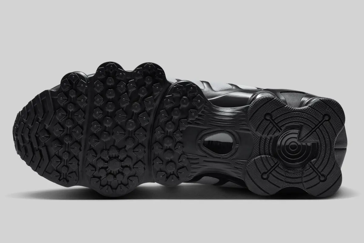 ソールに目を向けるとこのモデル最大の特徴である「ショックス クッショニング」が圧倒的な存在感を示しています。ブラックのカラムが連続的に配置されバネのような反発力を想起させるデザインは視覚的にも力強さを印象づけます。アウトソールの複雑なパターンは実用性とデザイン性を兼ね備えており歩行時の安定感とグリップ力を支えています。上から見下ろすとシンメトリーな構造と緻密なラインが織りなす美しさが際立ち単なるシューズ以上の工芸的価値を感じさせます。