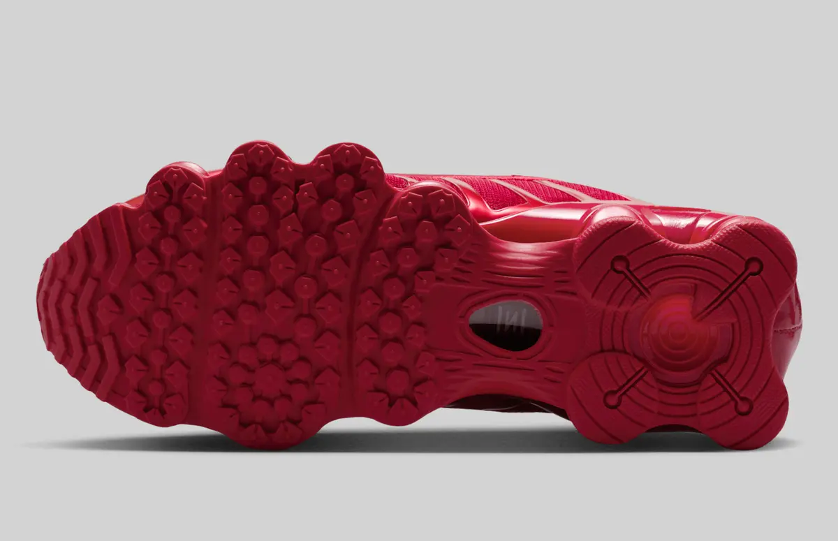 深みのあるレッドを基調にしなが、艶やかな光沢とマットな質感を巧みに組み合わせ視覚に強烈なインパクトを与えます。メッシュ素材が持つ軽やかな透け感にフルTPUケージが複雑なラインを描きまるで精密な工業デザインのような立体感を演出しています。シルエットは低く構えつつもソールの大胆な構造によって独特のボリューム感が強調され、足元に未来的な表情を添えます。