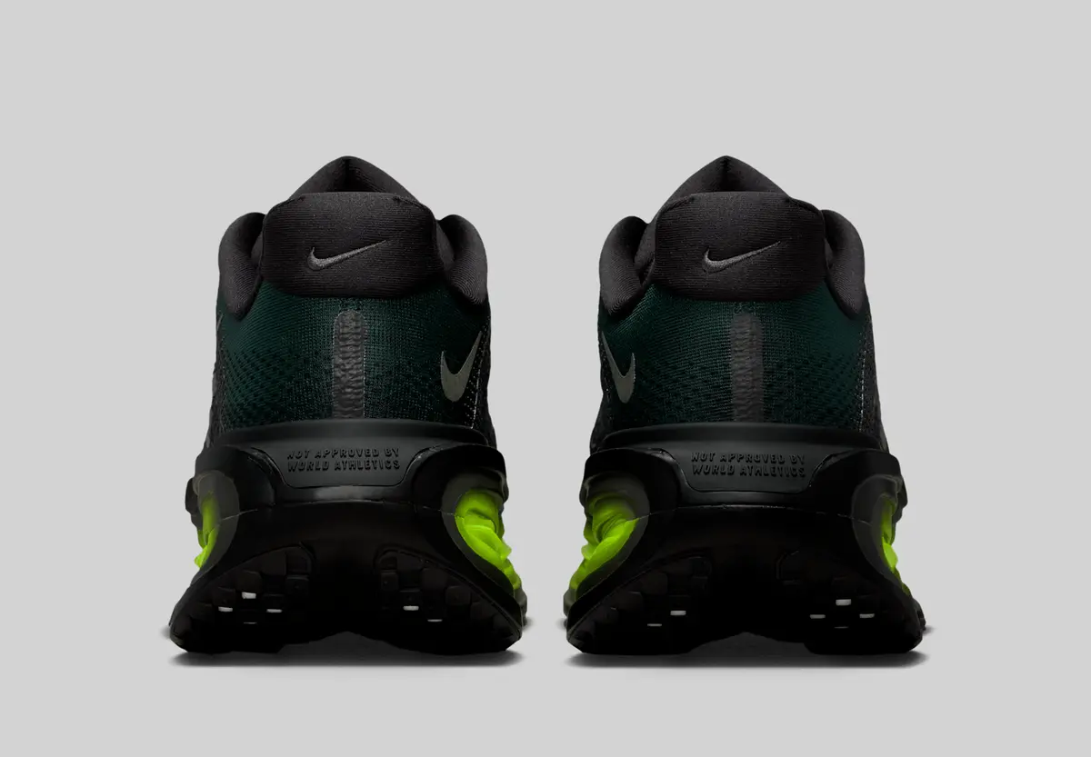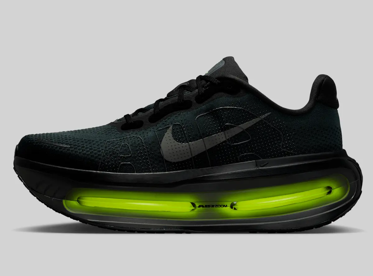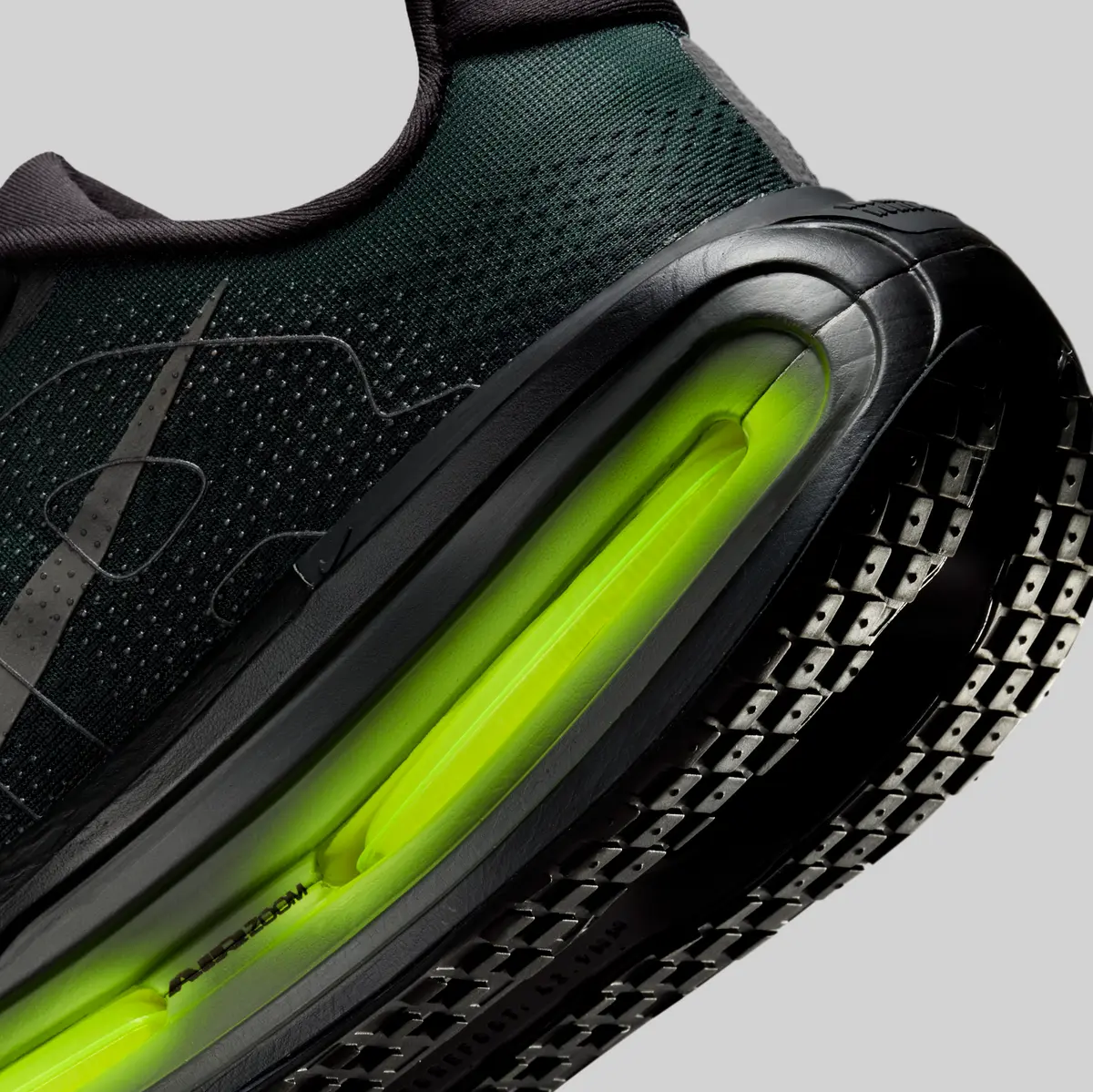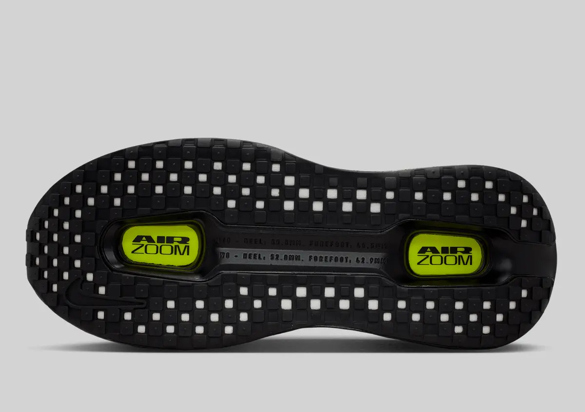 そしてこのモデルの最大のハイライトはソールユニットに搭載されたボルトカラーのアクセントです。蛍光グリーンに近い鮮烈な色合いがブラックのボディの中で鮮やかに浮かび上がりスニーカー全体に未来的な雰囲気をもたらしています。光の移ろいに合わせて輝度が変化するような発色で視覚的なインパクトを与えつつも決して過剰ではないバランスを保っています。アウトソールには耐久性を考慮したラバーを使用し細かなパターンがグリップ力を強調しています。上から眺めたときシルエットは滑らかで横から見ればボリューム感のあるエアユニットが力強さを主張しあらゆる角度から眺めても異なる魅力を発見できる造形になっています。