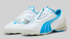 リフレクティブな素材使いとホワイトの流線的なラインが織りなすデザインは機能性と美しさの調和を象徴しています。スタイルとしてはミニマルでありながらディテールの一つひとつに意志を感じさせる構築的なデザインです。サイドから見た時の立ち上がるようなソールのカーブヒール部分のボリュームつま先に向かって引き締まるプロポーションがスピードと軽やかさを視覚的に伝えています。