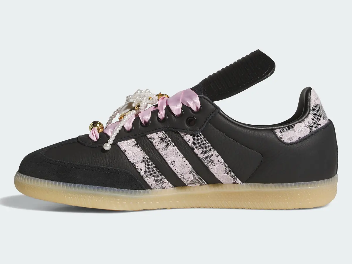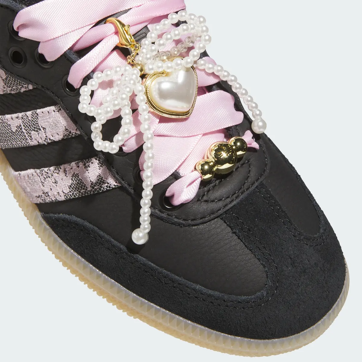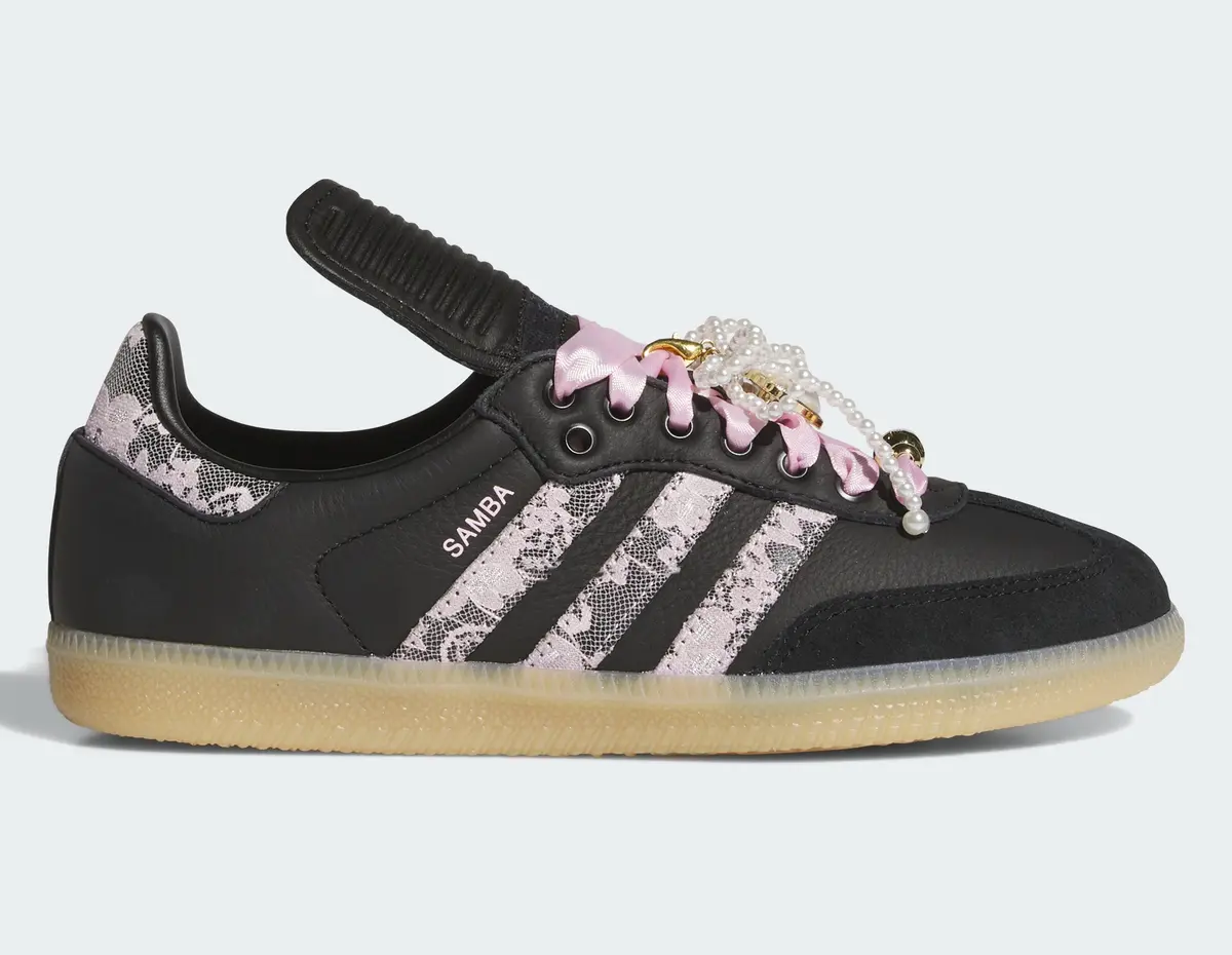 さらに目を引くのはピンクのシューレースに重ねられた装飾です。ゴールドのチャームやパール調のアクセントが組み合わされストリートの空気感に華やかなエレガンスを加えています。足元を覆うレザーとスエードの切り替えも巧みに計算されており光の反射や角度の変化によって表情が微妙に変わります。アウトソールはナチュラルなガムソール仕様で柔らかさを感じさせるカラーが上品な黒とのコントラストを際立たせクラシカルな輪郭を保ちながらモダンな印象を添えています。
