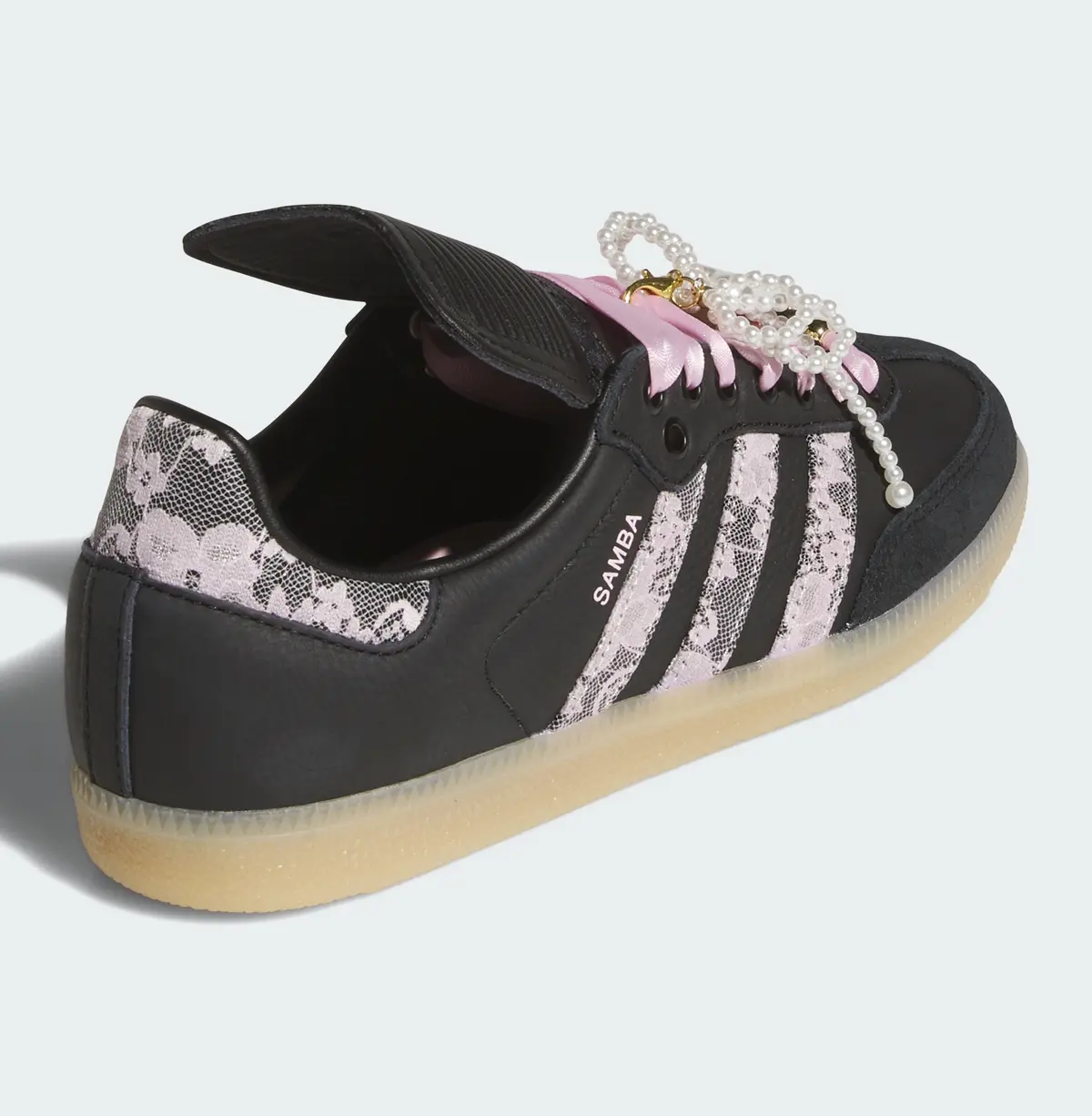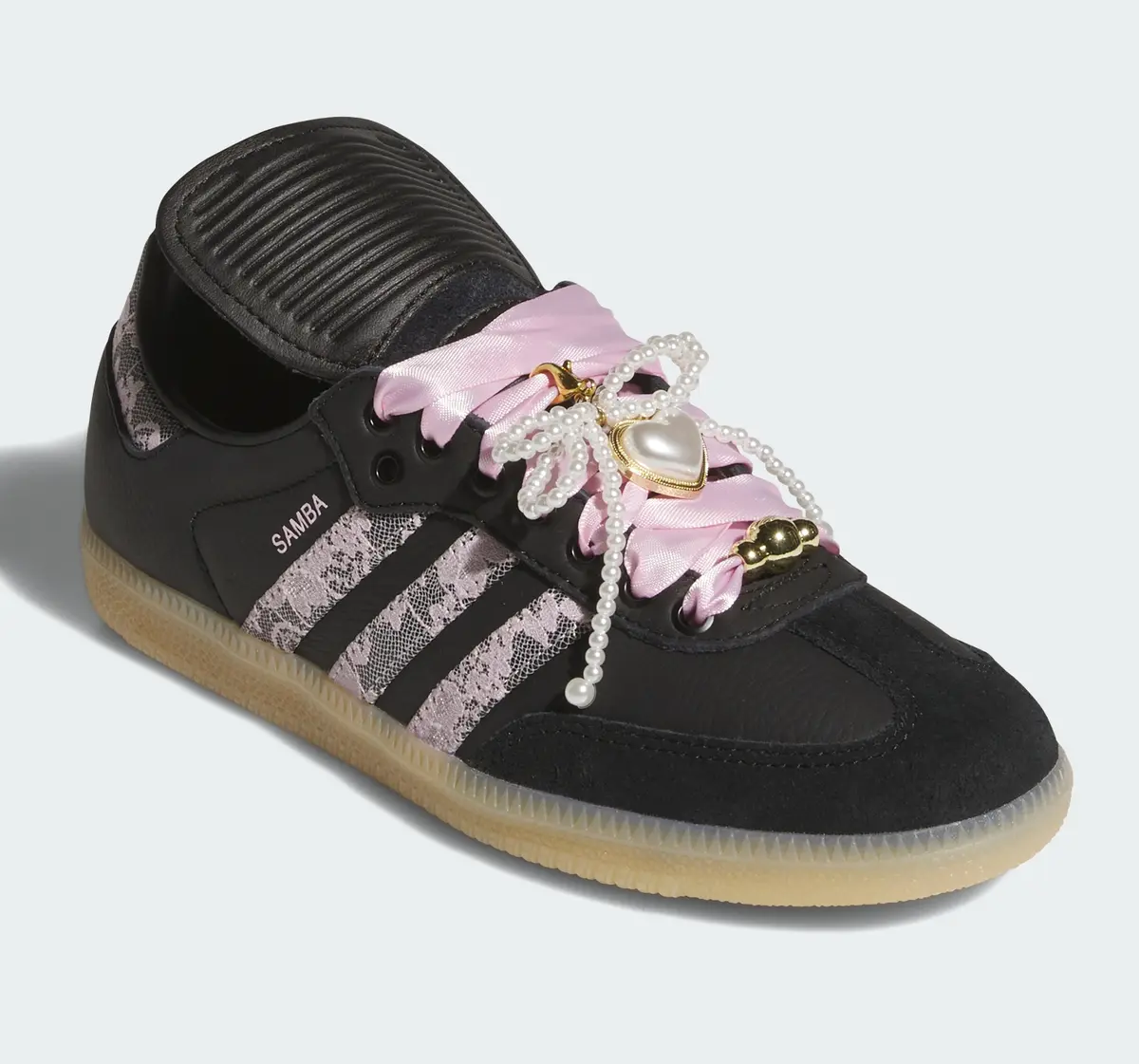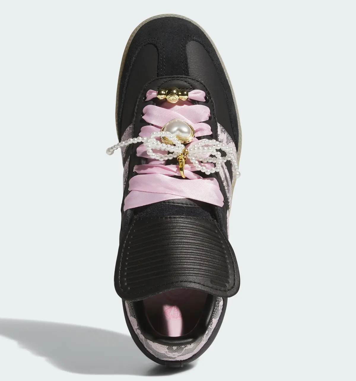 さらに目を引くのはピンクのシューレースに重ねられた装飾です。ゴールドのチャームやパール調のアクセントが組み合わされストリートの空気感に華やかなエレガンスを加えています。足元を覆うレザーとスエードの切り替えも巧みに計算されており光の反射や角度の変化によって表情が微妙に変わります。アウトソールはナチュラルなガムソール仕様で柔らかさを感じさせるカラーが上品な黒とのコントラストを際立たせクラシカルな輪郭を保ちながらモダンな印象を添えています。