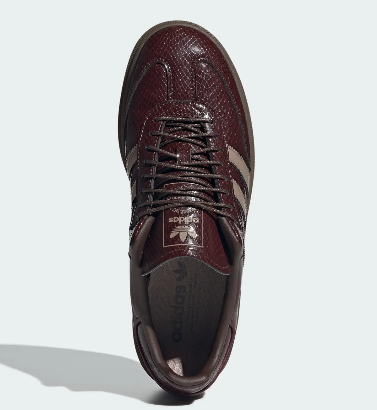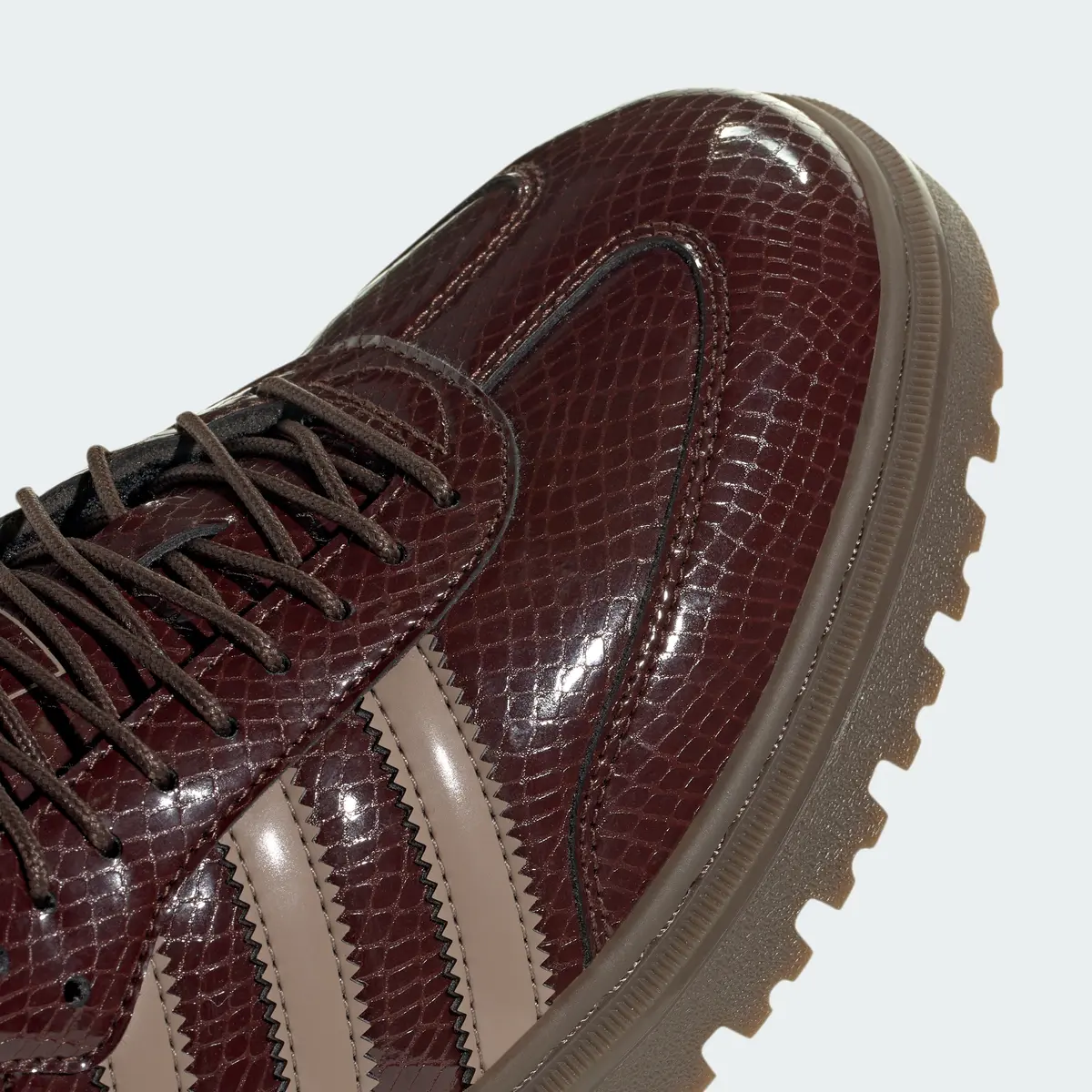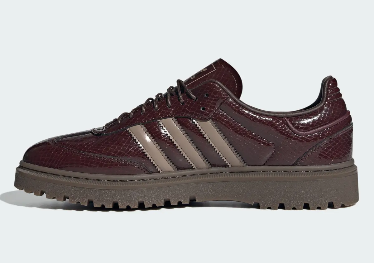 アッパーに使用されたスネークスキン調の型押しレザーがこのモデルの最大の特徴です。細やかなウロコのパターンが光を受けて艶やかに浮かび上がり角度によって陰影が変化します。深みのあるブラウンのトーンが素材の立体感を際立たせエレガントさと無骨さが同居した存在感を放ちます。サイドにあしらわれたチョーキーブラウンのスリーストライプスはレザーの濃淡と調和しながらもアイコニックな存在感を保ちヒールやトゥのステッチがクラシックな輪郭を際立たせています。