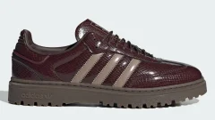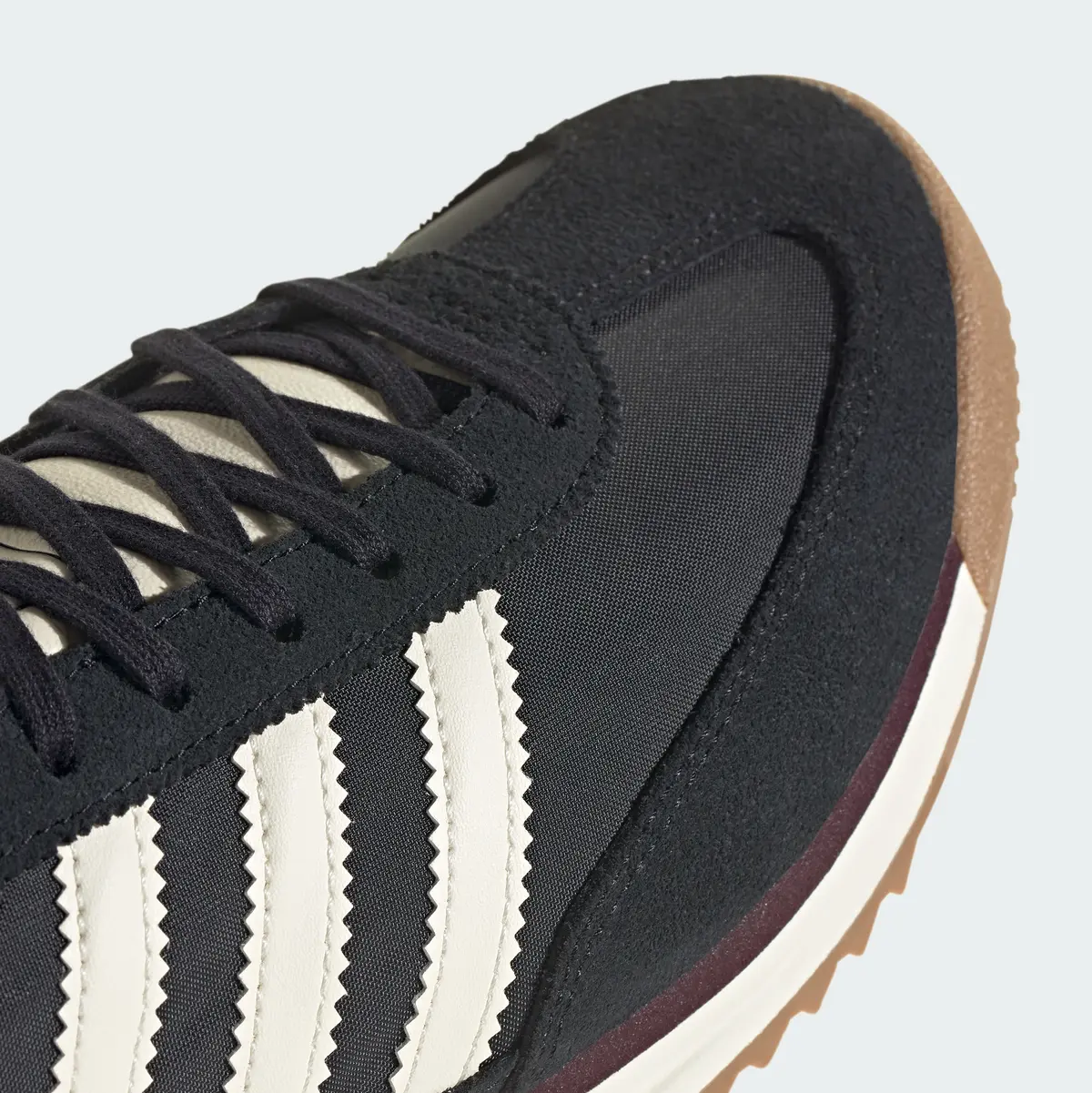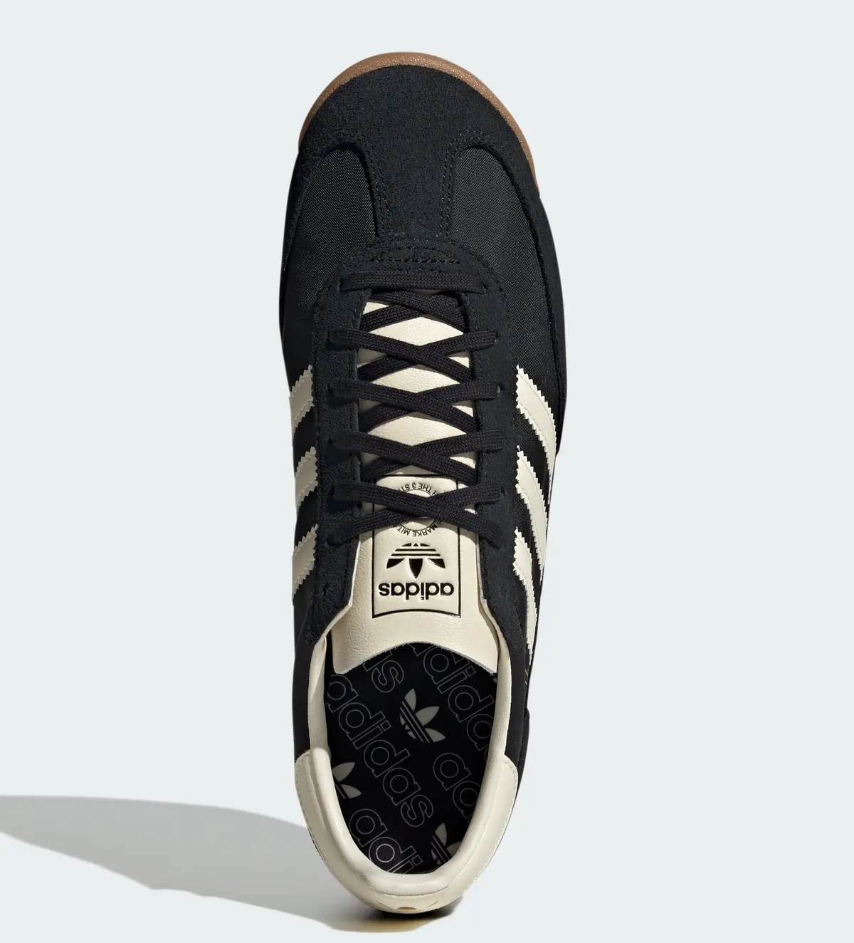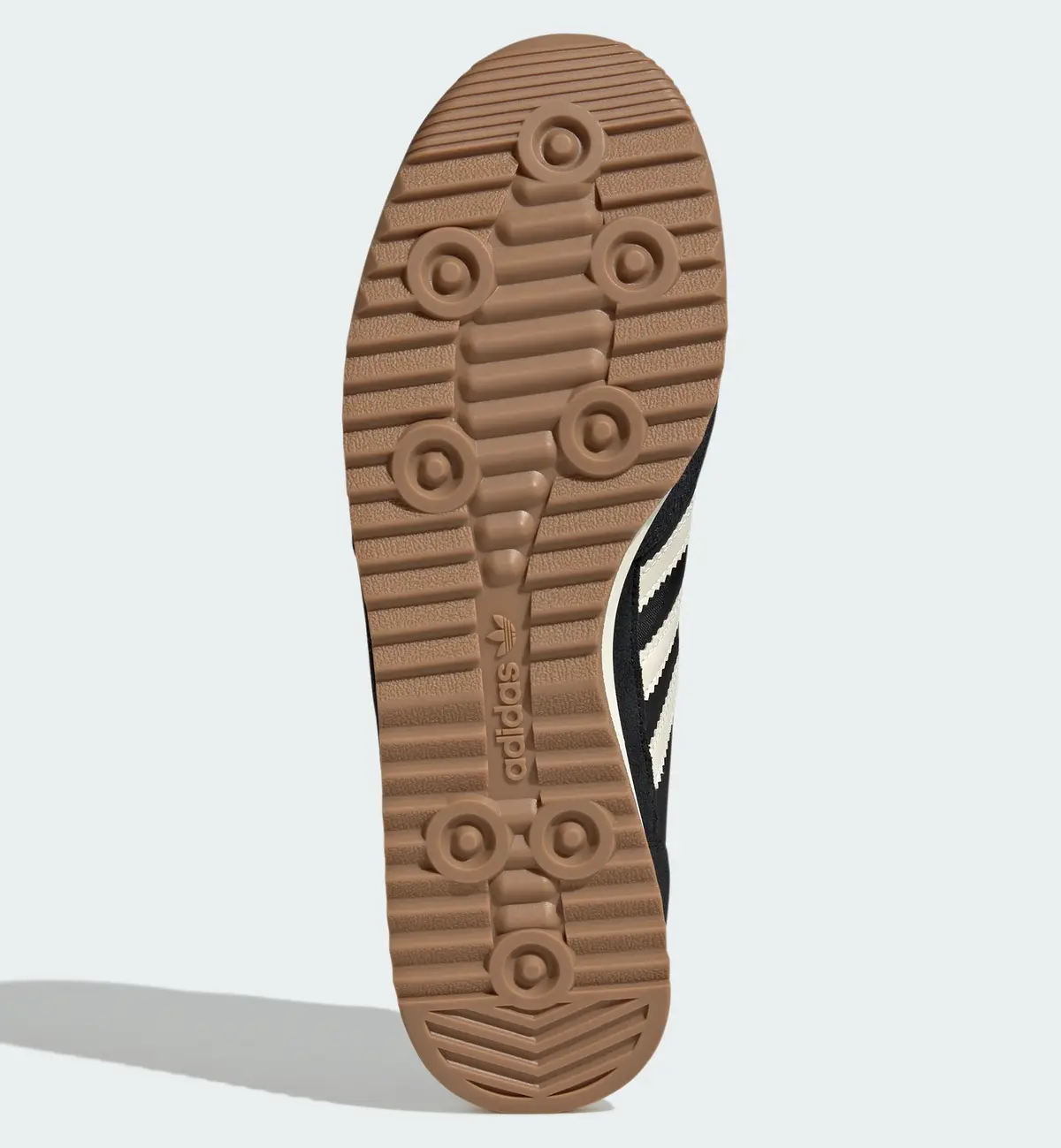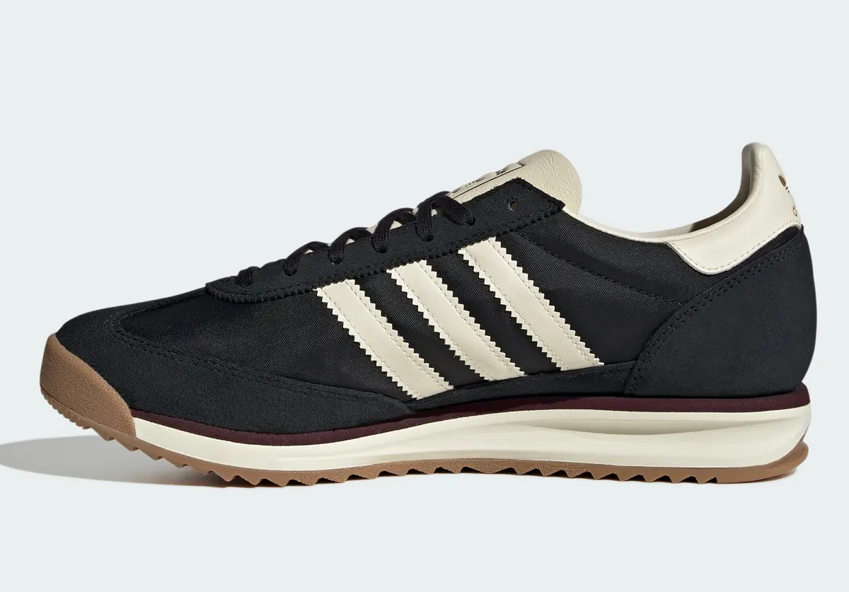 アッパーはナイロンのテキスタイルをベースに上質なスエードのオーバーレイを組み合わせた構造で柔らかくも張りのある質感が印象的です。深みのあるブラックを基調にクリームトーンのスリーストライプスとヒールタブを配したコントラストはヴィンテージ感と上品さを絶妙なバランスで両立させています。ソールに施されたブラウンのリップルアウトソールが全体を引き締め落ち着いた配色ながらも確かな存在感を演出しています。