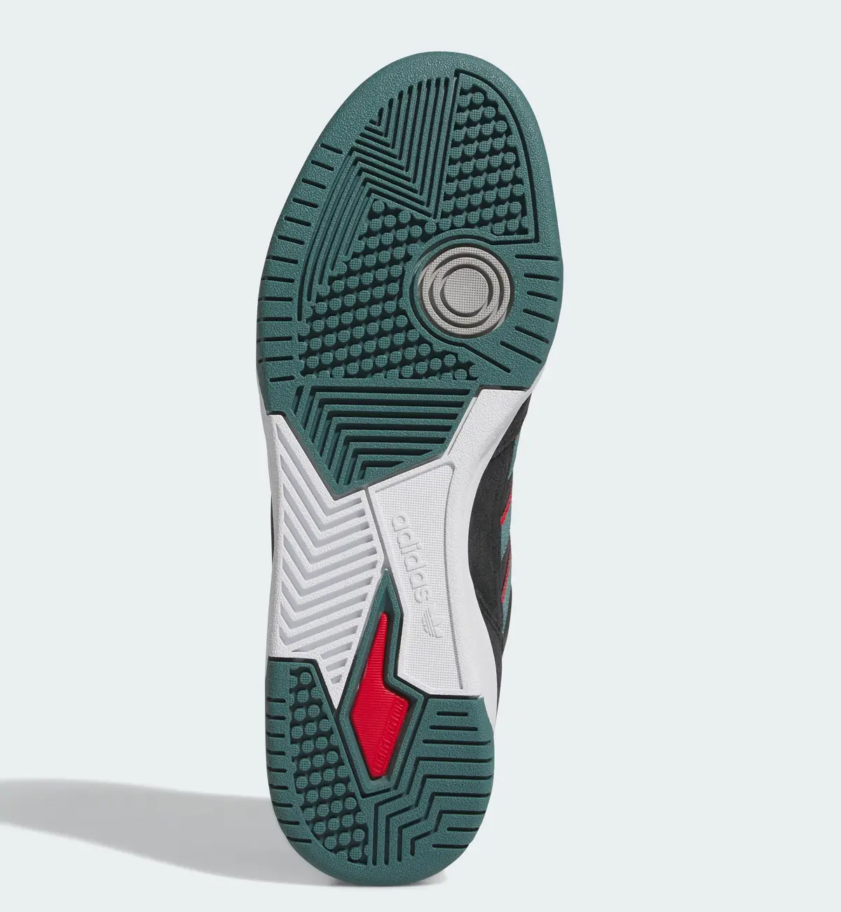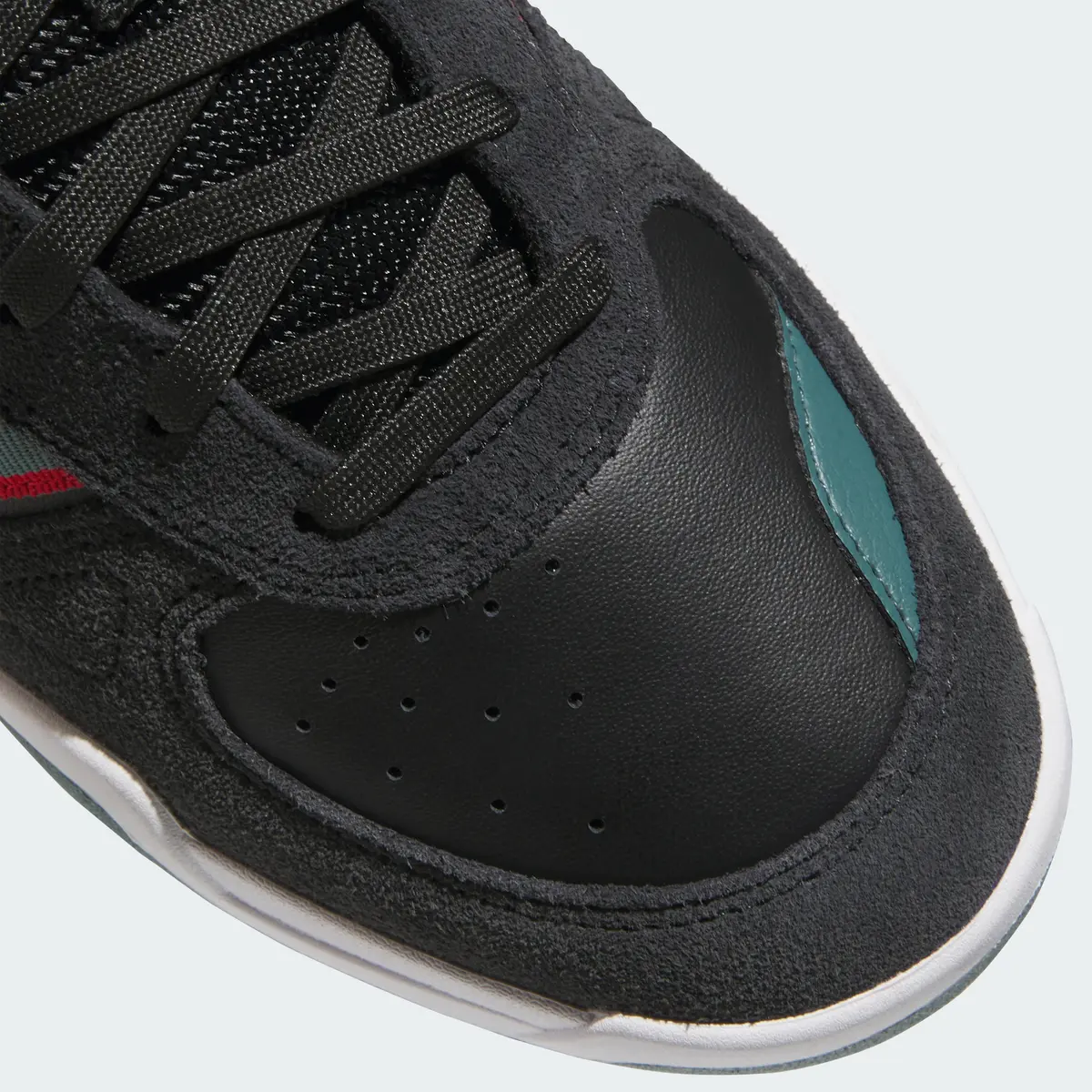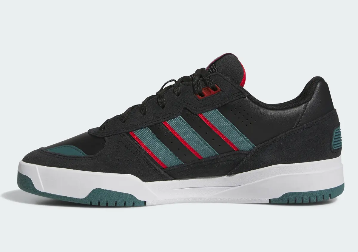 アッパー全体に配されたコアブラックのスエードはしっとりとした質感を持ちマットな陰影を描きながら強さと落ち着きを両立しています。その黒のキャンバスの上に走るスリーストライプスは深みのあるプレラブドティールと鮮烈なベタースカーレットを交互に重ね直線的な造形にリズムを与えています。ダークトーンの中に覗くこのコンビネーションは派手さに頼らずとも視覚的な躍動感を生み出しているのが特徴です。