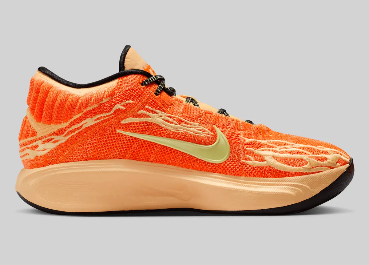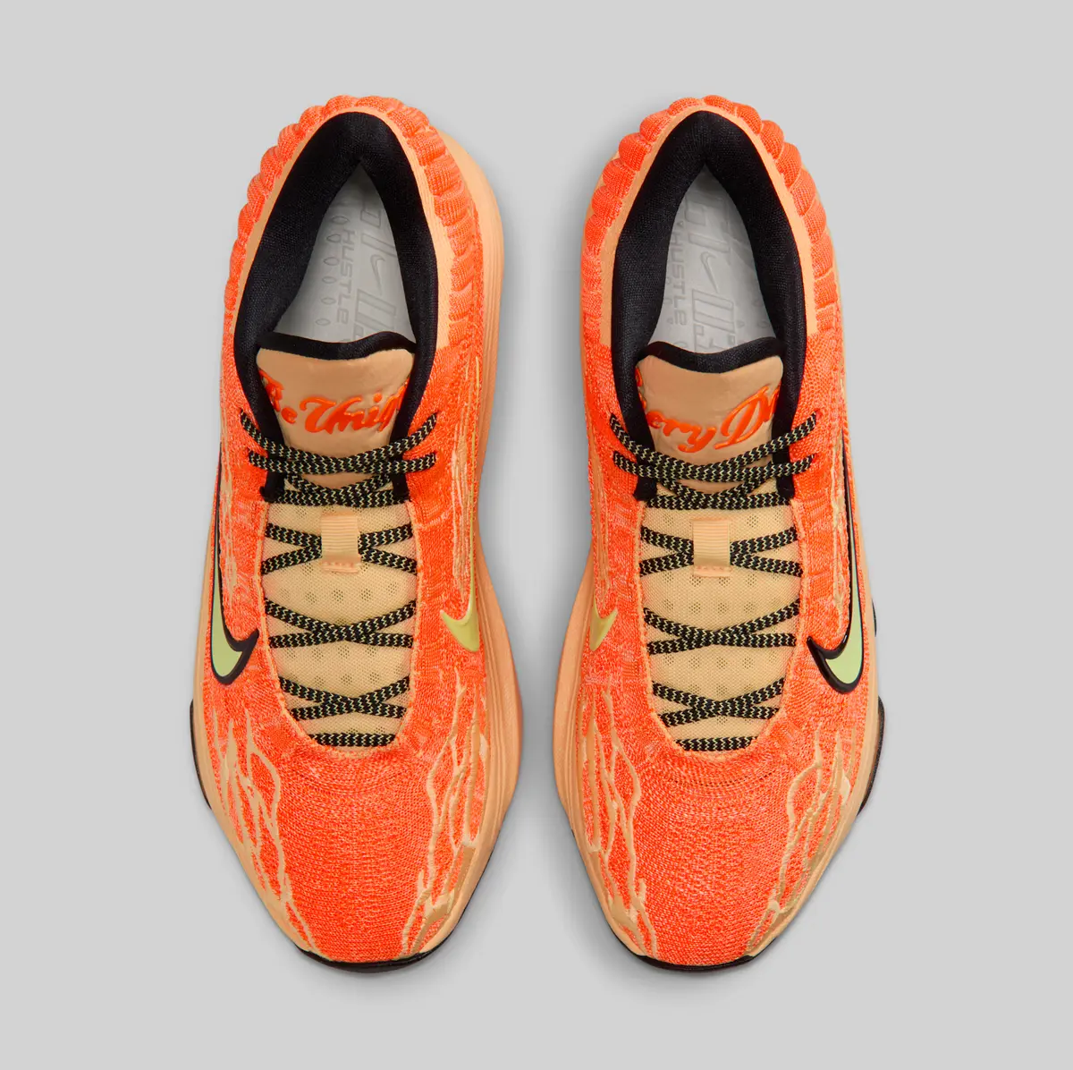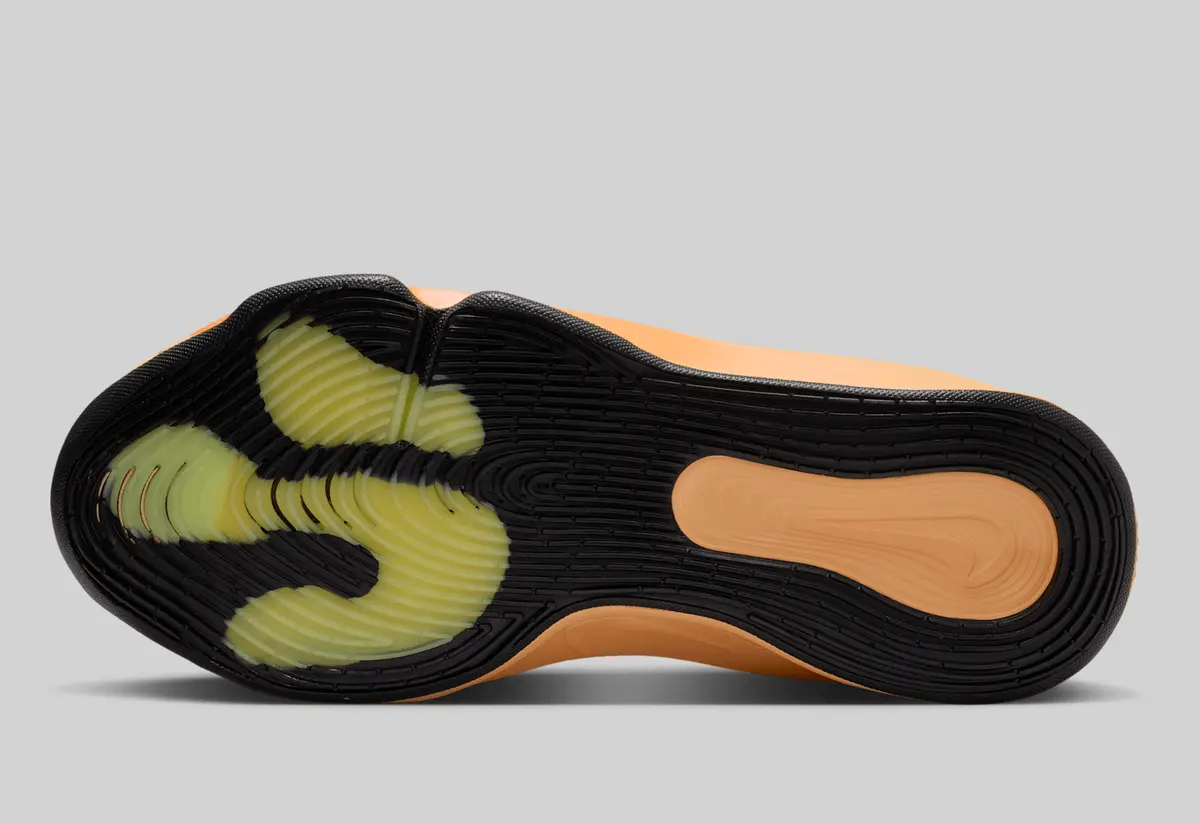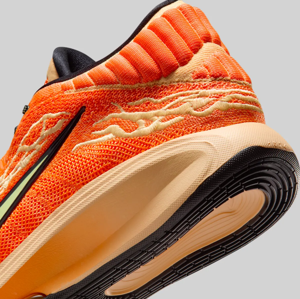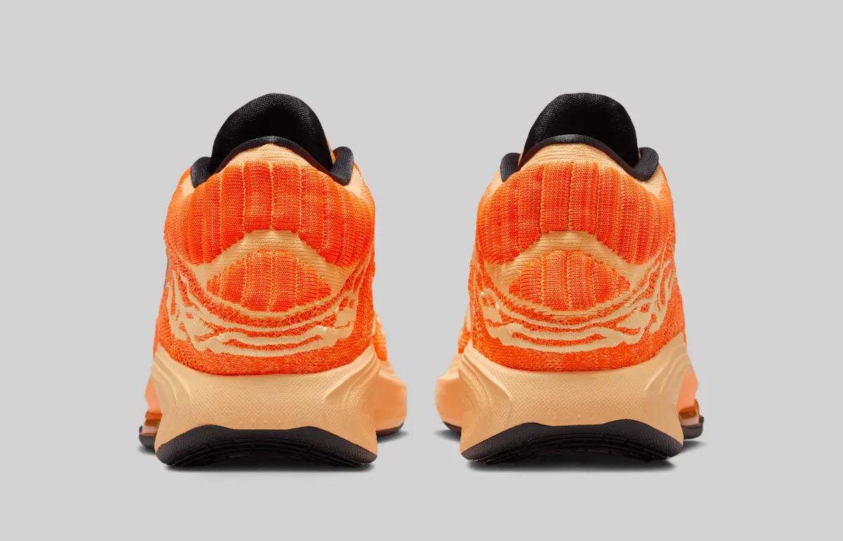秋の空気に溶け込むような光を放つ「ナイキ G.T. ハッスル 3 EP ハロウィン」はハロウィンのエネルギーをダイレクトに感じさせるカラーリングで登場します。アッパー全体を包むメロンティントとトータルオレンジのグラデーションはまるでジャック・オー・ランタンが放つ灯火のように鮮烈で見る角度によって表情が移り変わります。ニット素材特有の立体的な編み模様が流れる炎のような陰影を生み出し動くたびに足元が生き物のように躍動します。