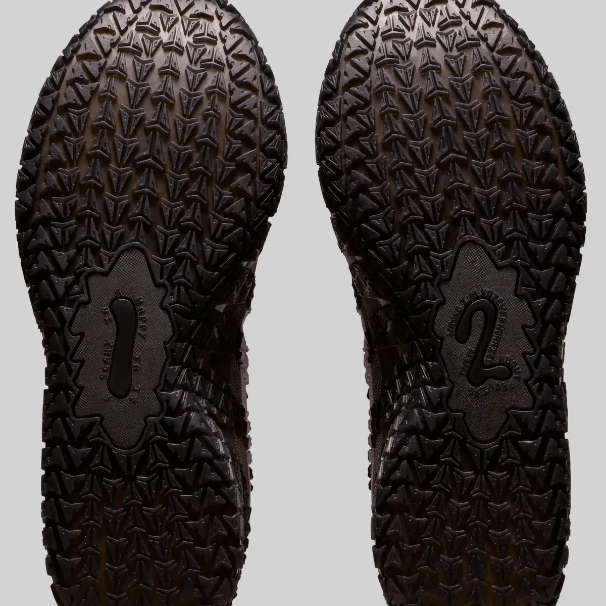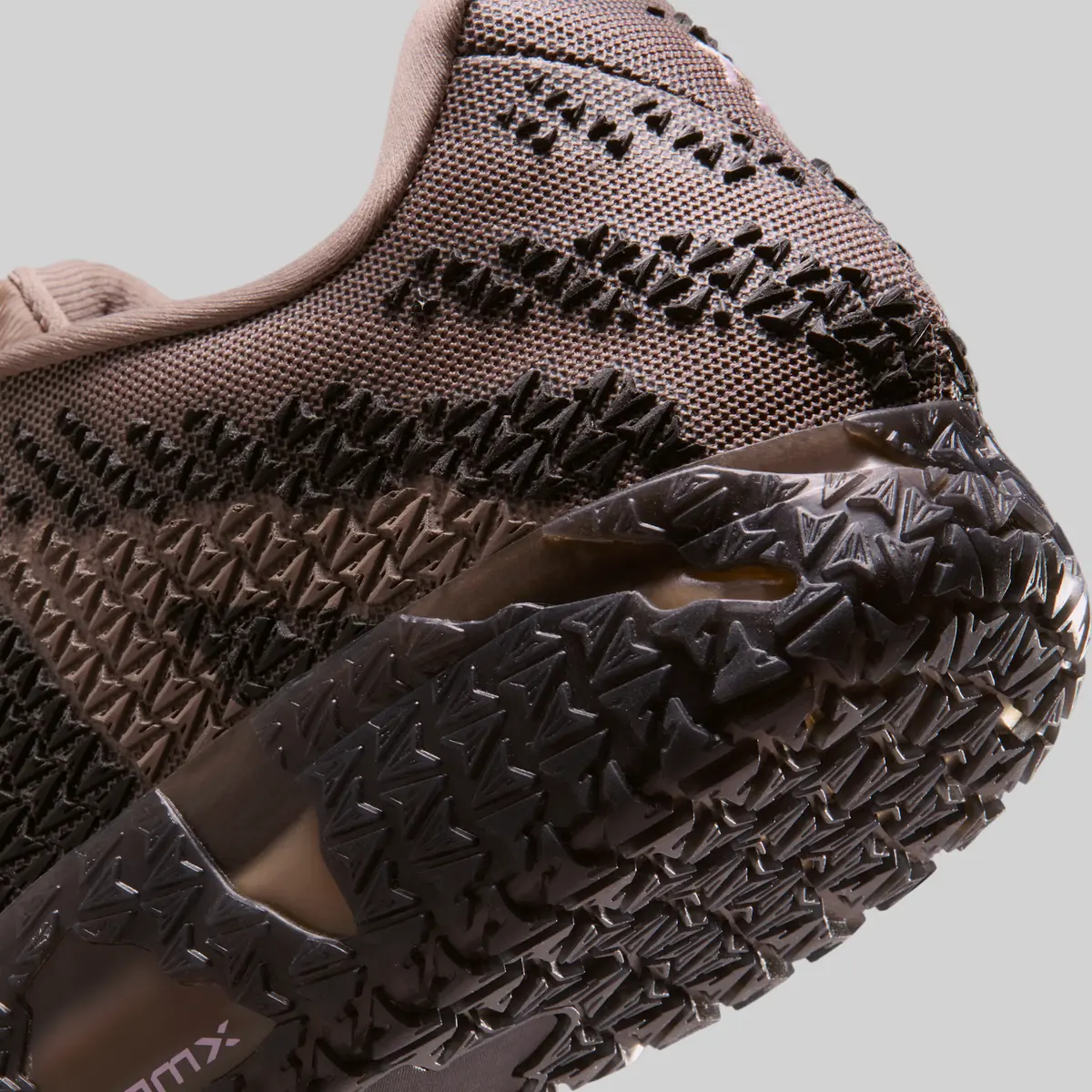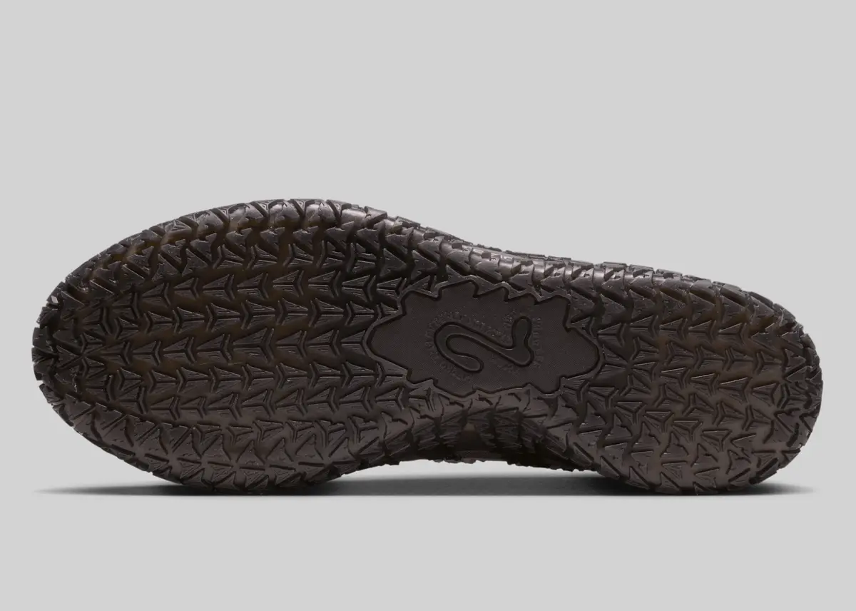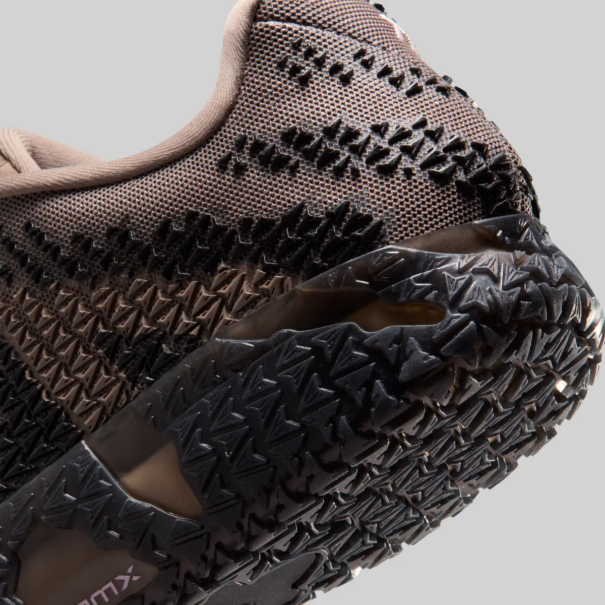 アッパーにはブラウンを基調としたメッシュ素材が用いられしなやかな質感の中に強度が緻密に組み込まれています。編み込まれたような立体感のある構造が角度によって陰影を生み複雑で深みのある印象を演出します。ブラックのパターンは爪痕のように力強く流れスピードを象徴するかのような動的な表情を与えています。そこに柔らかなピンクフォームのスウッシュが重なり鋭さの中に意外性のある優美さを加えています。この淡い差し色は全体の重厚さを中和し視線を自然に引き寄せるアクセントになっています。