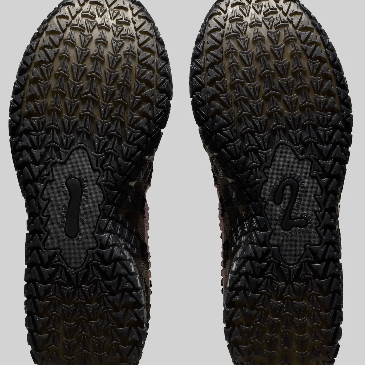 シュータンにはシグネチャーロゴが刺繍されプレイヤーの特別な存在感を強調しています。付属のシューレースはブラウンとオレンジの2種類が用意されスタイルに合わせて異なる表情を楽しめる仕様です。後方から眺めると立体的な編み込み模様が一層際立ち力強さと軽やかさを同時に感じさせます。
