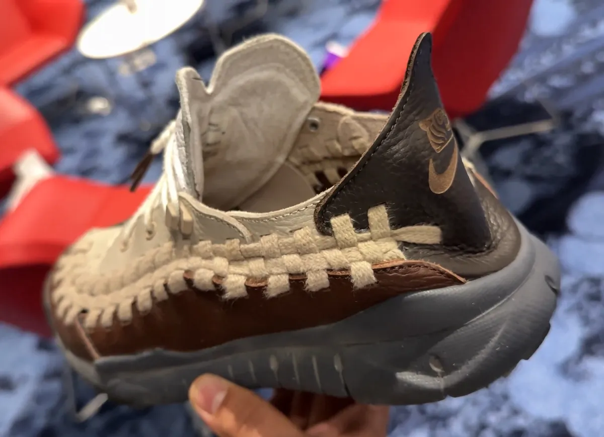 このモデルは“エア フットスケープ ウーブン/AIR FOOTSCAPE WOVEN”のDNAを受け継ぎながらもまるで日常と大地をつなぐような有機的な構造に生まれ変わっています。アッパーを覆うのは柔らかなベージュトーンのレザーと深みを帯びたブラウンのグレインレザー。両者の境界を縫い合わせるように起毛したスウェードのストリップが編み込まれ繊細な立体感と温度を宿しています。その編み込みは装飾であると同時に構造でもあり靴全体に生命のようなリズムを刻みます。