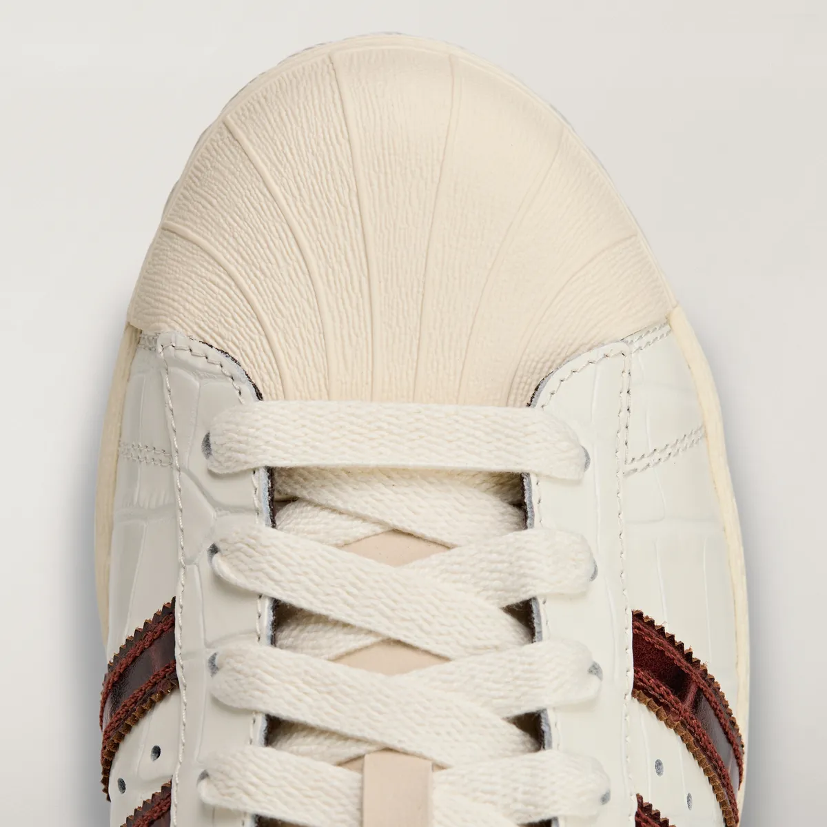 アッパーにはクロコ型押しのカウレザーが全面に使用され柔らかな光沢と凹凸が織りなす表情が印象的です。滑らかな一枚革とは異なる立体的で奥行きのある質感が履くたびに個性を強調します。スリーストライプスには深みのあるフォックスブラウンのトーンが配され型押しの模様と相まって豊かな陰影を生み出しています。ベースのワンダーホワイトとの対比が絶妙で控えめながら確かな主張を感じさせます。
